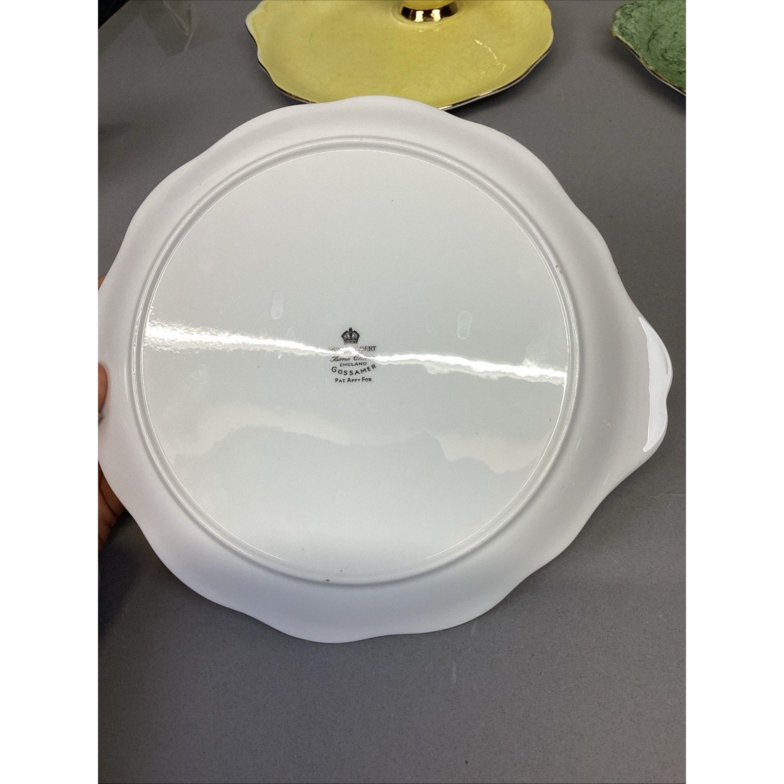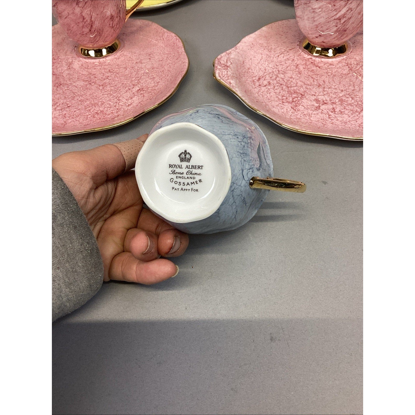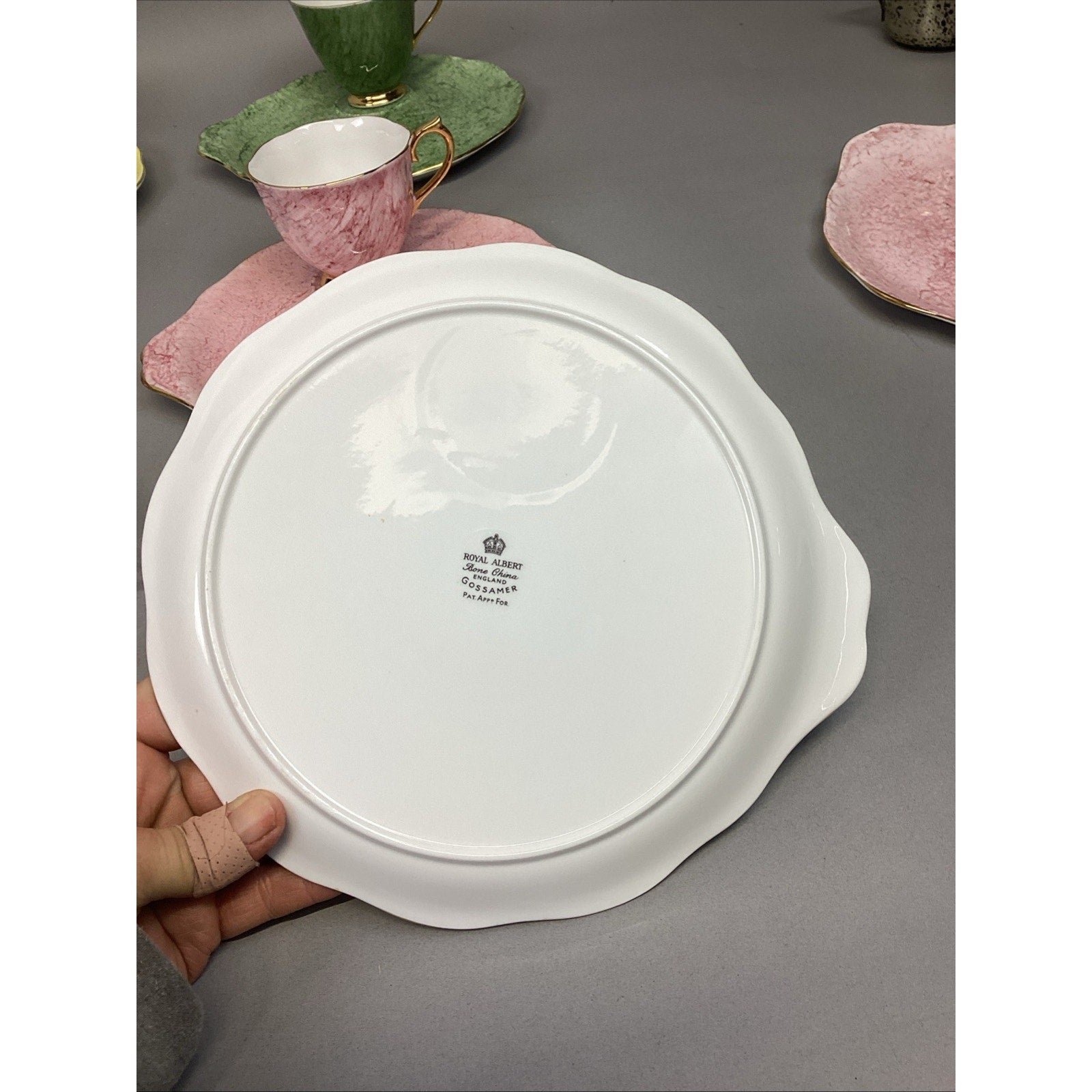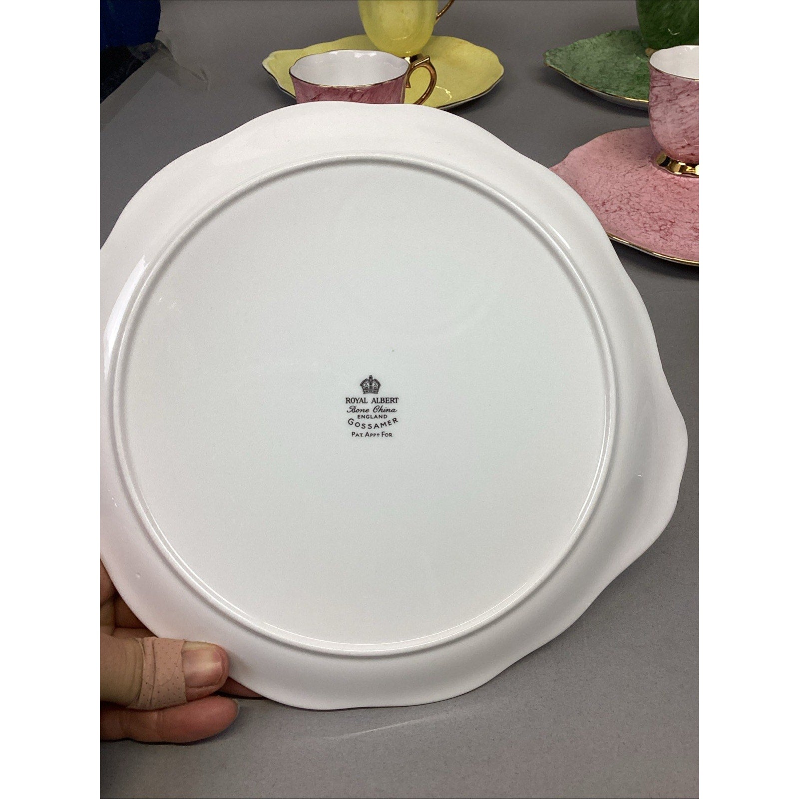 11 Pc Royal Albert Gossamer England Cups, Saucer Snack, Luncheon Plates. Set is in good condition. There are 5 cups and 6 plates. The plates measure 8.75”Lx8”D. The cups measure 2.75”Hx3.25”D.