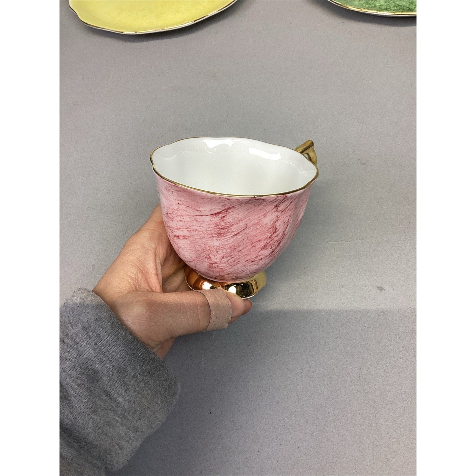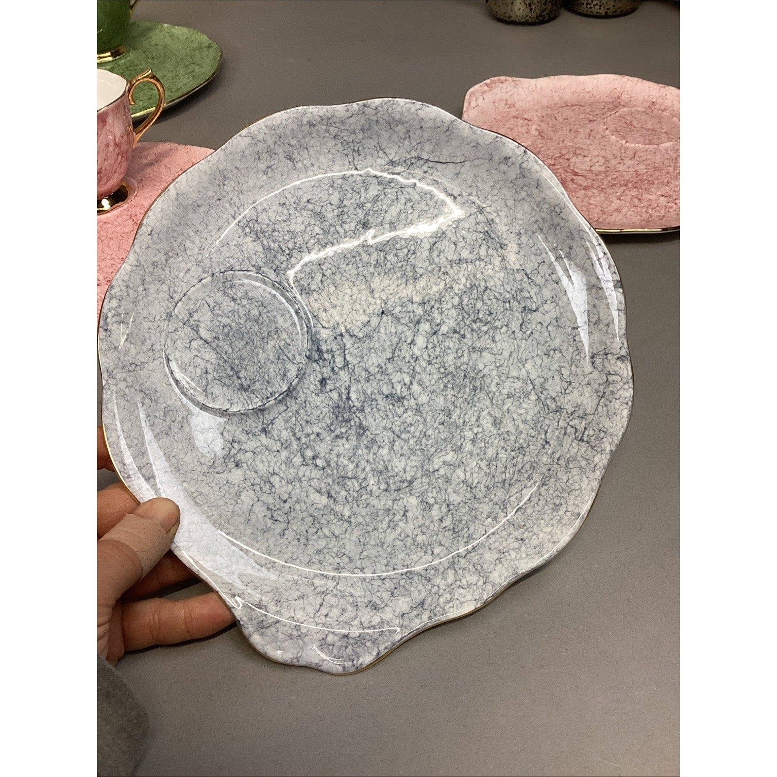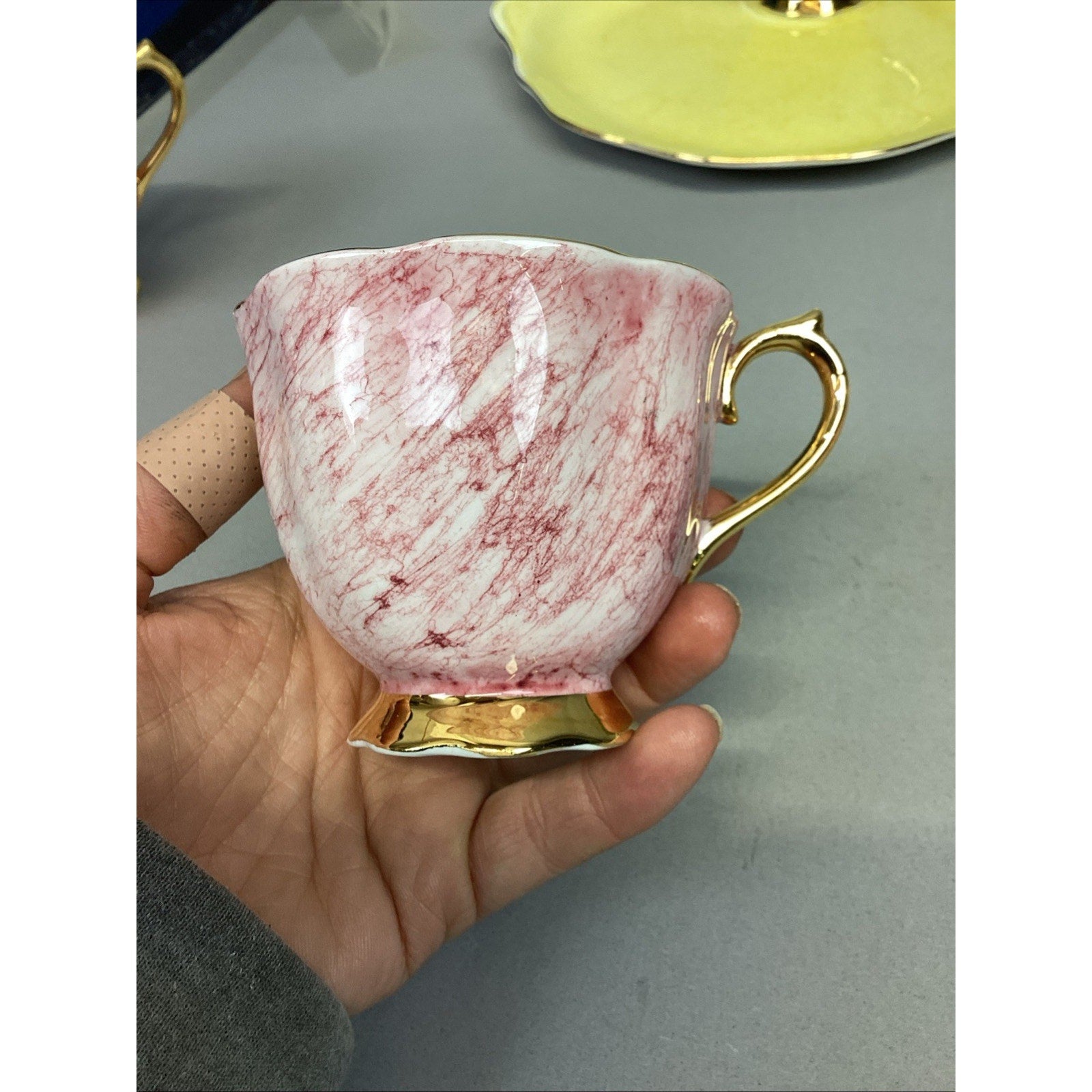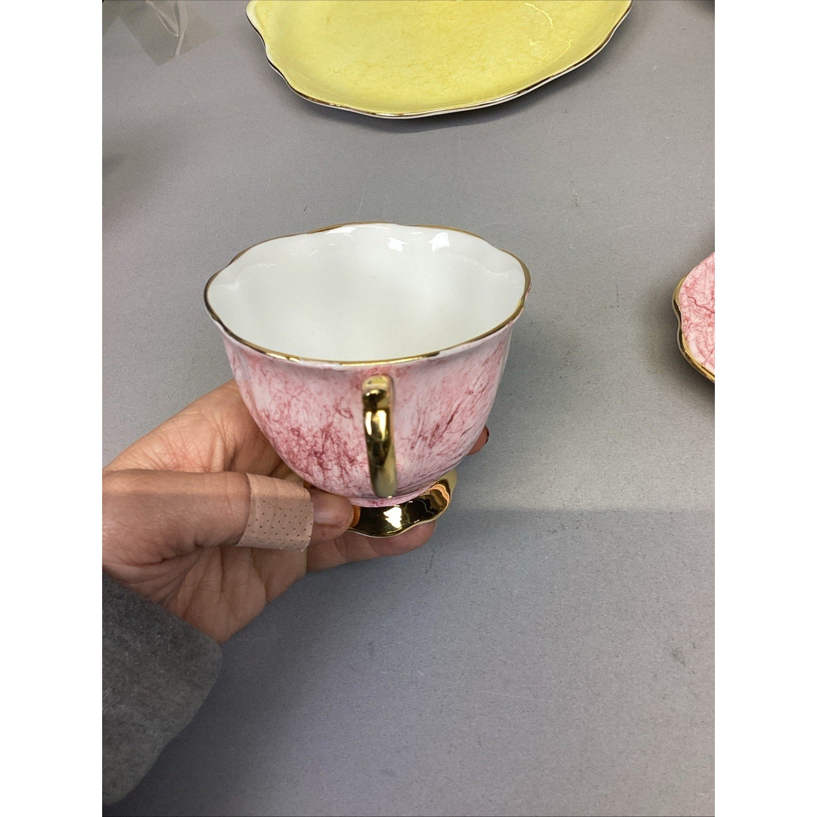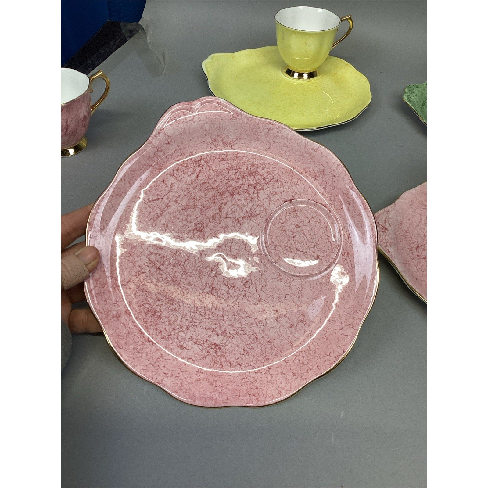 11 Pc Royal Albert Gossamer England Cups, Saucer Snack, Luncheon Plates. Set is in good condition. There are 5 cups and 6 plates. The plates measure 8.75”Lx8”D. The cups measure 2.75”Hx3.25”D.