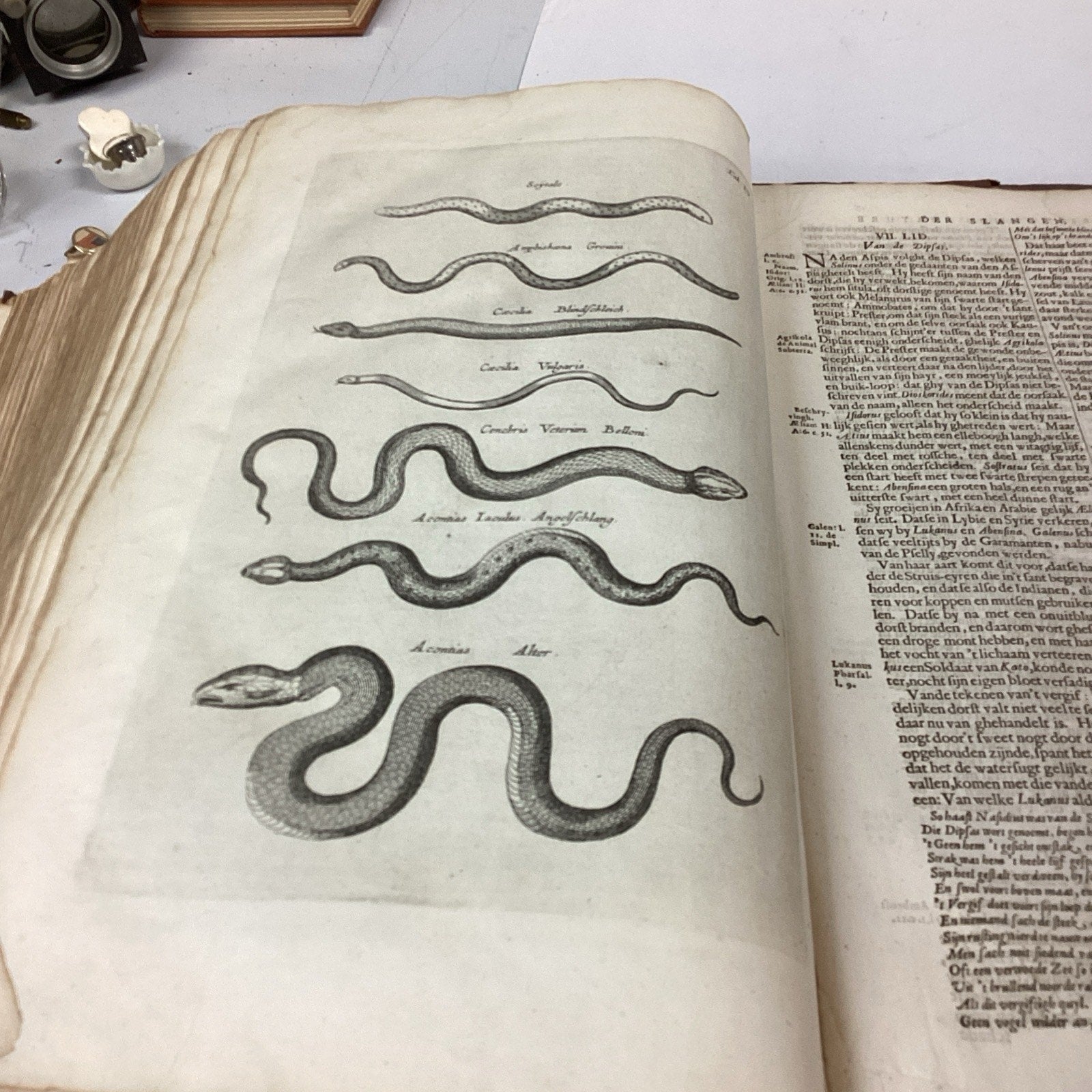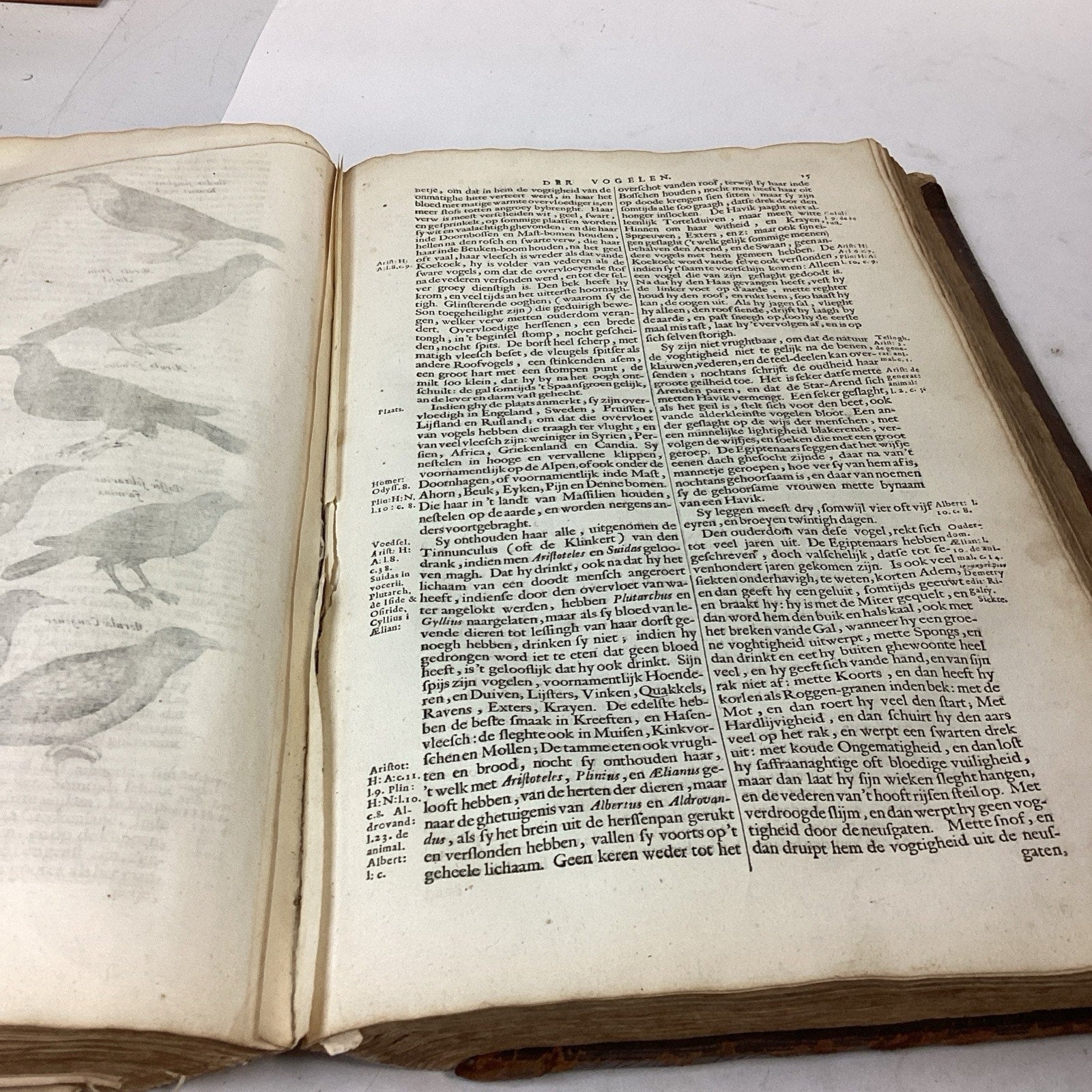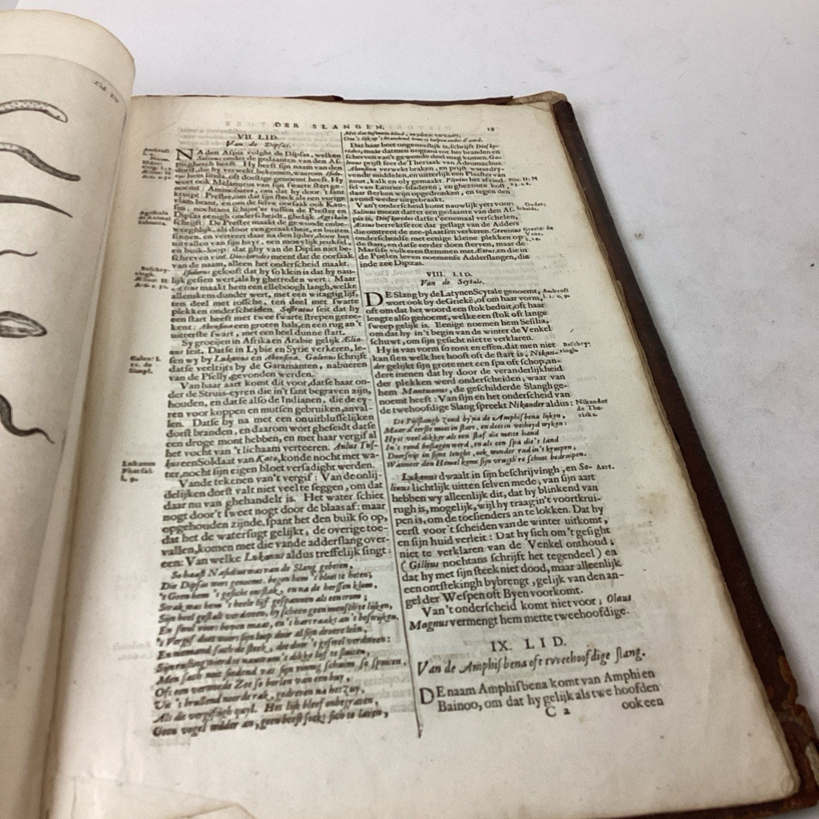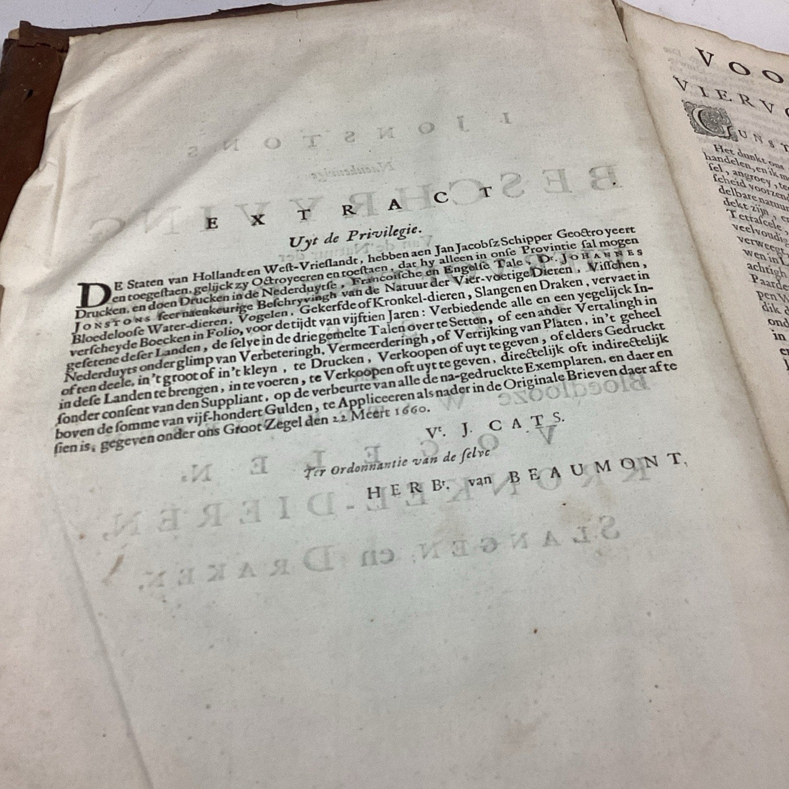 Antique Dutch Book - J. Jonston’s - Description Of The 4 Footed Animals, Fishes, bloodless water animals, serpents and dragons. Most likely a Dutch textbook. According to the inner pages, the only year I could find is 1660 so that is possibly the year this book was published. This book is in poor condition and all in Dutch. It’s a large and heavy book. This book measures 15x10x3.25” and weighs 8 pounds.