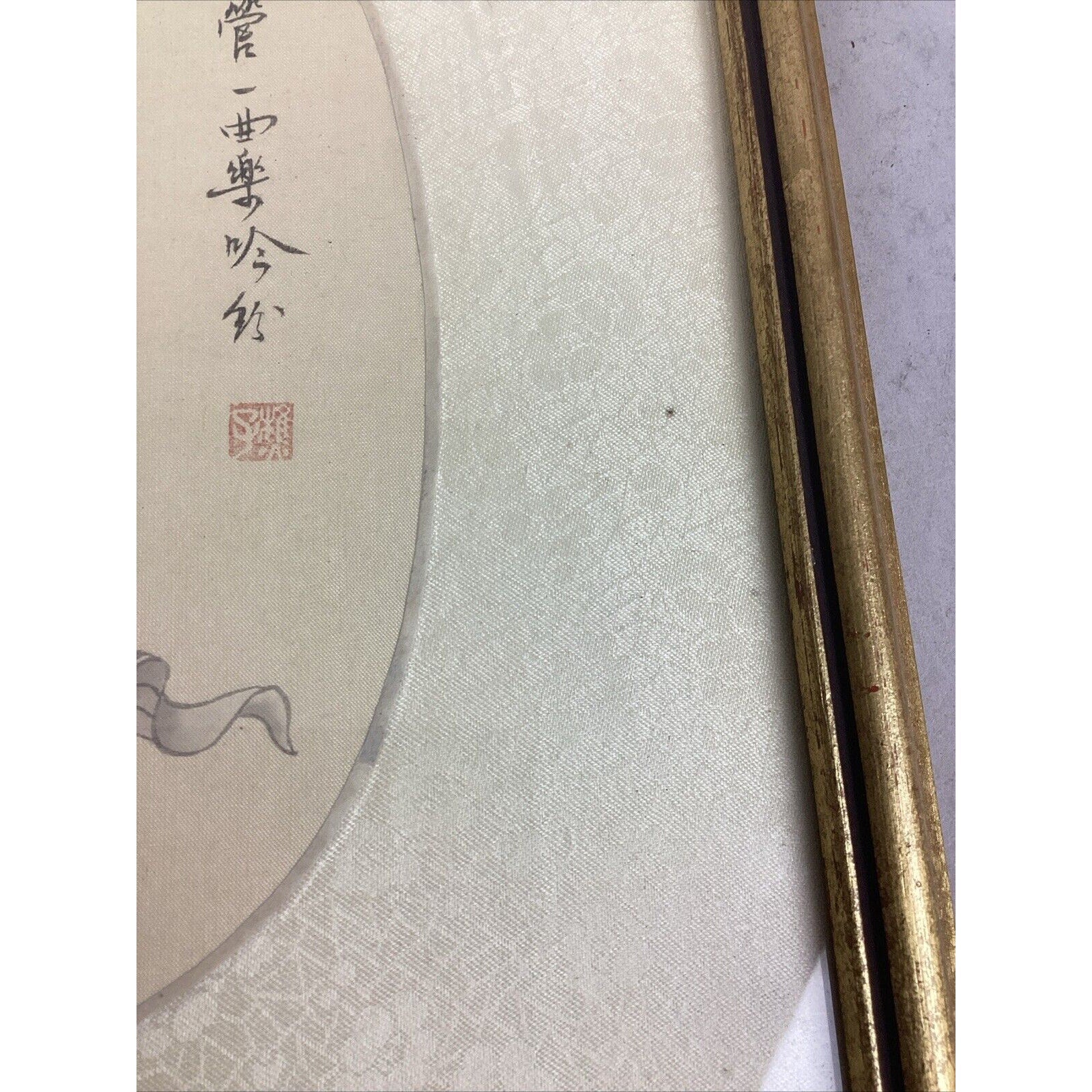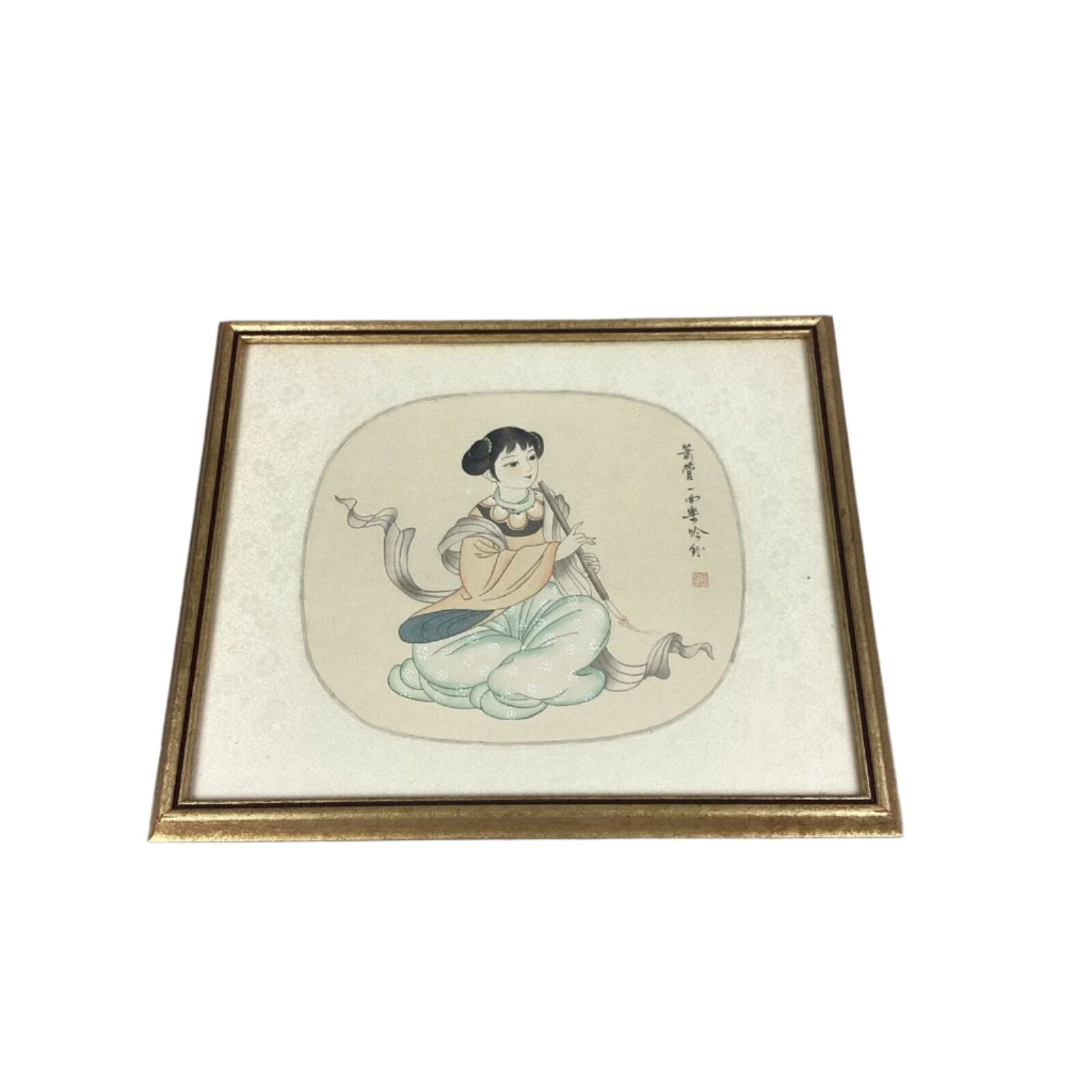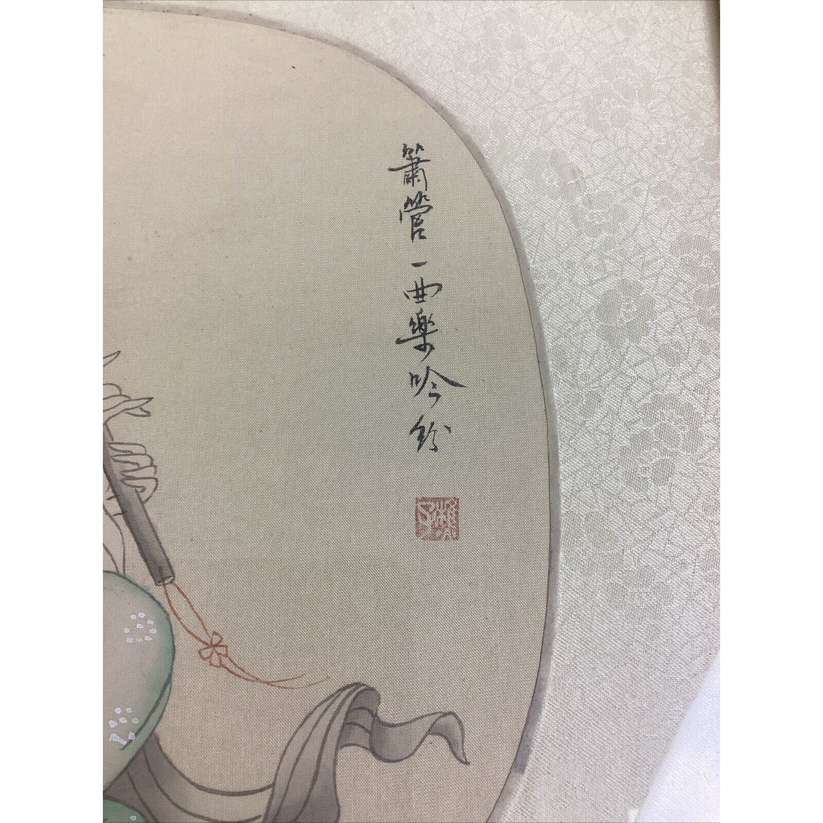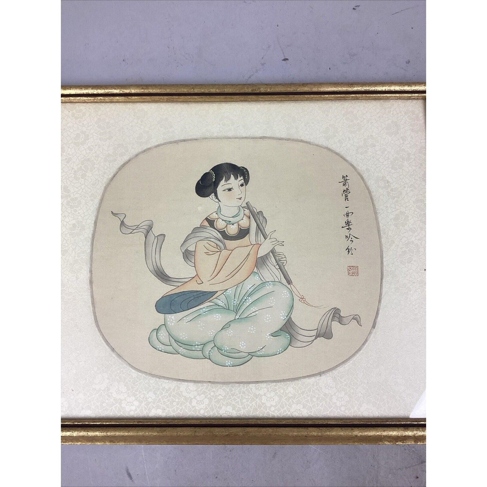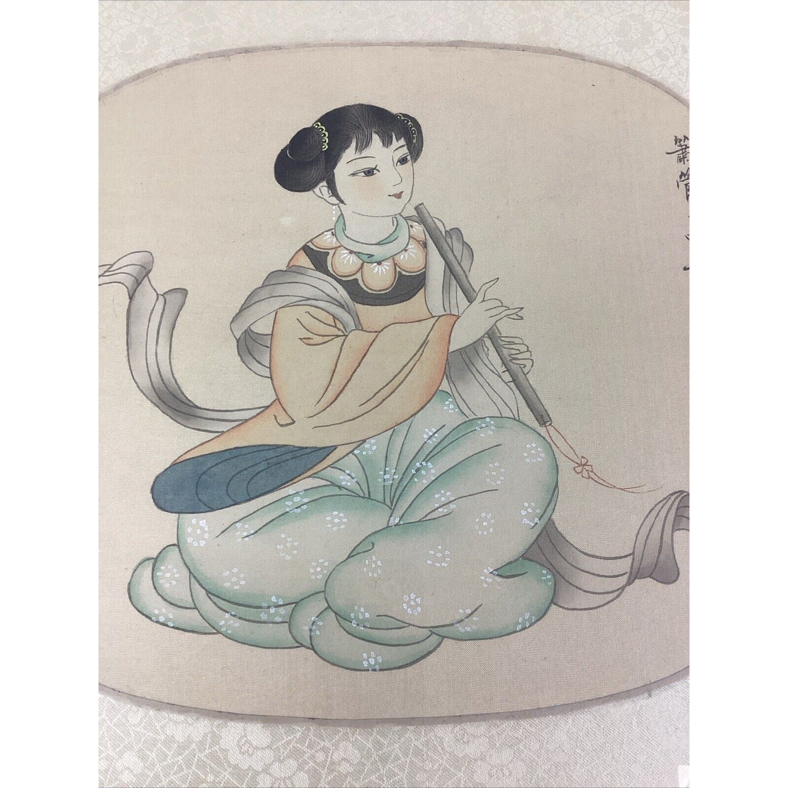 Antique Chinese Watercolor Painting On Silk - Girl Playing Flute