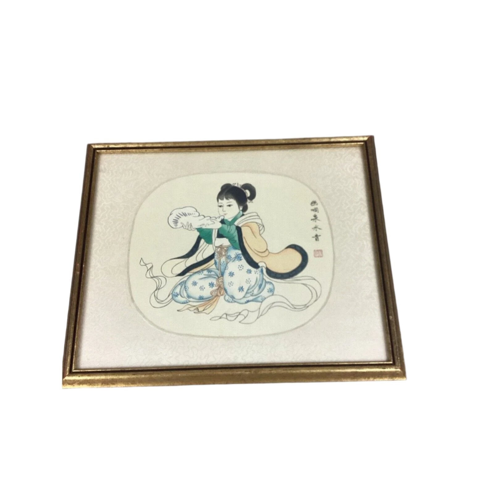 Antique Chinese Watercolor Painting On Silk - Girl Playing Instrument