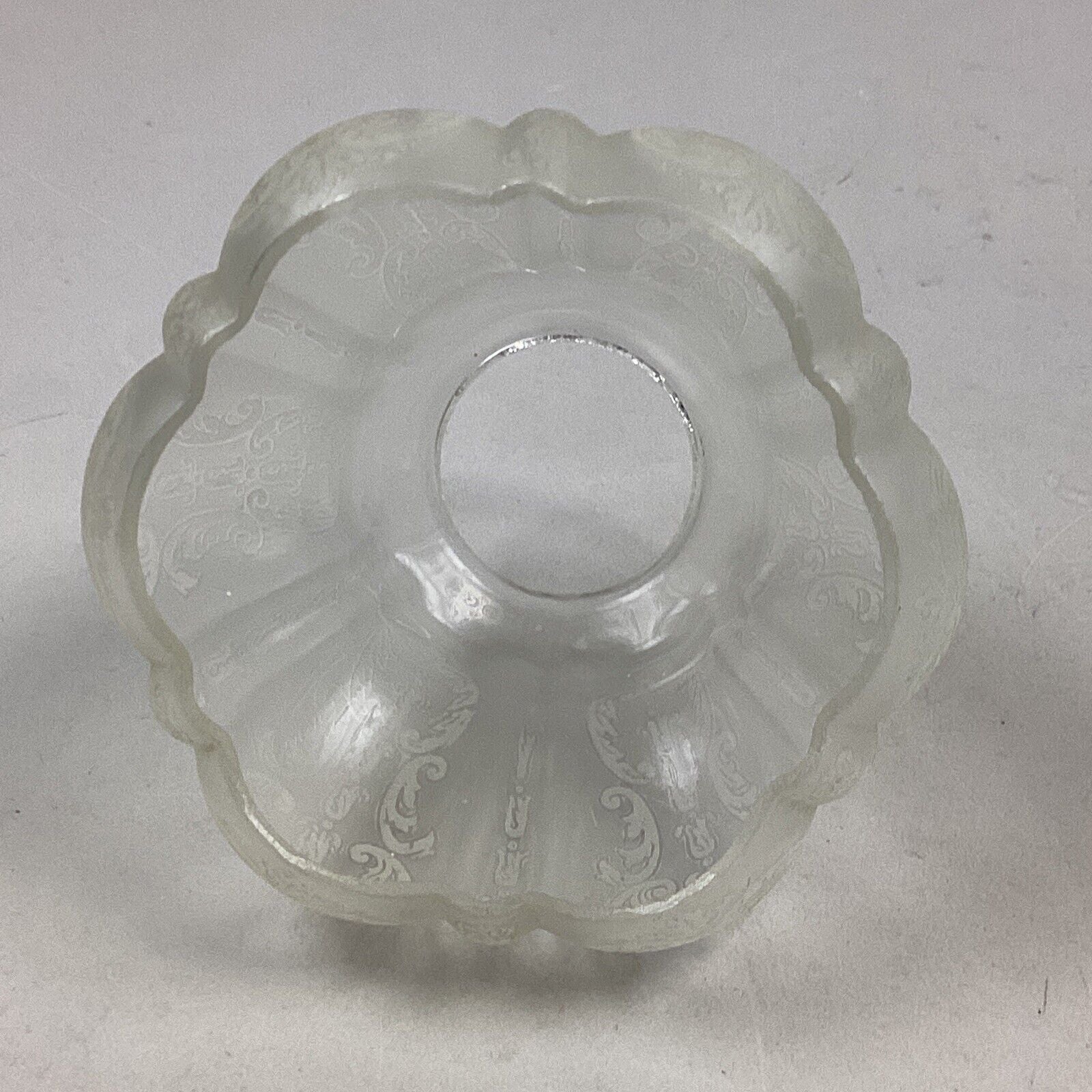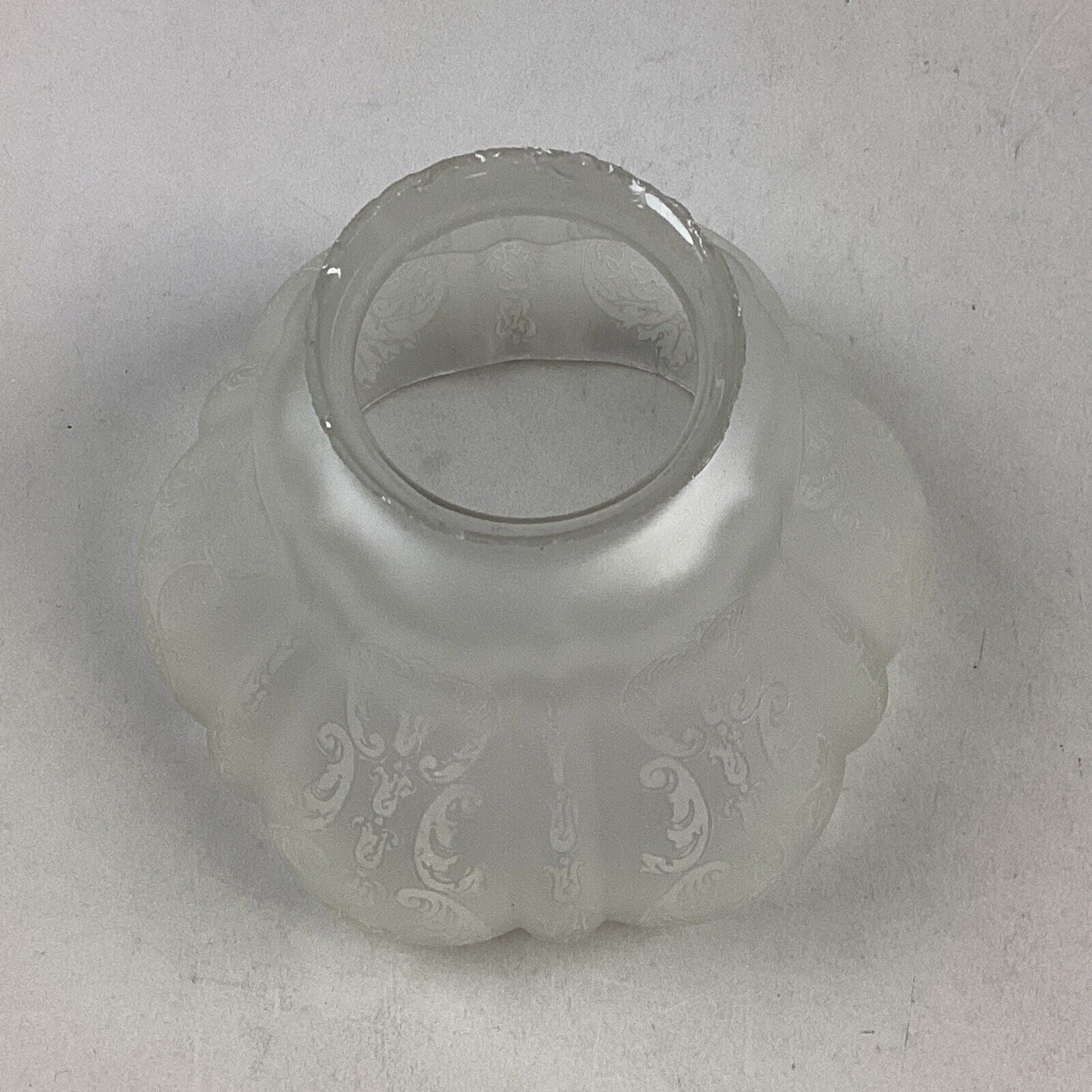 You are bidding on an antique etched, frosted glass lamp shade. This is in used condition. There are some spots/marks on the glass from age and normal use. But there’s no cracks or chips in the body of the glass that I noticed. Where there is damage is the top edge. You can see the damage in all the pictures but if you have any questions about the condition, feel free to send me a message.