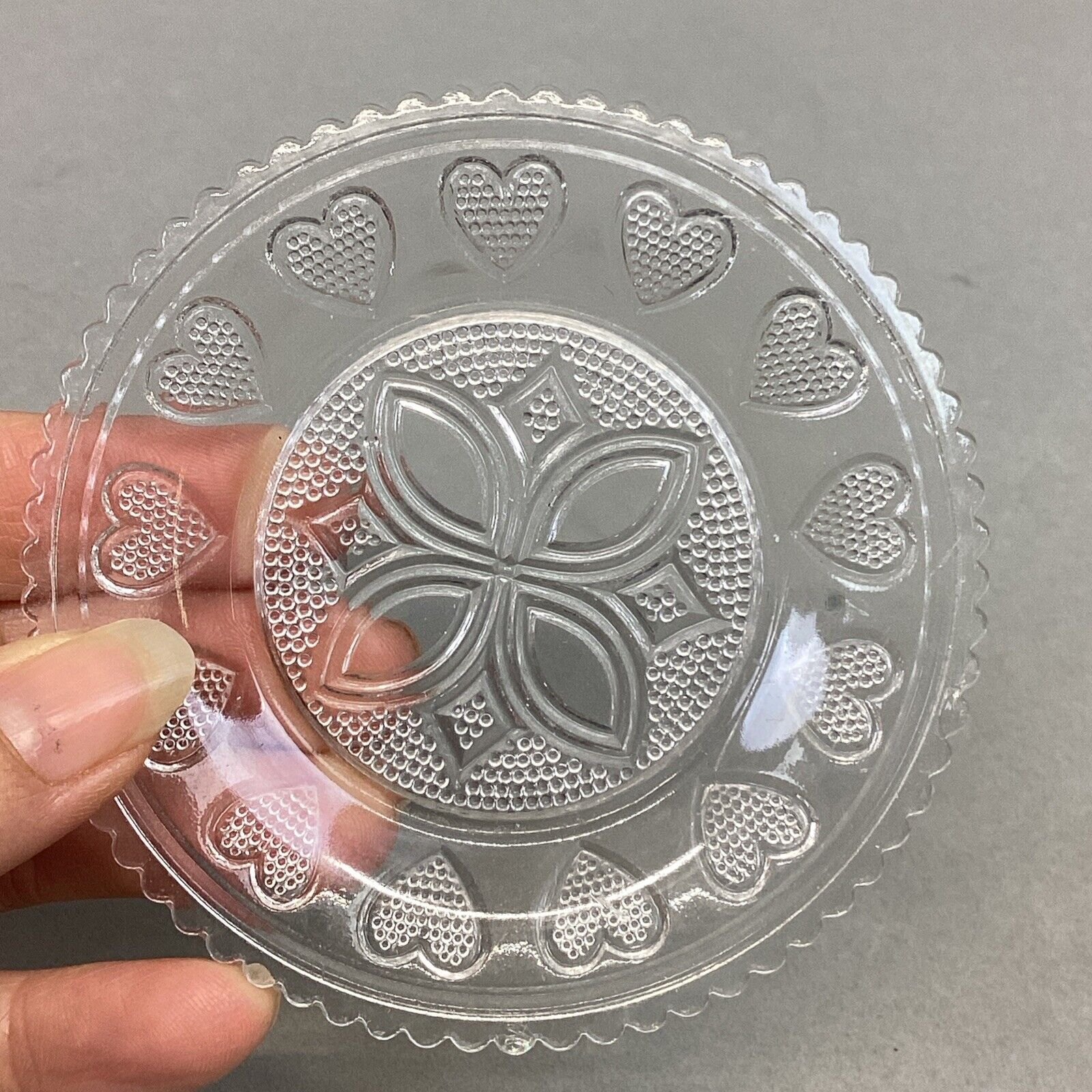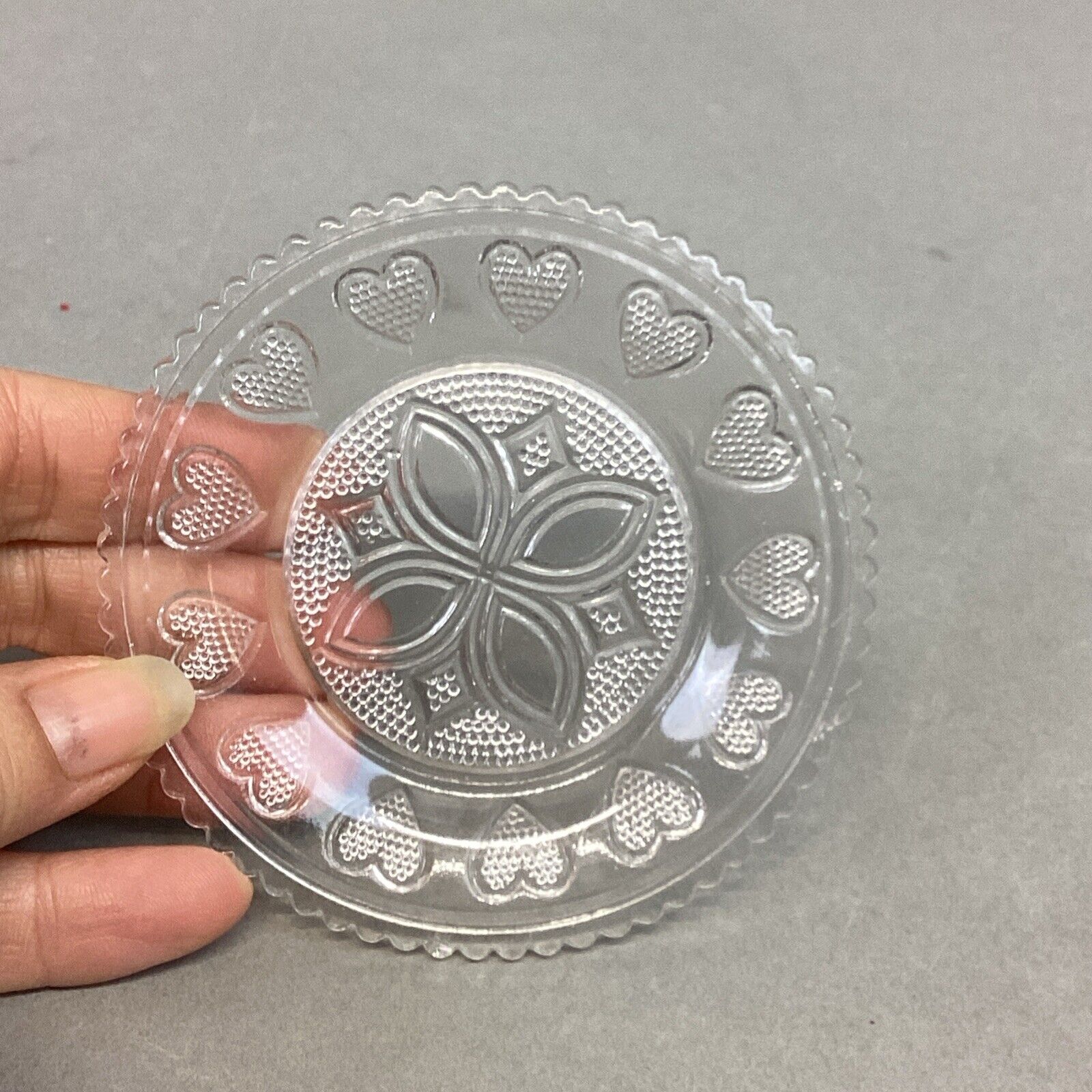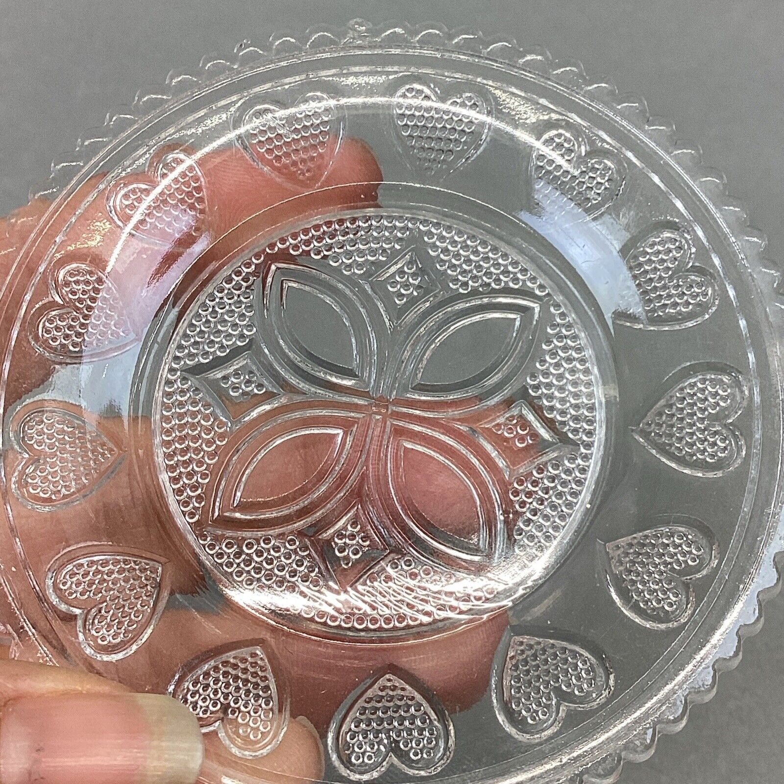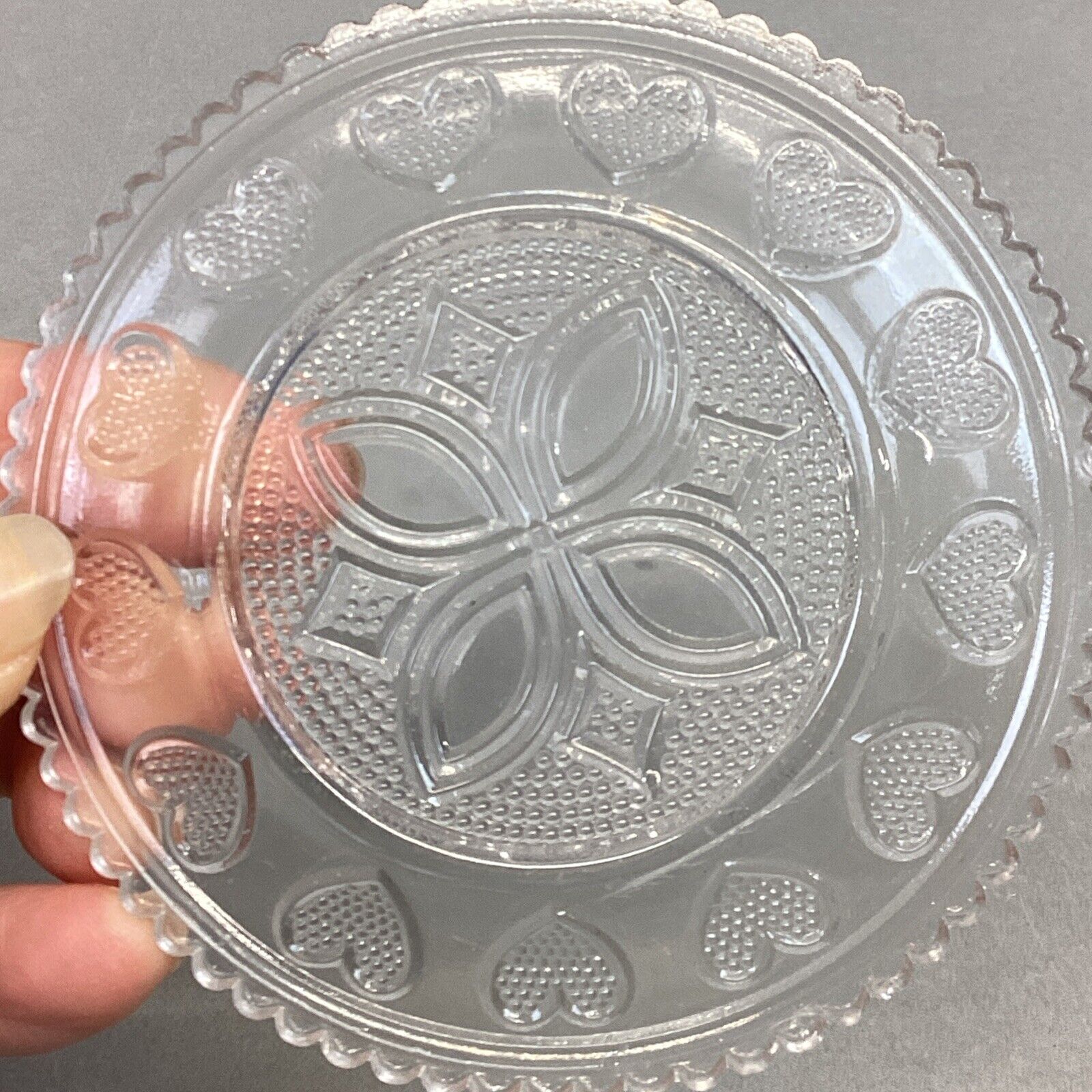 Antique Sandwich Glass Fiery Opalescent Pressed 13 HEART Plate. In good condition. It has 1 scratch on it which is hard to see in the pictures. Plate measures 3.5”D