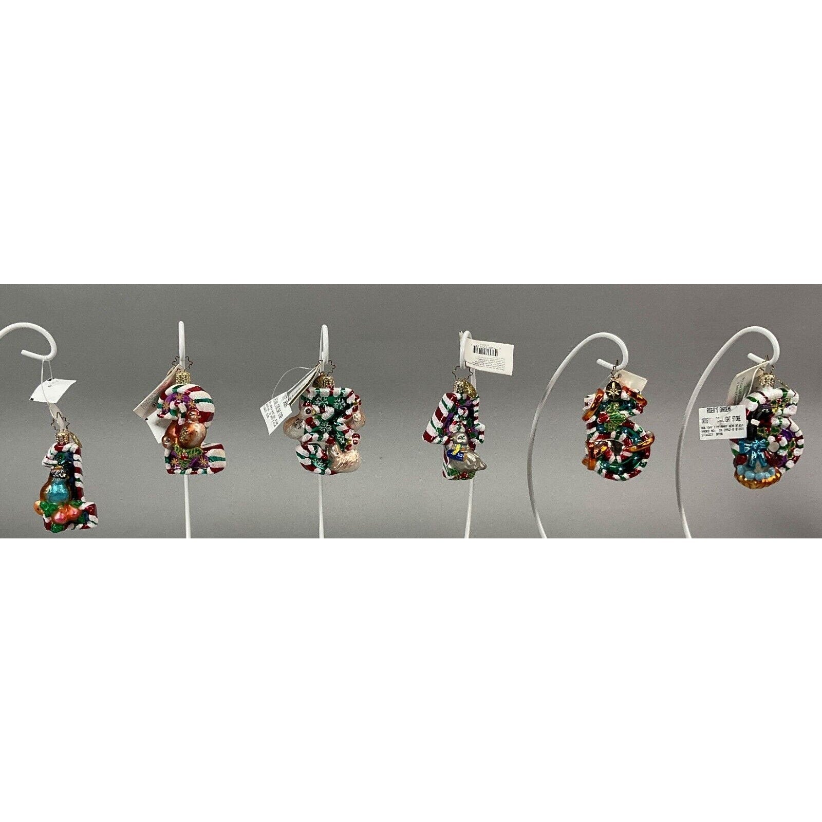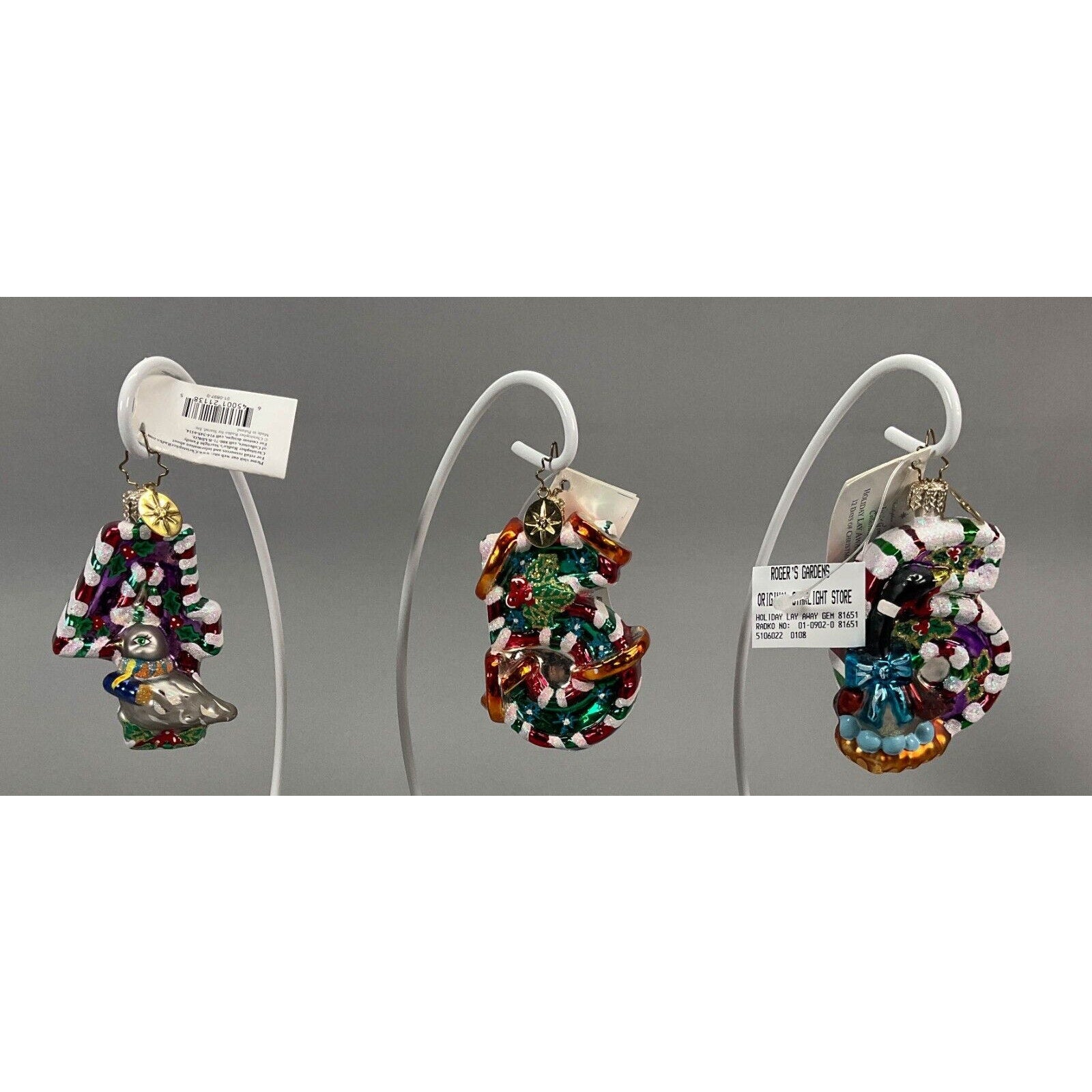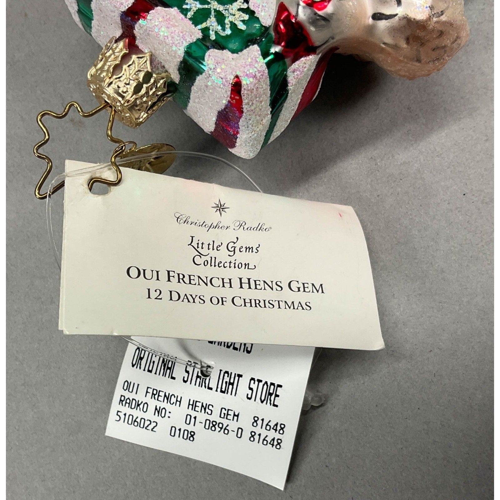 12 Radko Christmas Ornaments - Numbers 1-12. All with their original tags. Includes Pear Necessities Gem - Number 1 - #01-0894-0 (3.5" - Shortest), Double Dove Love Gem - Number 2 - #01-895-0, Oui French Hens Gem - Number 3 - #01-0896-0, Calling Birds - Number 4, Golden Memories Gem - Number 5 - #01-0901-0, Holiday Layway Gem - Number 6 - #01-0902-0, Swance Swimmers Gem - Number 7 - #01-0903-0, Merry Dairy Maids - Number 8 - #01-0904-0 damaged on top, A Chorus Nine Gem - Number 9 - #01-0905-0, Lords of the Dance - Number 10 - #01-0906-0, Plaid Pipers Gem - Number 11 - #01-0907-0, Backbeat Boys Gem - Number 12 - #01-0909-0 (4.25" - Tallest). Some paint and glitter loss. Ornament stands are NOT INCLUDED. The absence of a condition report does not imply that the lot is in perfect condition. Please review all the photos - scratches, damage and paint and glitter loss may be photographed but not written in description. Ornaments hangers may be loose or missing. Since these are used vintage decorations most ornaments and decorations do show wear. Boxes are not included unless photographed. Photos are considered part of the condition report. Complete condition information is available by request, please request no later than 24 hours prior to the auction. All lots are offered and sold "as is", and Willow Auctions will not provide refunds based on condition.