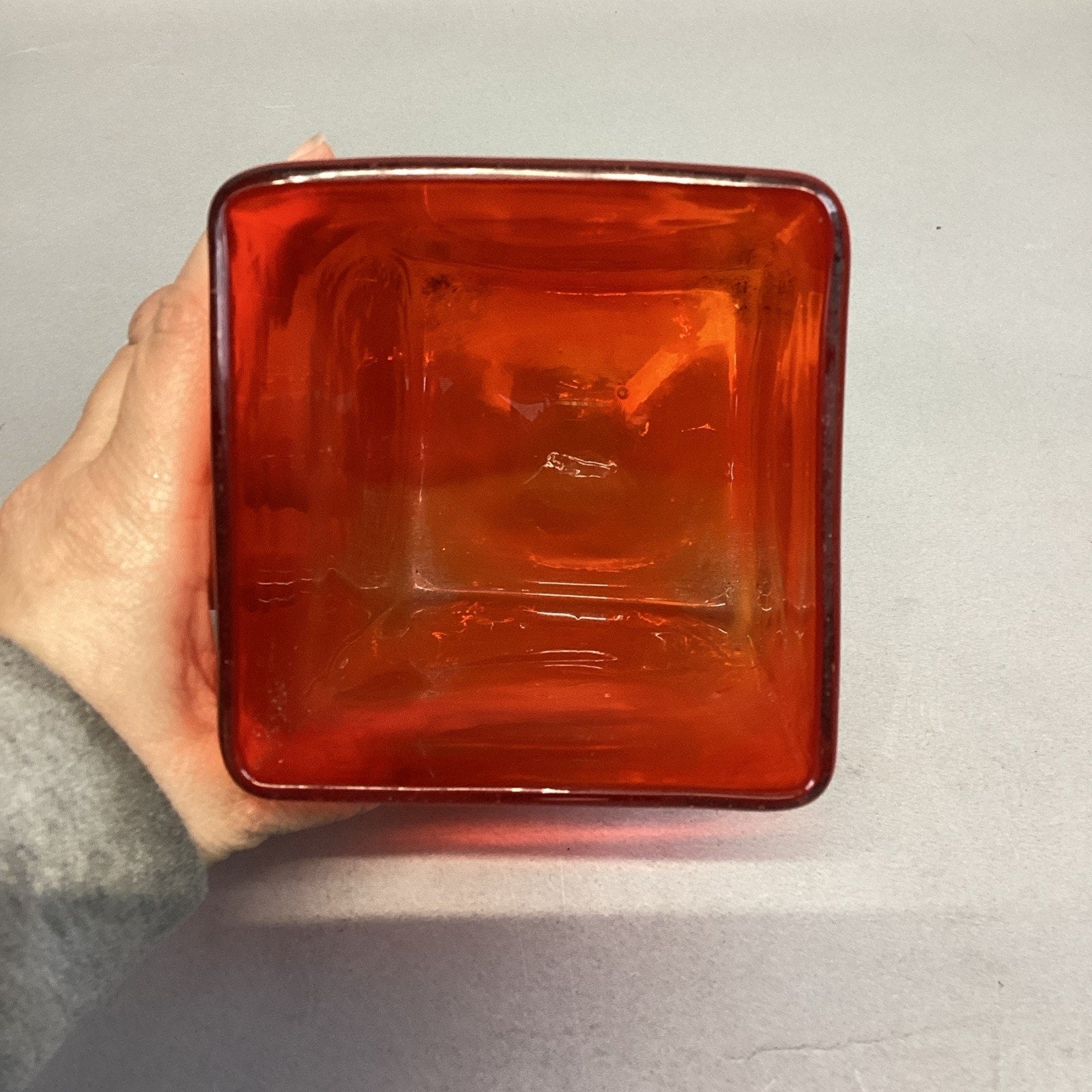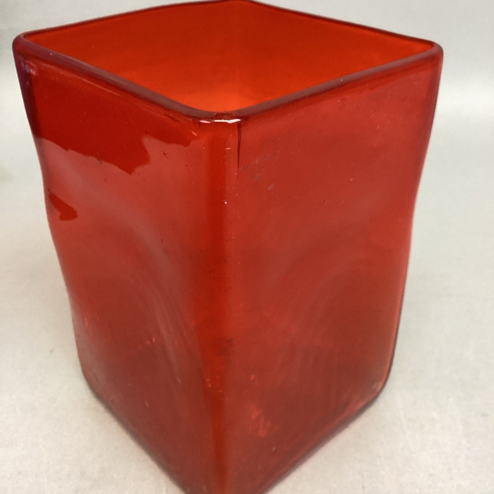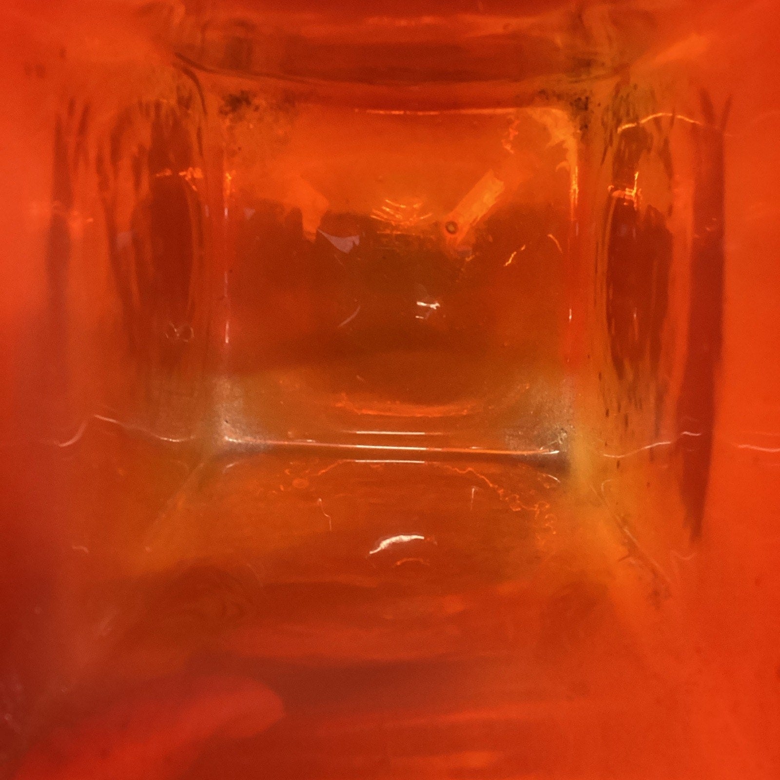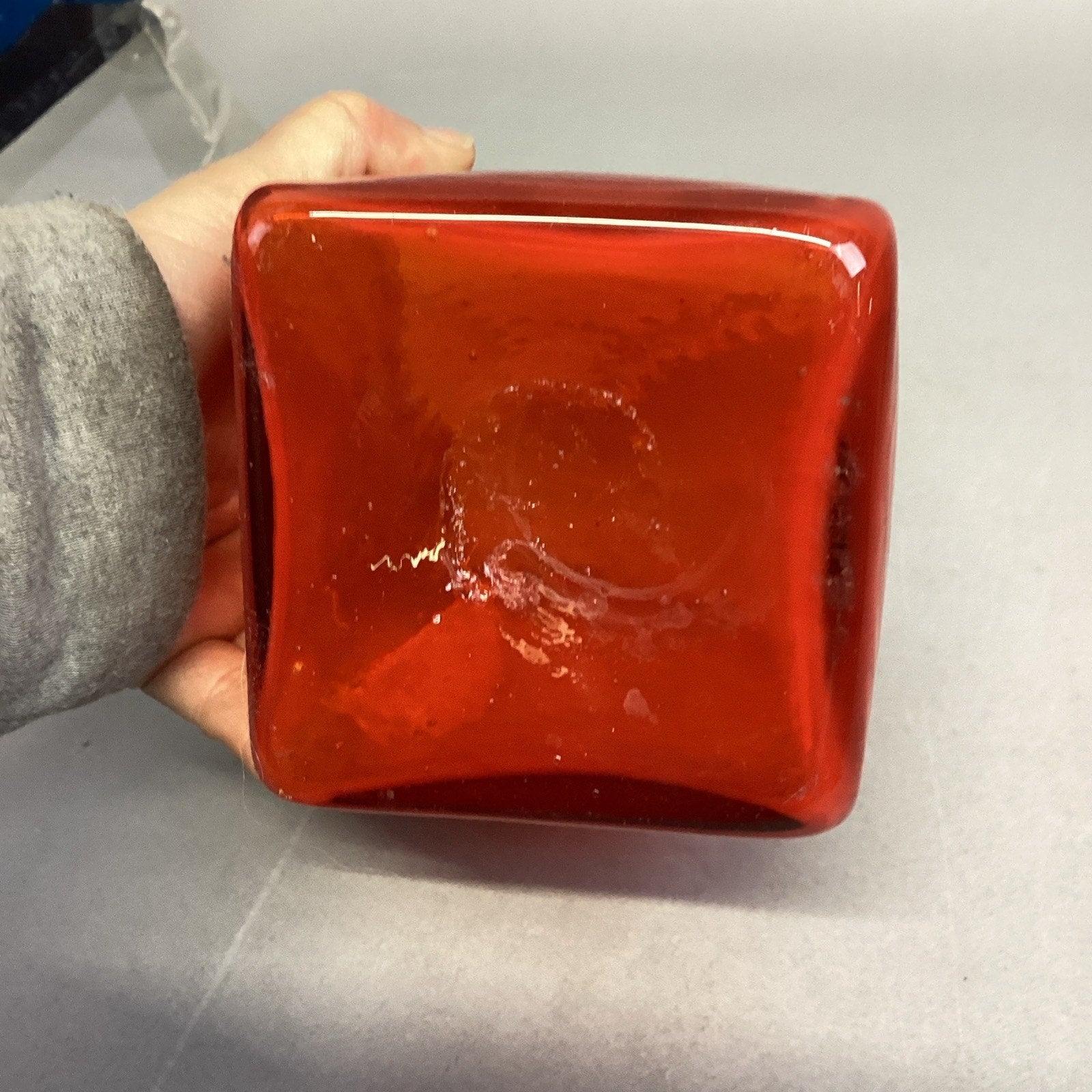 Decorative Orange Square Glass Cube Container Indoor Decor Candle Holder or vase. Measures 6”Hx4”D. There are several air bubbles in between the layers of glass.