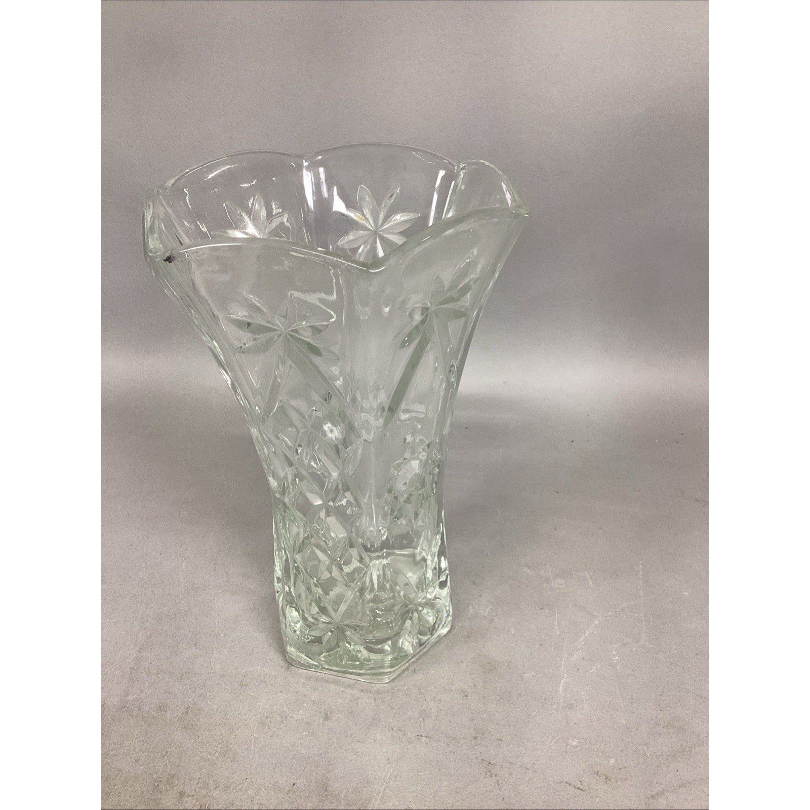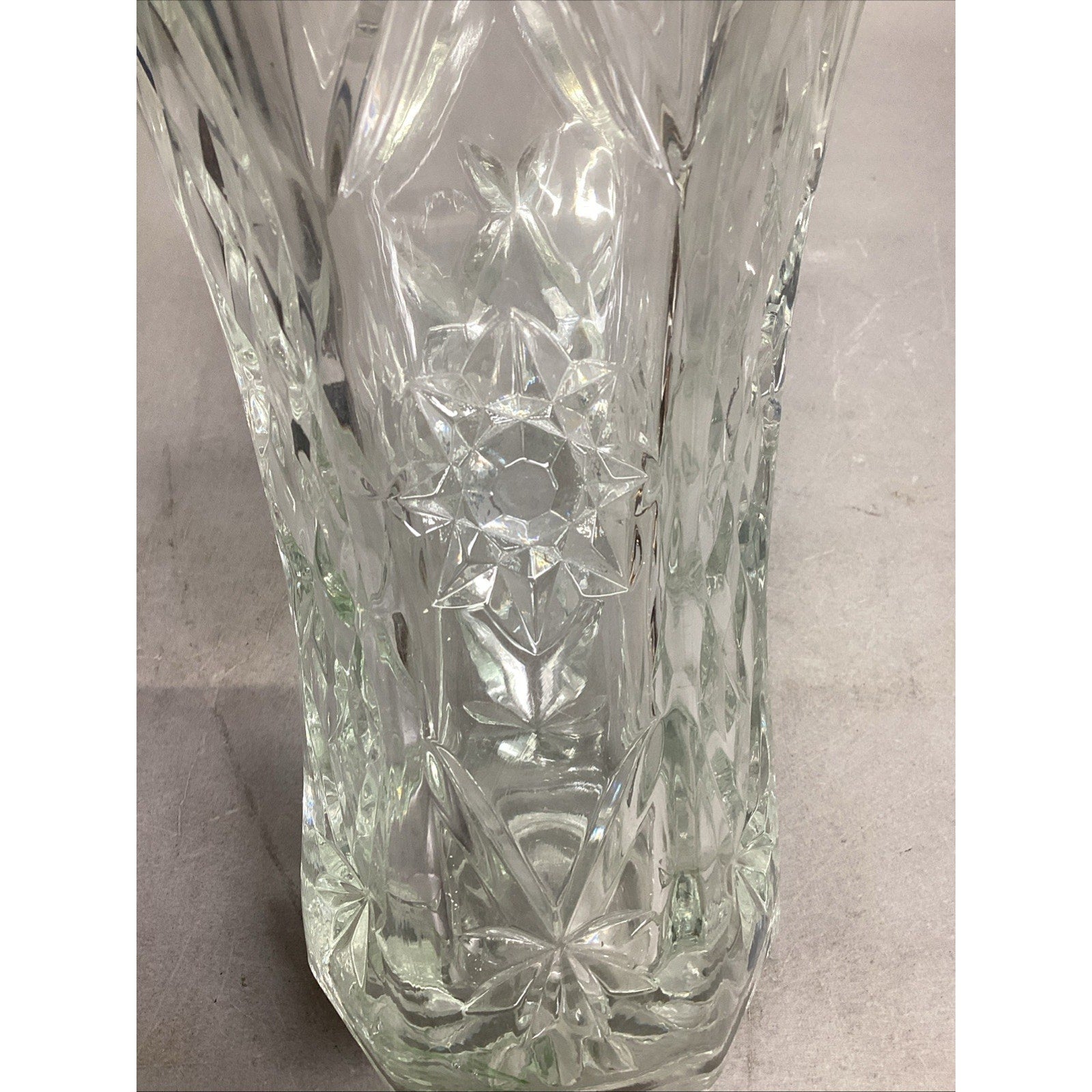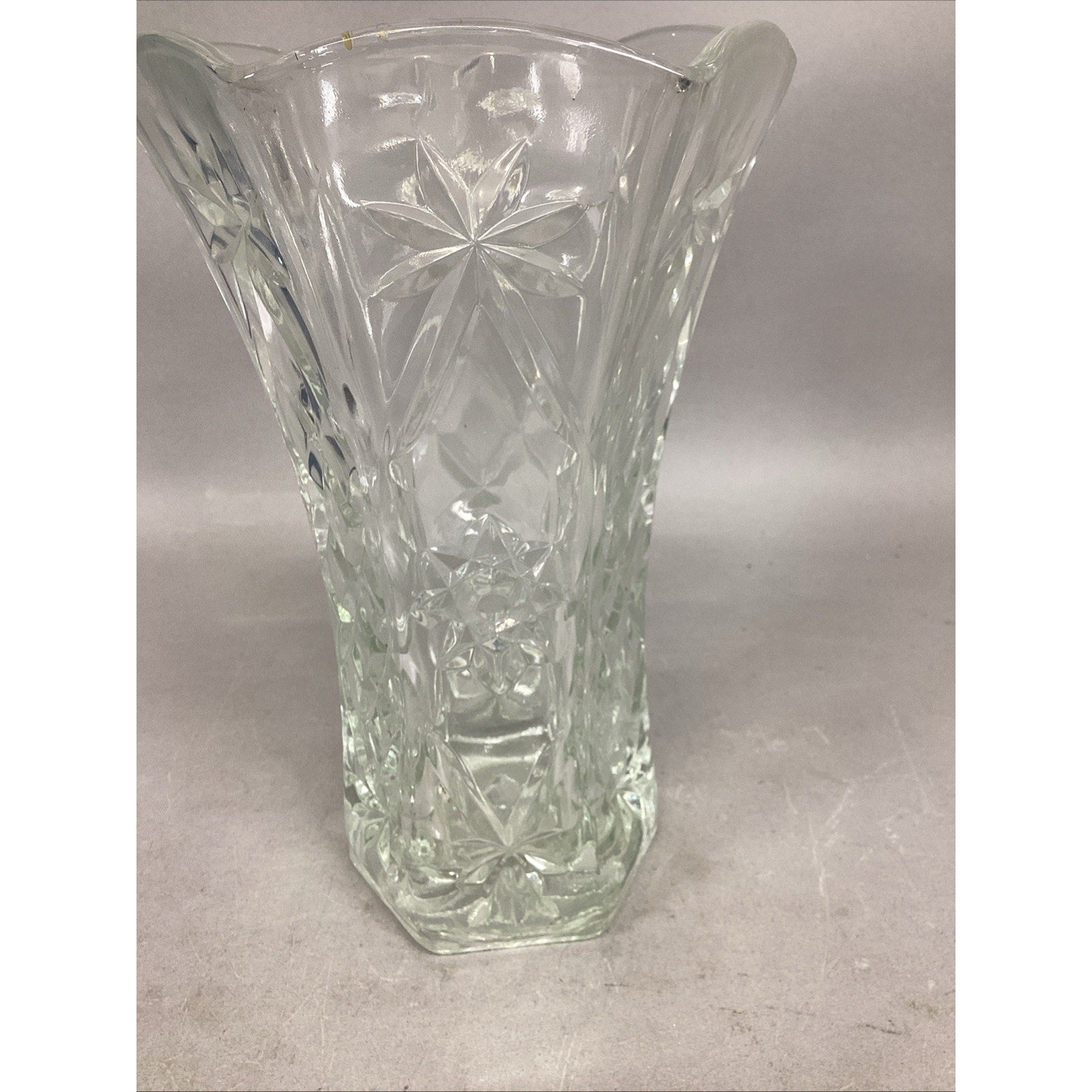 EAPG Clear Glass Vase Molded Wide Fluted Collar Starburst Lead Crystal 10.5”Hx6.5”D. In good, used condition. This item weighs 4.2 pounds.