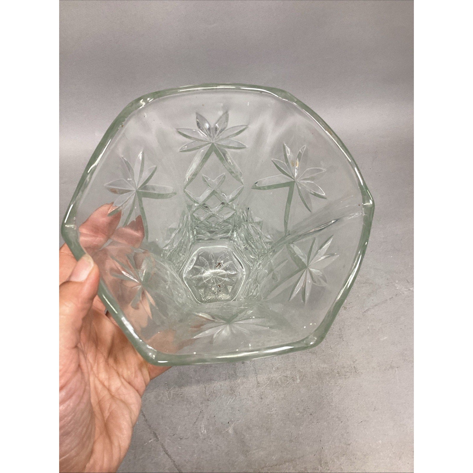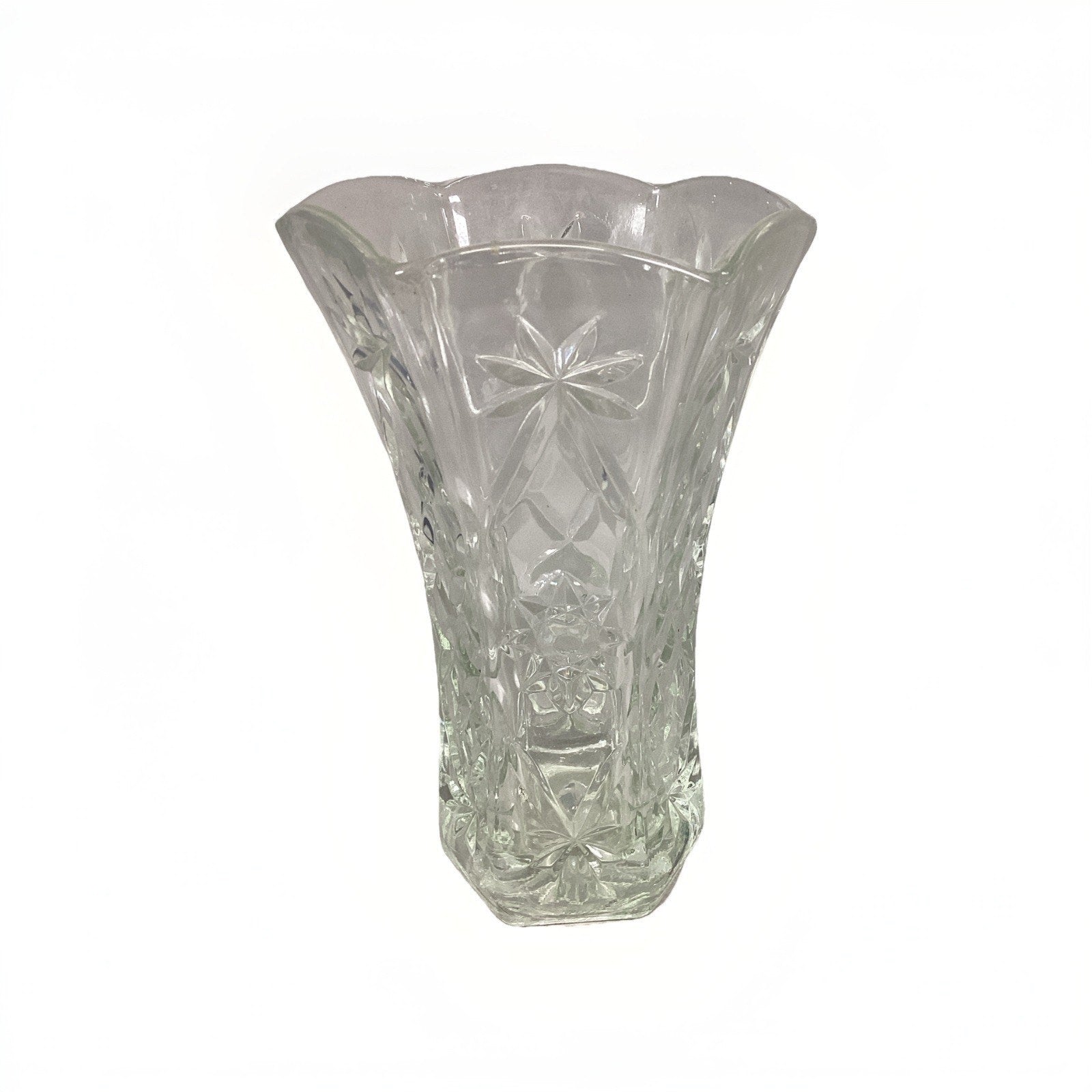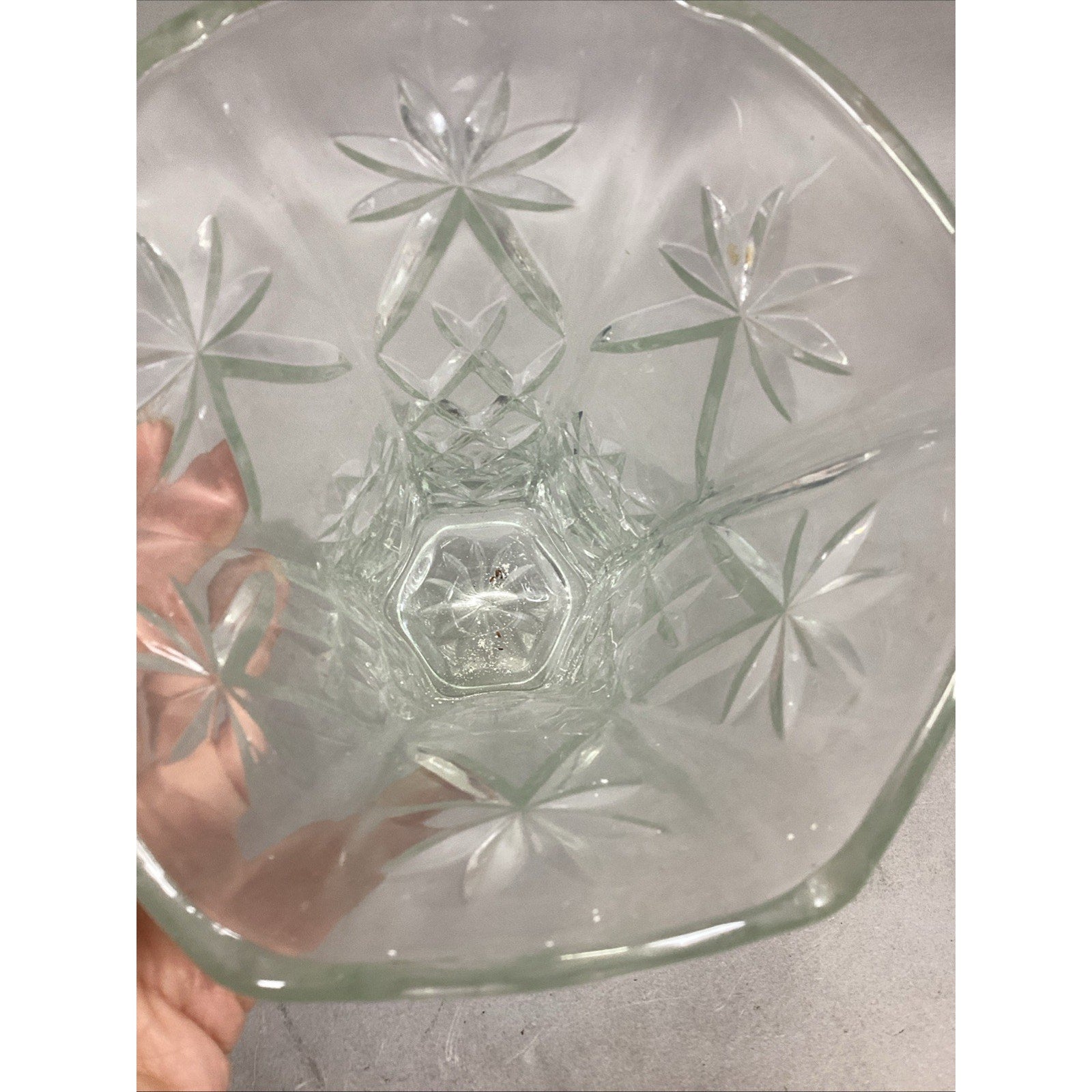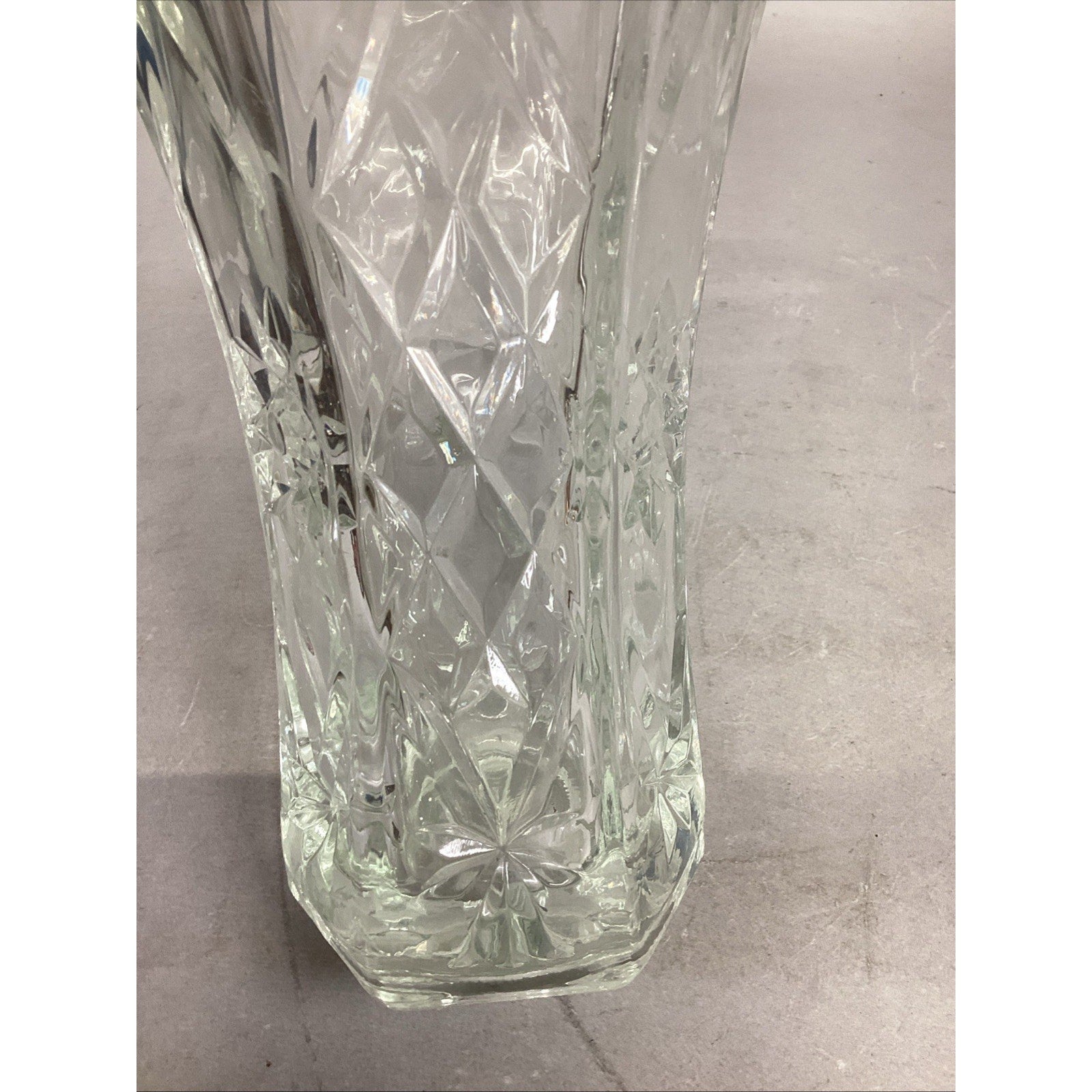EAPG Clear Glass Vase Molded Wide Fluted Collar Starburst Lead Crystal 10.5”Hx6.5”D. In good, used condition. This item weighs 4.2 pounds.