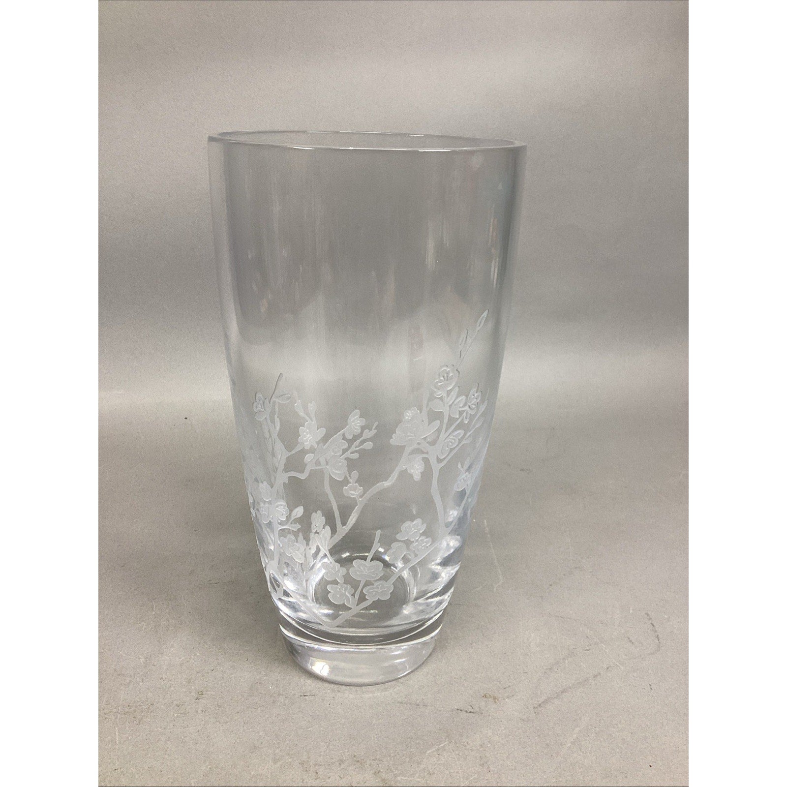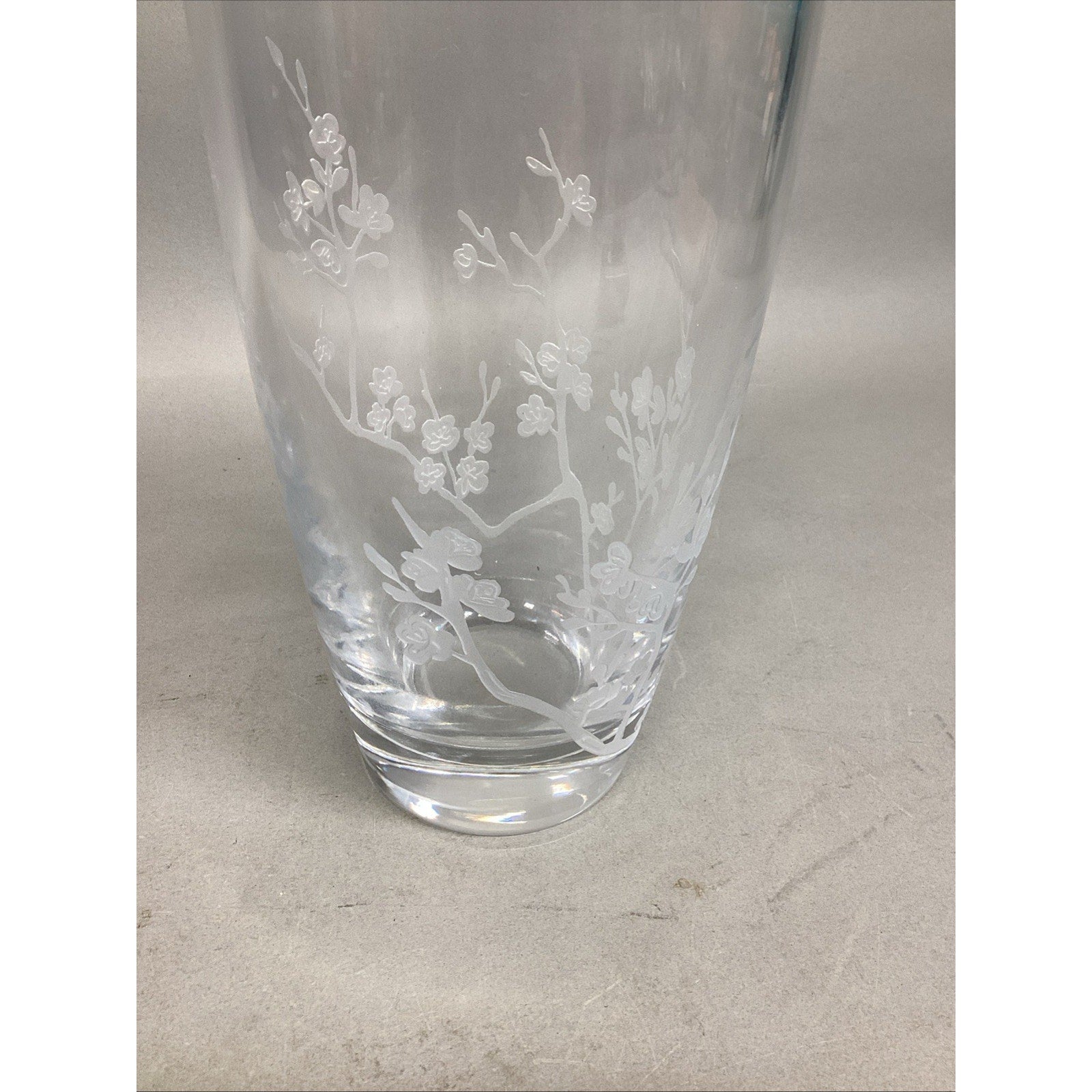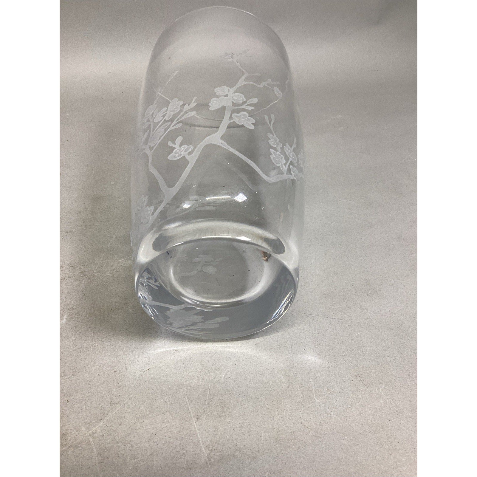 Floral Etched Glass Flower Vase - 10x5”. In used but good condition. There are no cracks or chips in the glass.