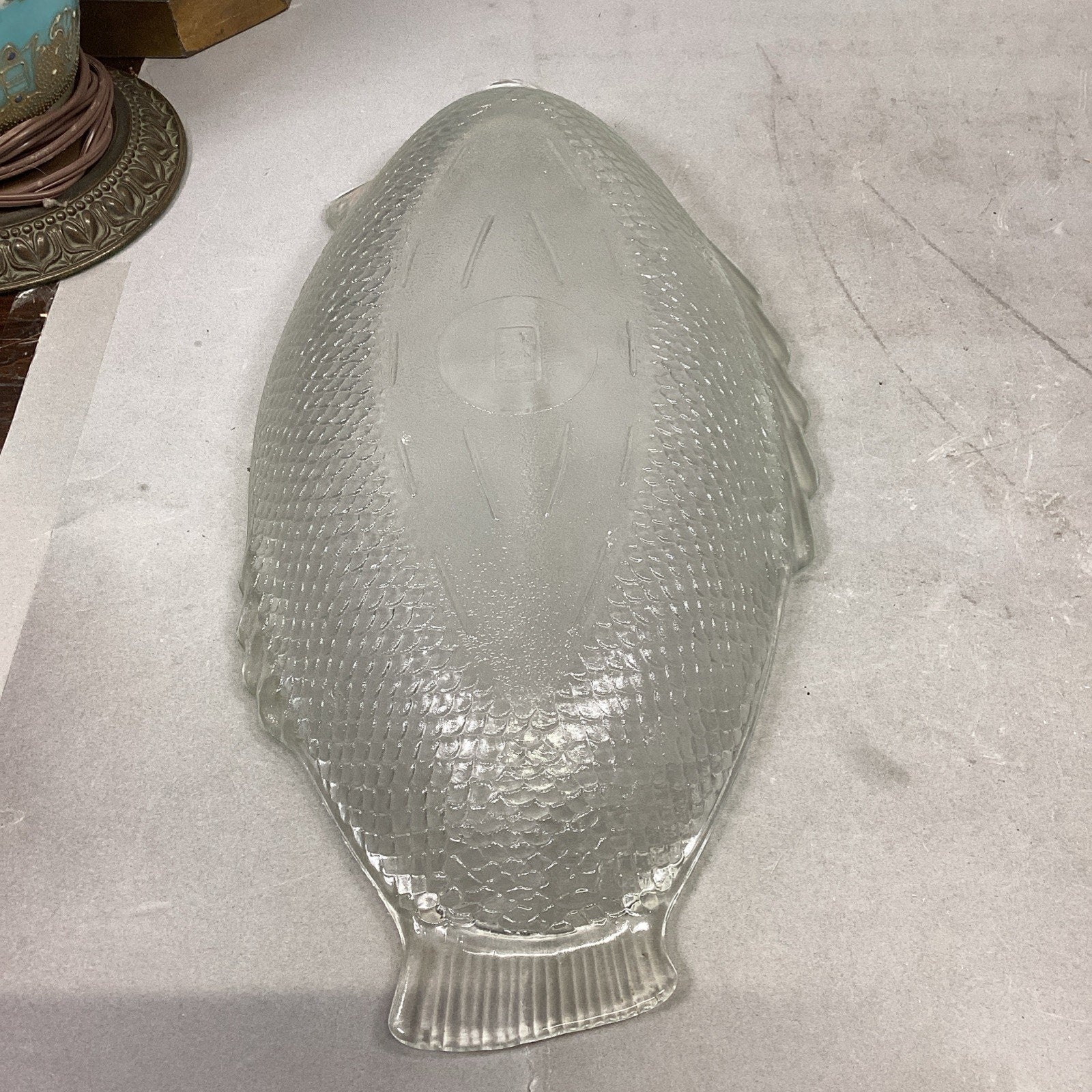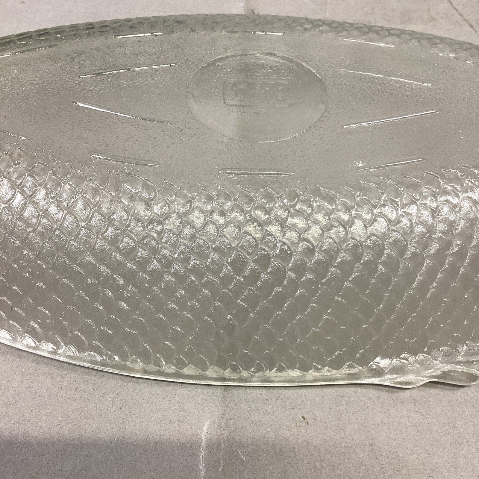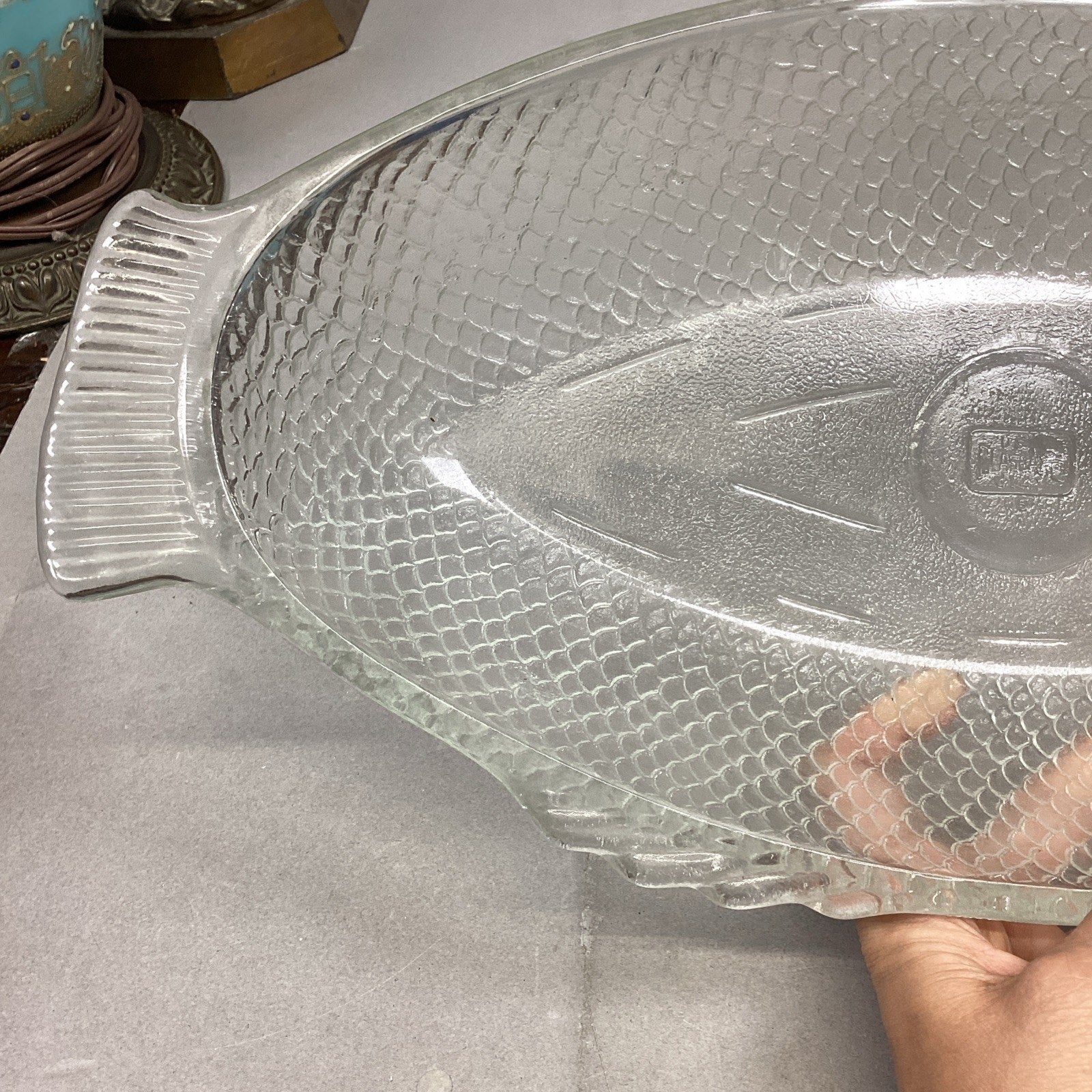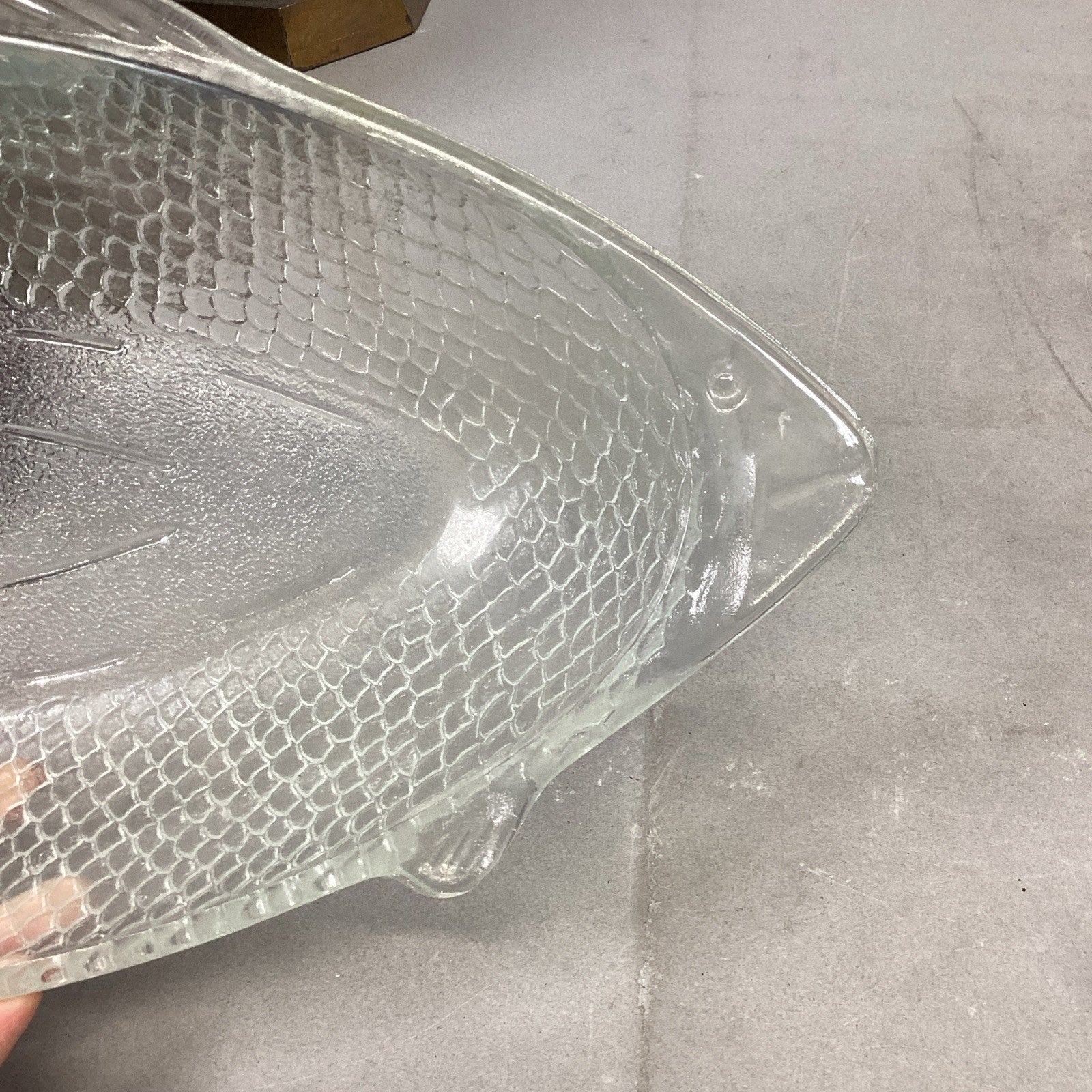 Vintage Glassbake #4141 Clear Glass Fish Shaped Baking Serving Dish - 17.75”Lx8.5”W. Made USA. The nose of the fish has a chip in it which I didn’t notice at first. It just feels rough to the touch. I took a picture of it but since it’s on the edge, it’s hard to see.