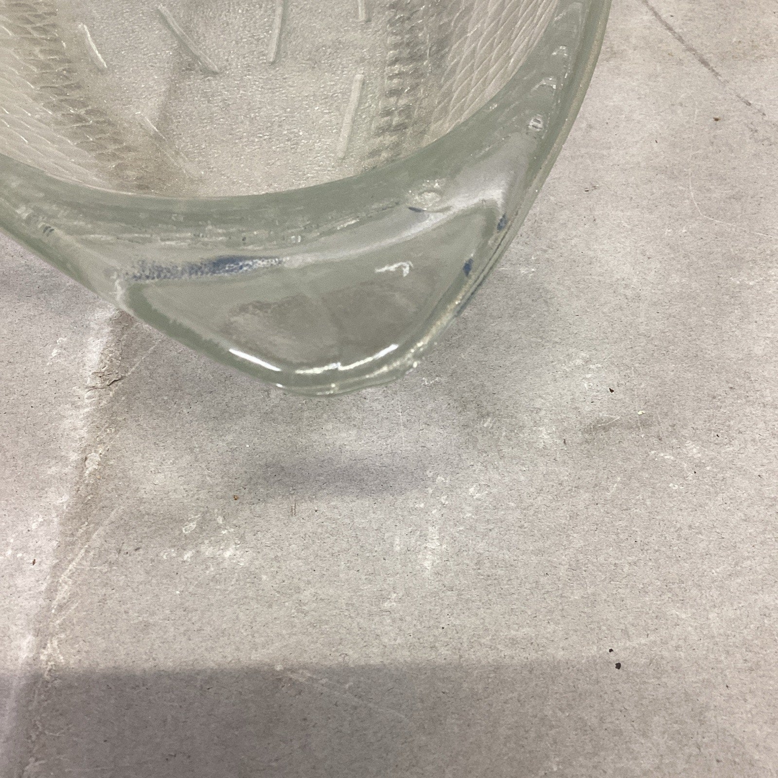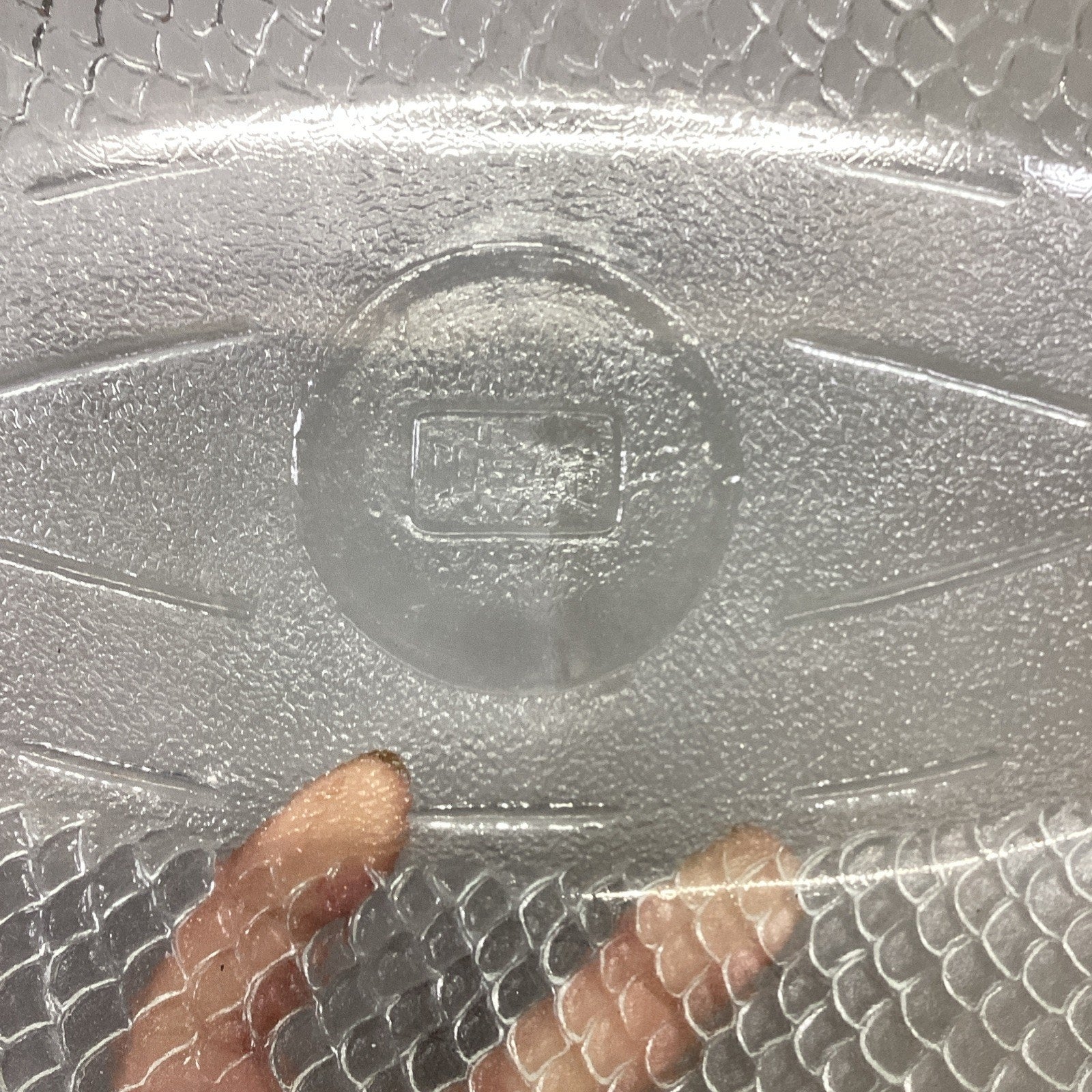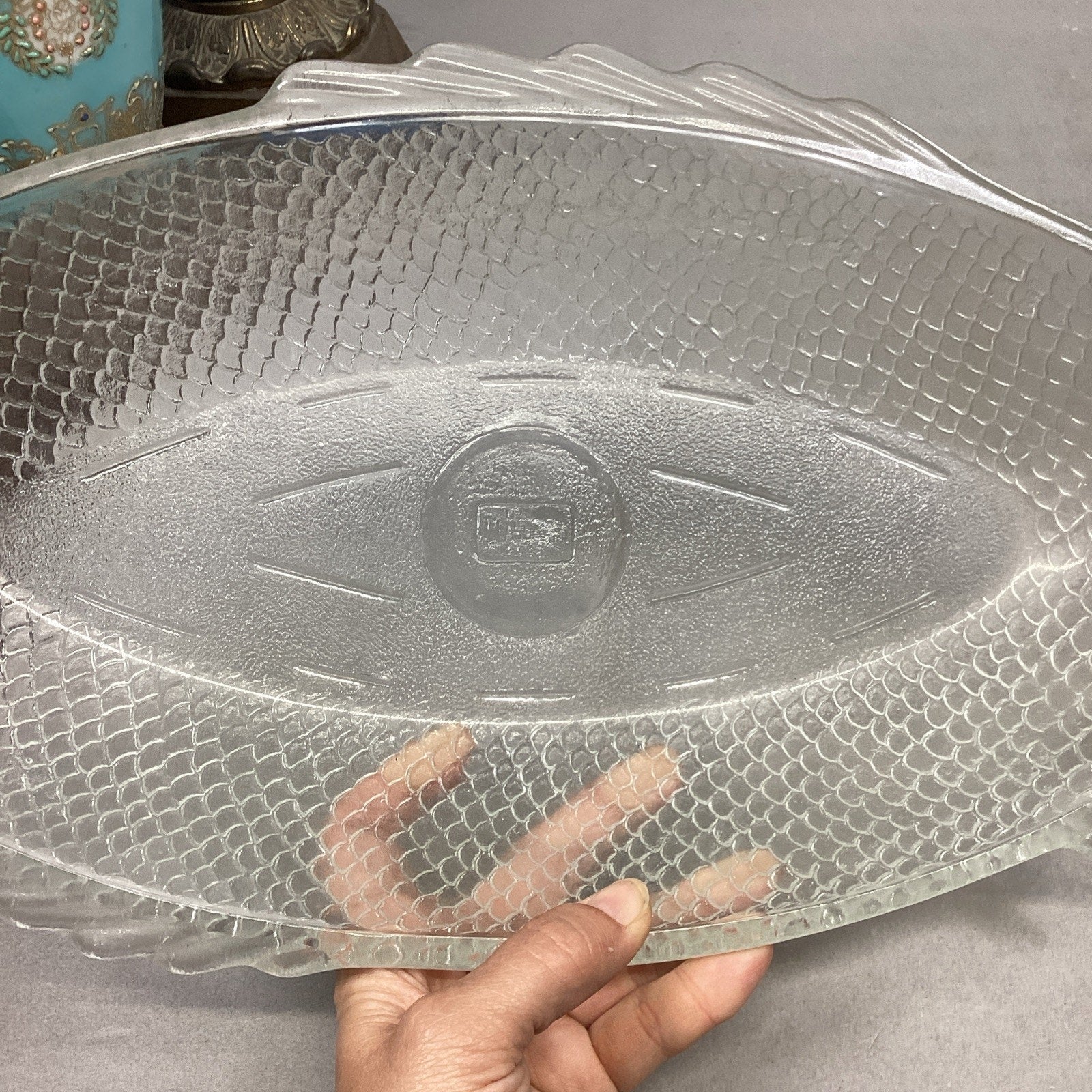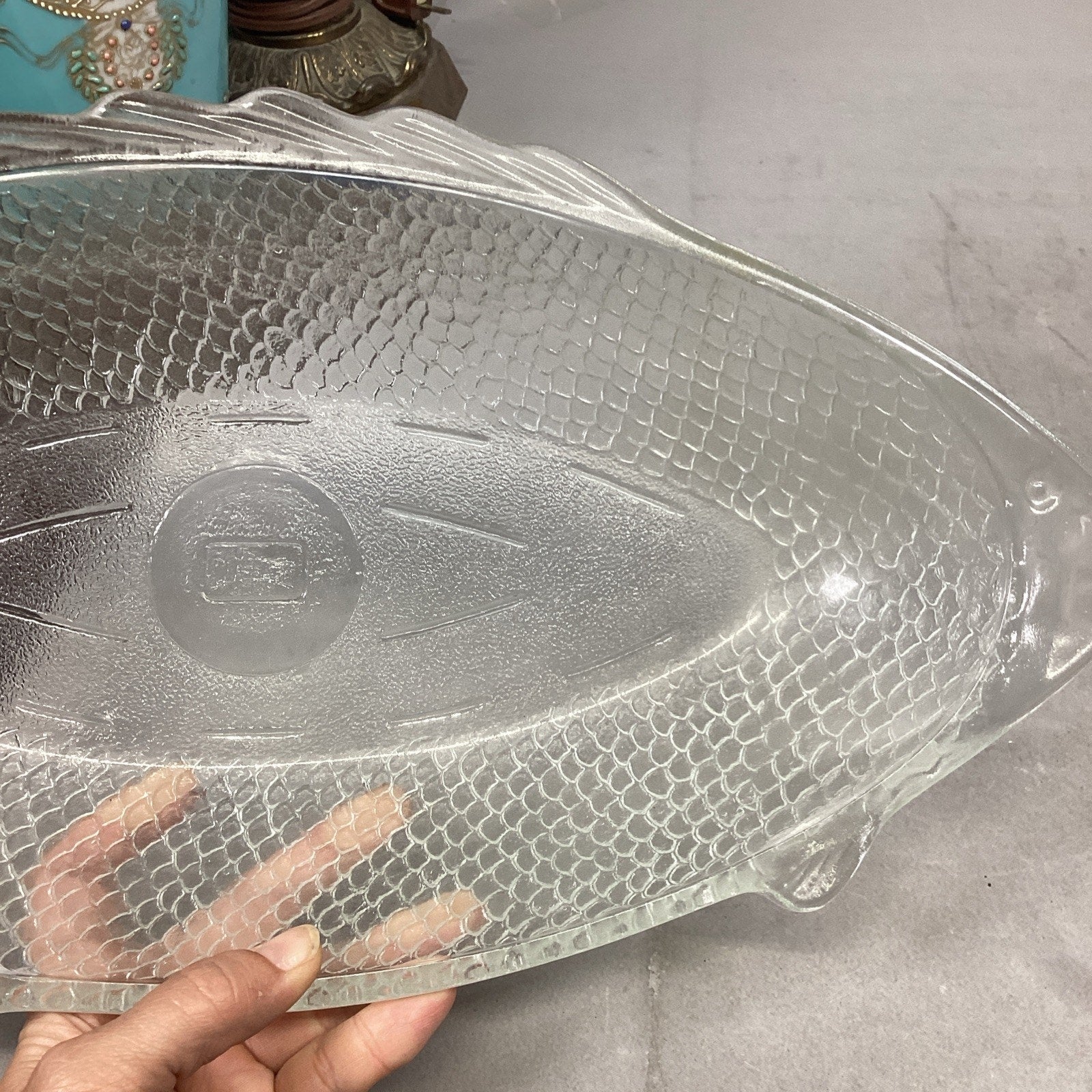 Vintage Glassbake #4141 Clear Glass Fish Shaped Baking Serving Dish - 17.75”Lx8.5”W. Made USA. The nose of the fish has a chip in it which I didn’t notice at first. It just feels rough to the touch. I took a picture of it but since it’s on the edge, it’s hard to see.