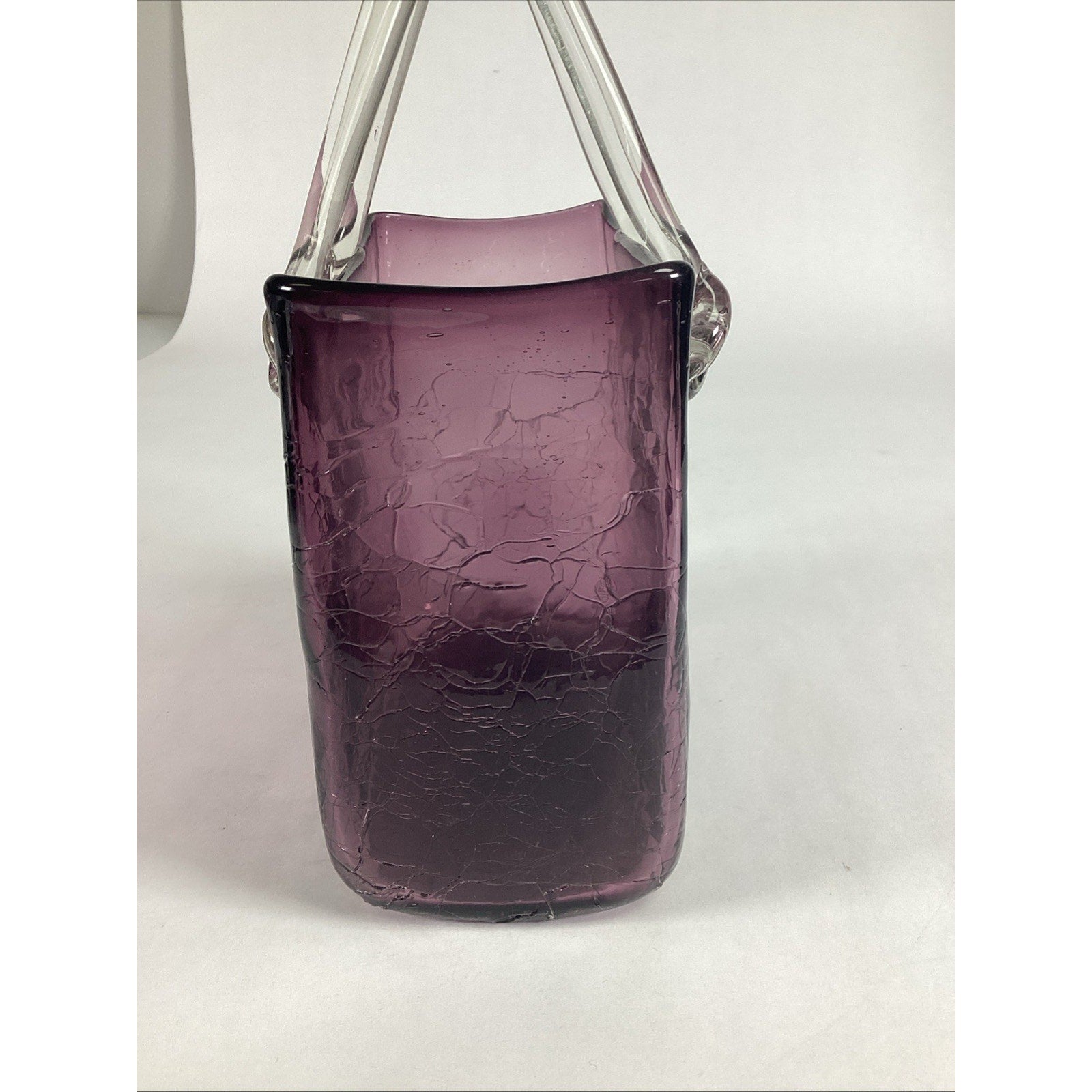 Hand Blown Crackled Glass Purple Amethyst Purse Decorative Vase. In good condition. Item measures 11”Hx7.25”Lx4”W