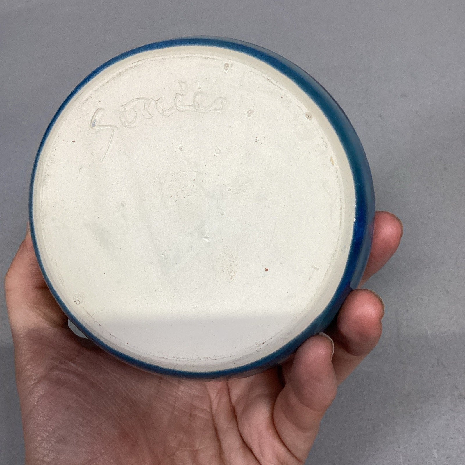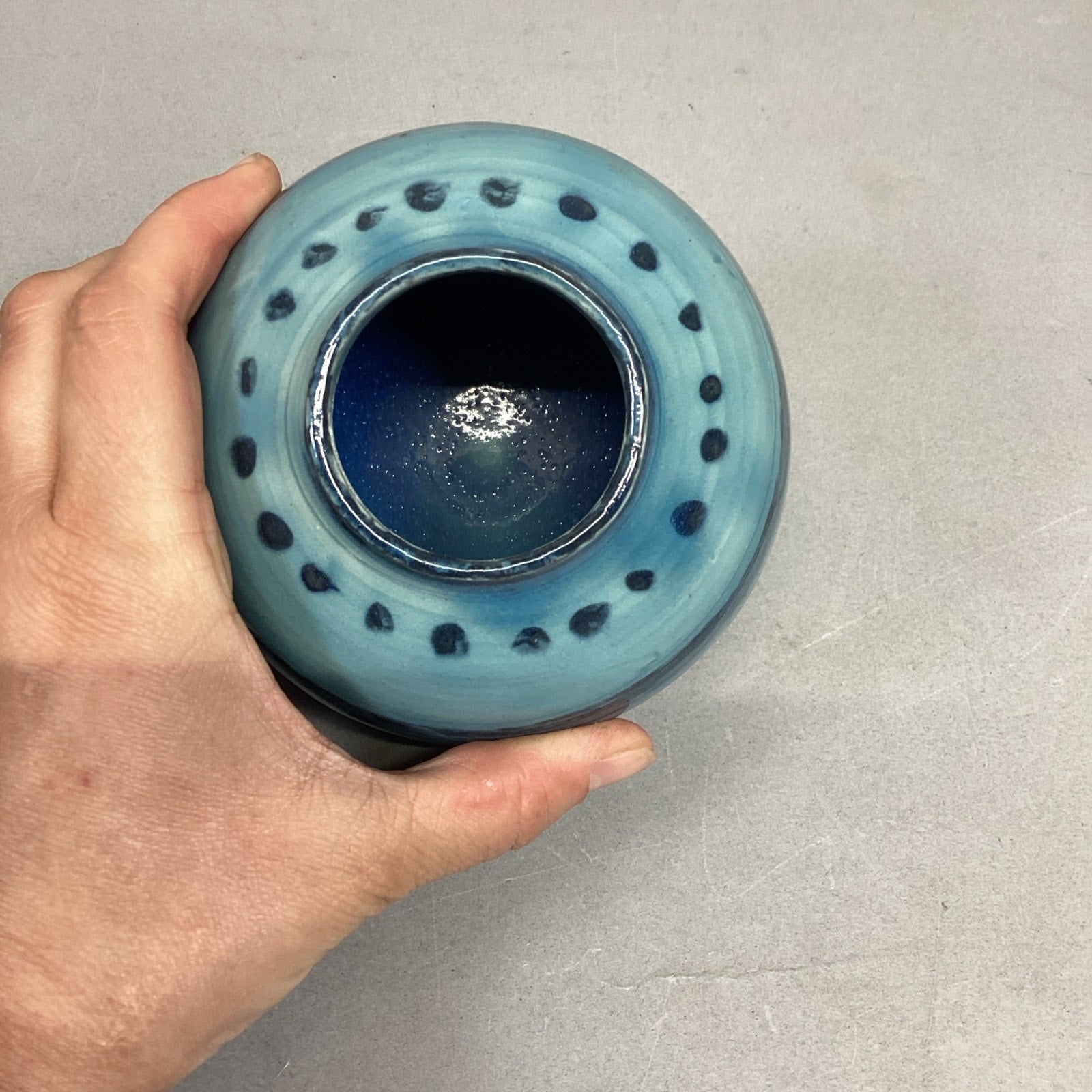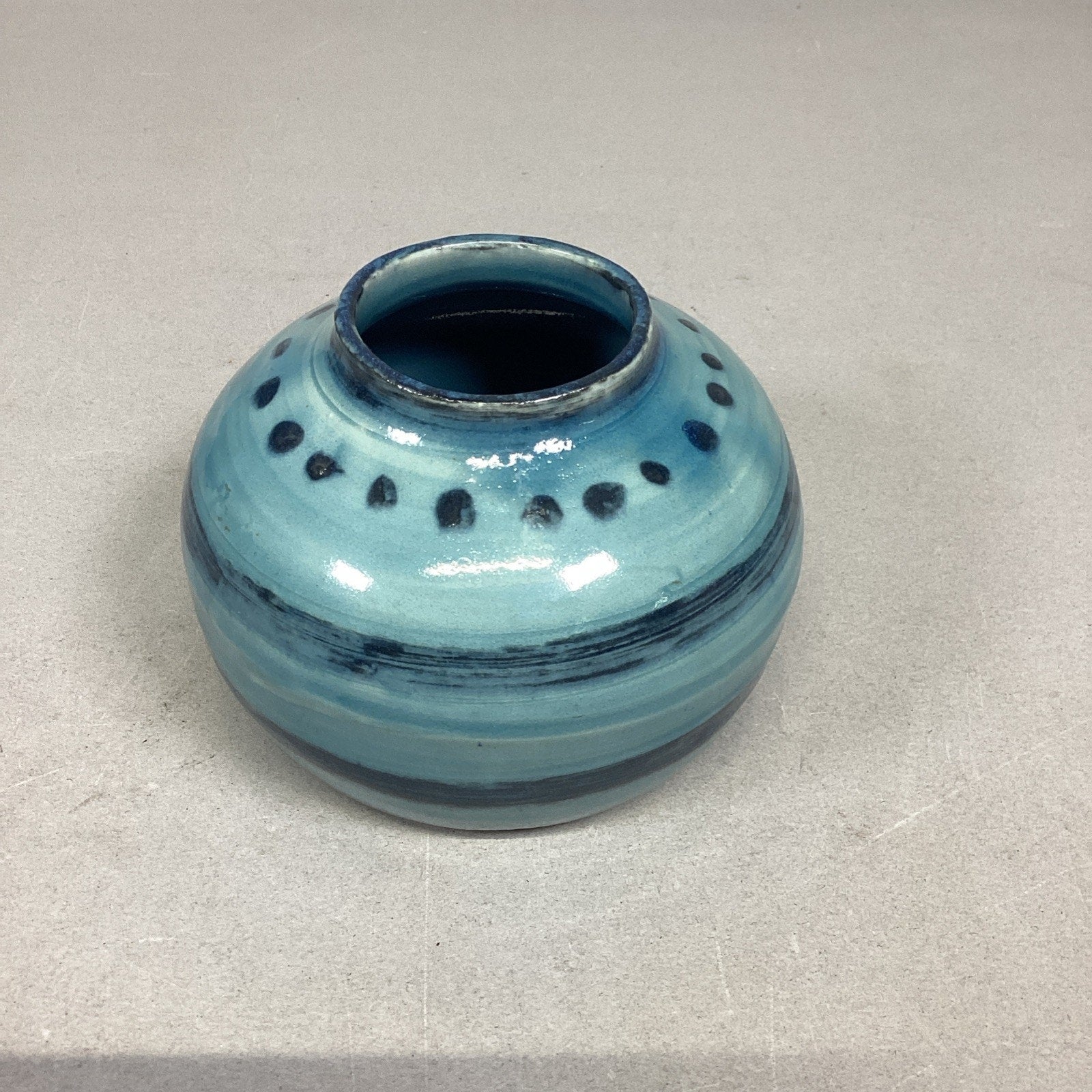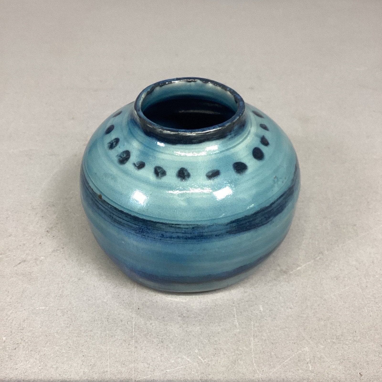 Handmade Pottery Clay Blue Stripe Vase - 3.25”Hx3.5”D. The diameter is from the base of this item. In good condition. Signed on base.