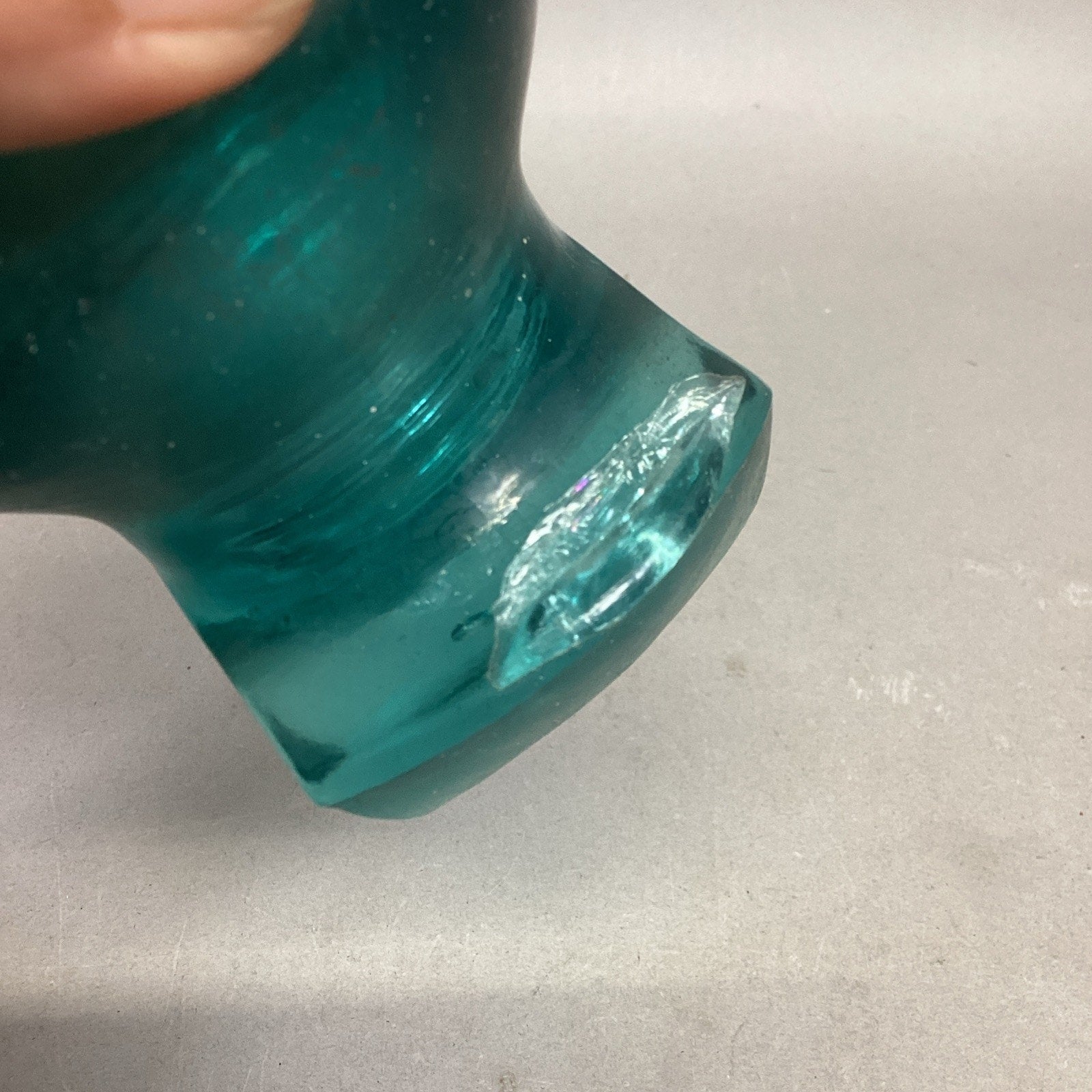 In used condition. It has what looks to be damage on the top of the one ‘foot’ but it’s smooth to the touch except for the edges. It doesn’t appear to be cracked or chipped when you feel it. There is a line that runs through the middle and you can feel it so I’m assuming it’s a hairline crack. This measures 4”Hx3”Lx3.5”D