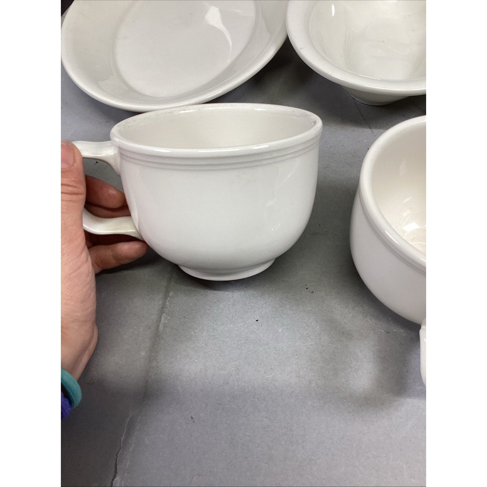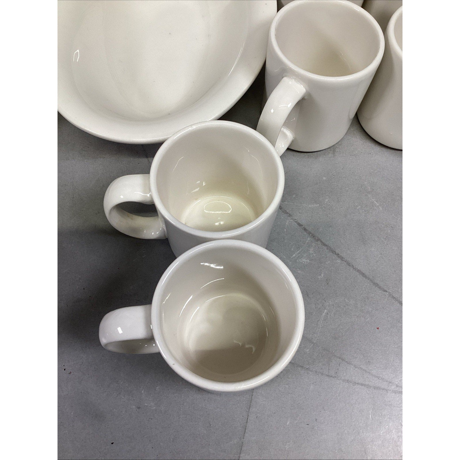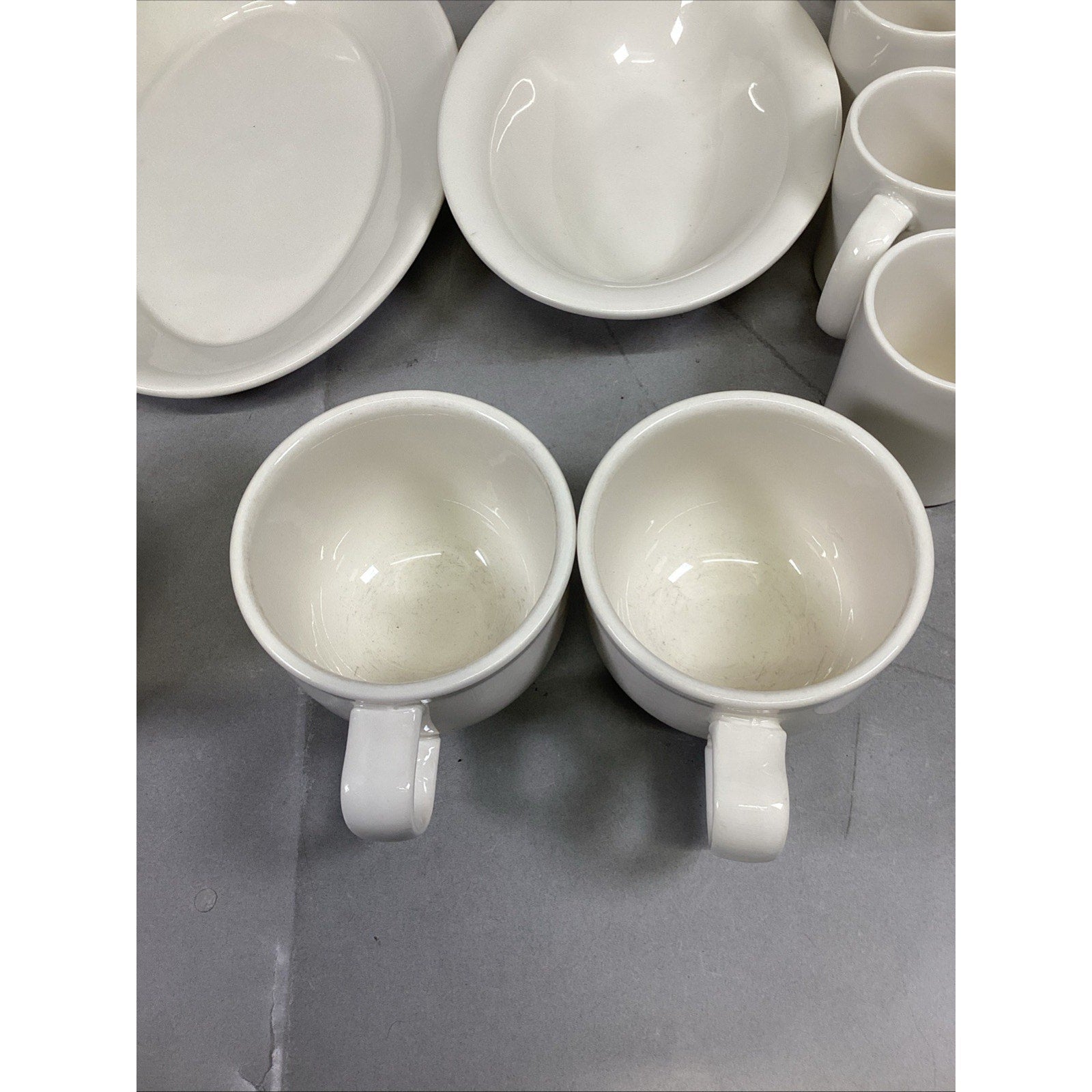 These are all in used condition. Each are in different conditions. Many have light scratches or spots on them from normal use. The 1 soup mug has a small chip.