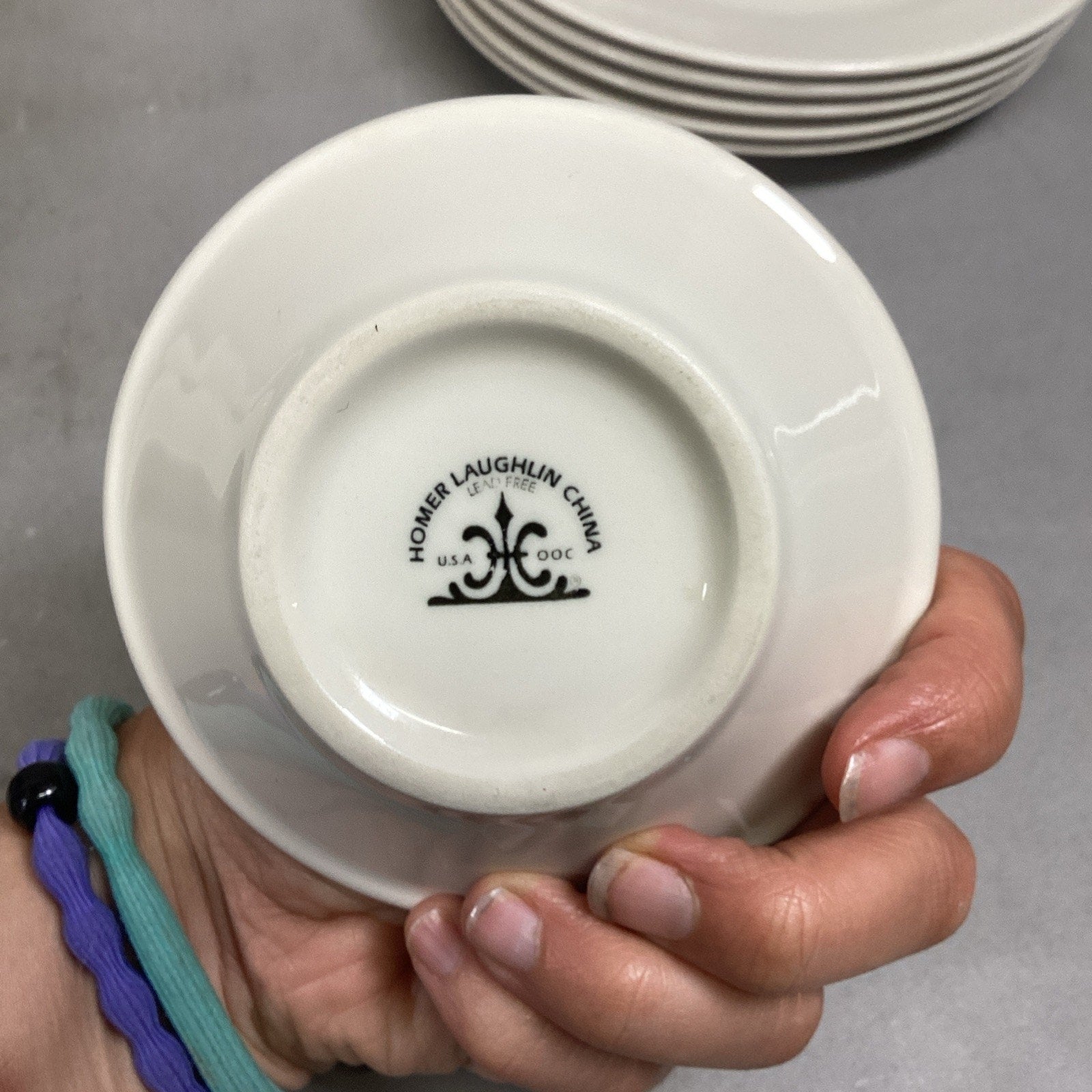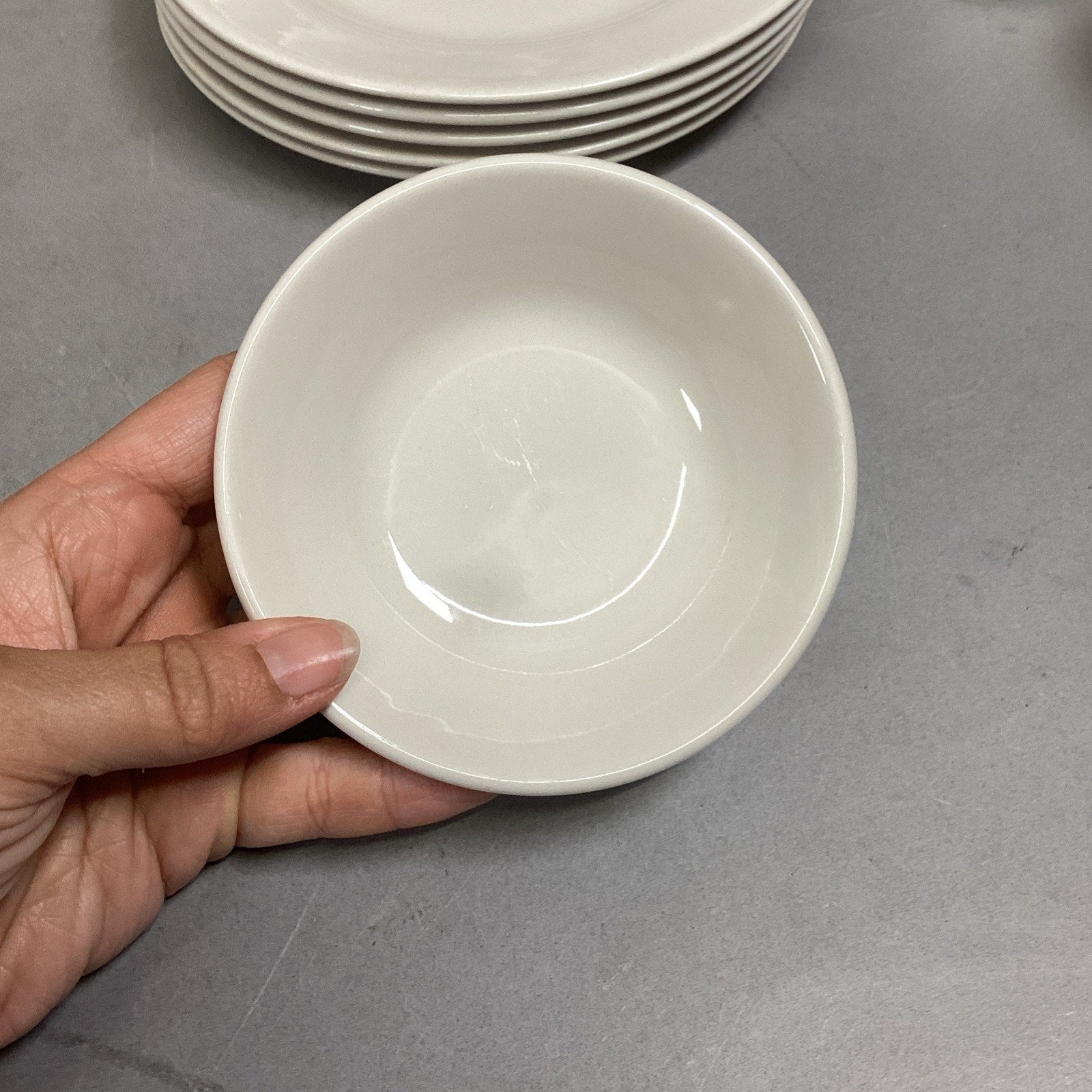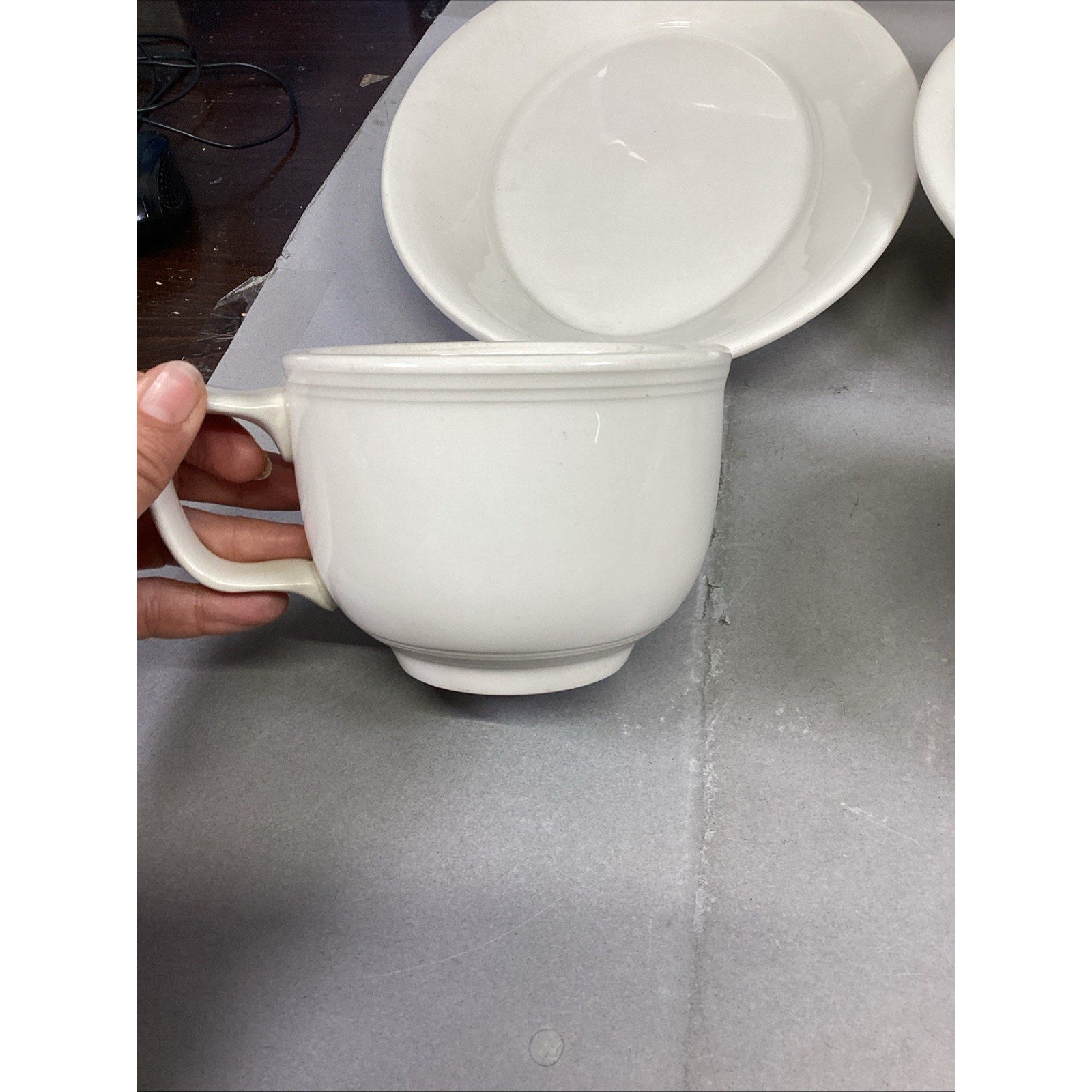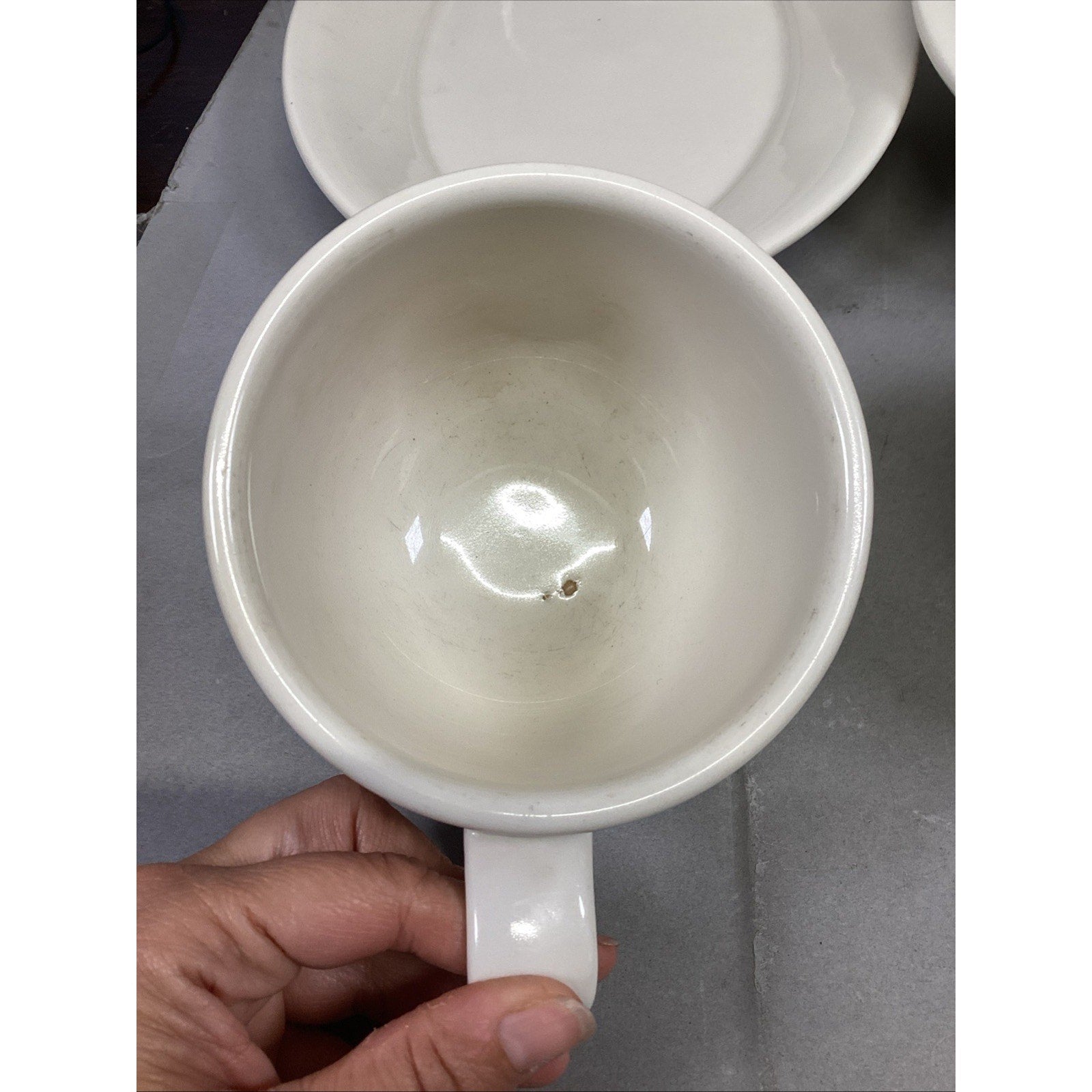 These are all in used condition. Each are in different conditions. Many have light scratches or spots on them from normal use. The 1 soup mug has a small chip.