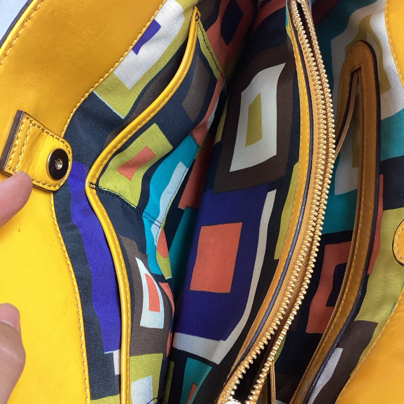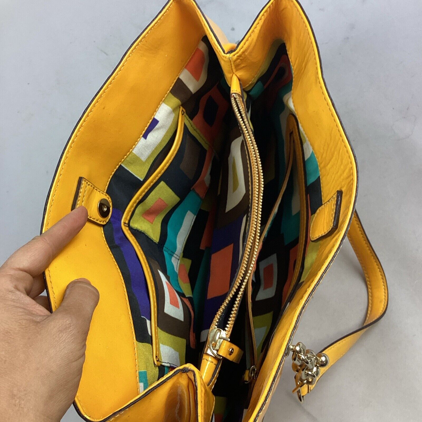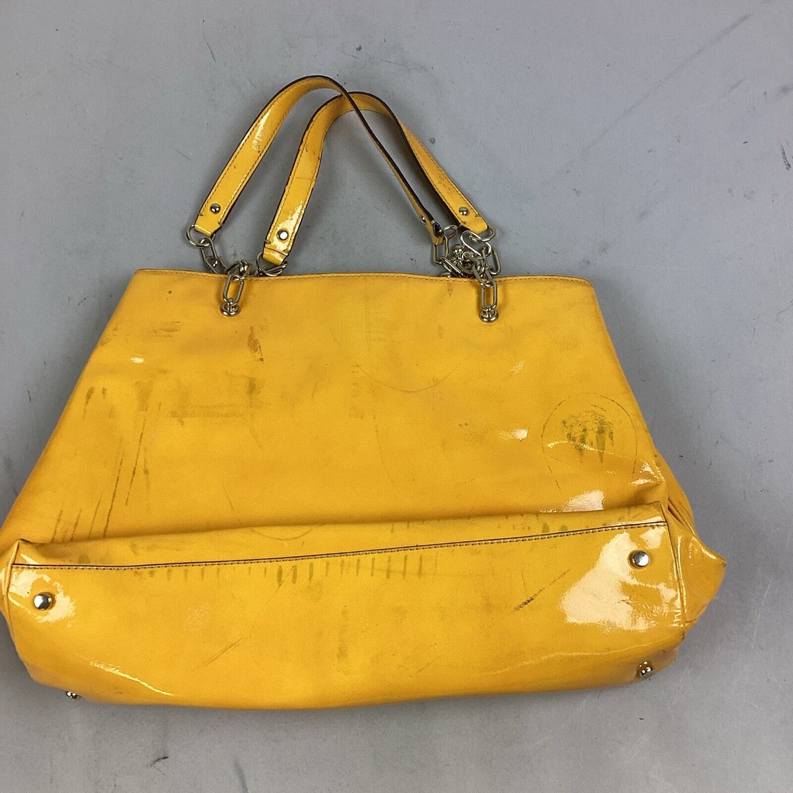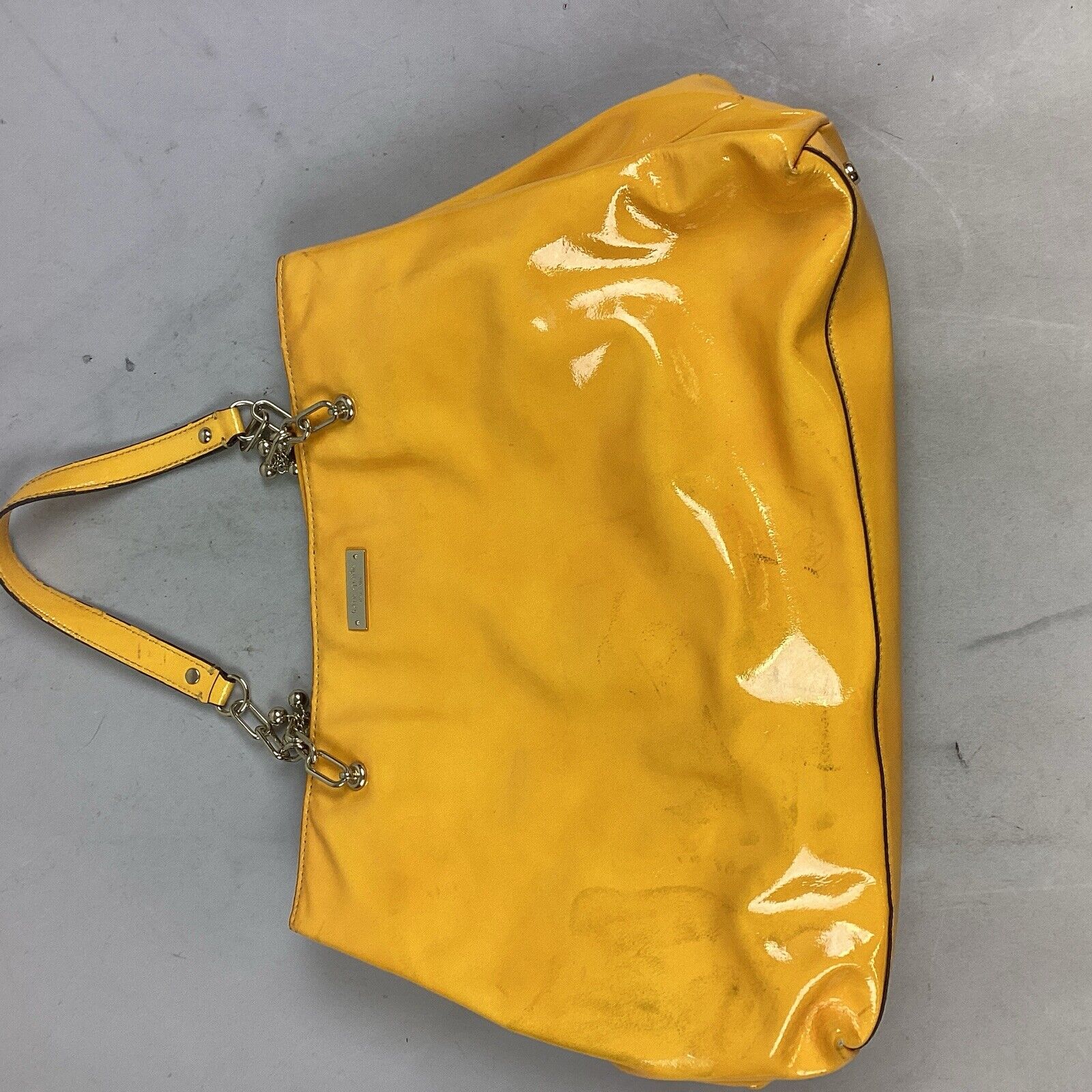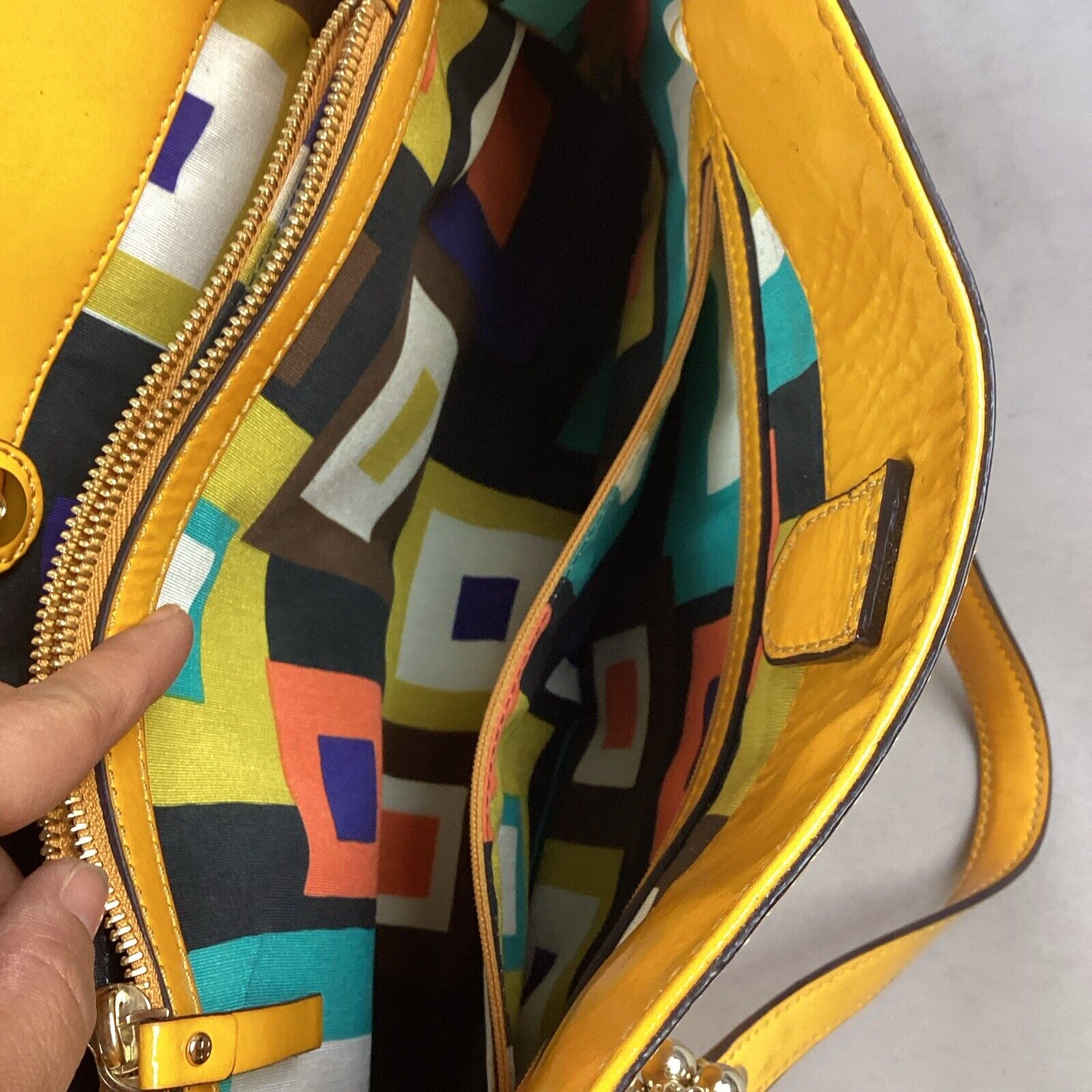 You are bidding on a Kate spade mustard yellow hand bag. It’s in pre-owned and well loved condition. There are quite a few stains and marks on the bag. With the stains as they are, I’d say it’s in poor condition. There are no rips or tears in it. There are 3 large interior compartments with 3 smaller pockets.