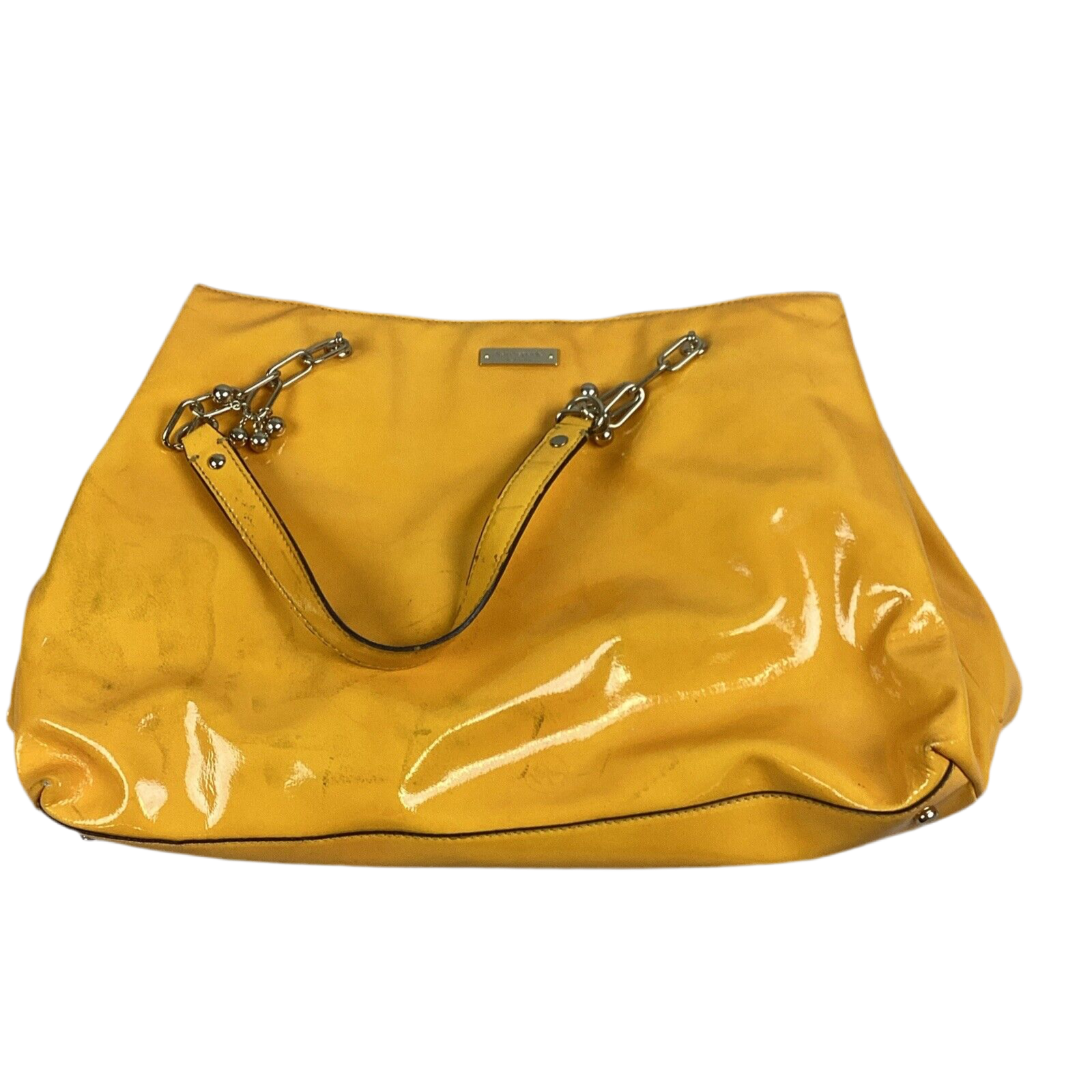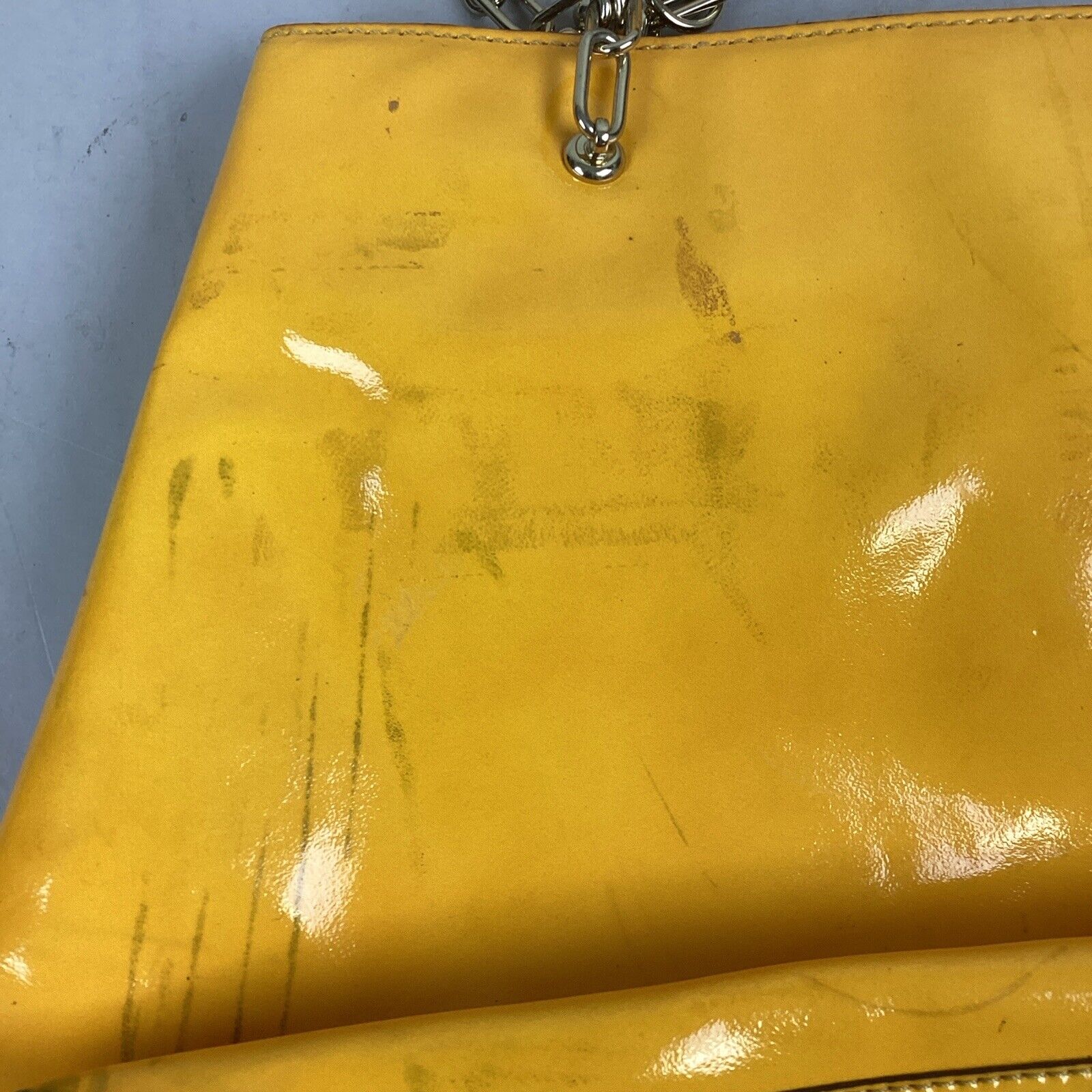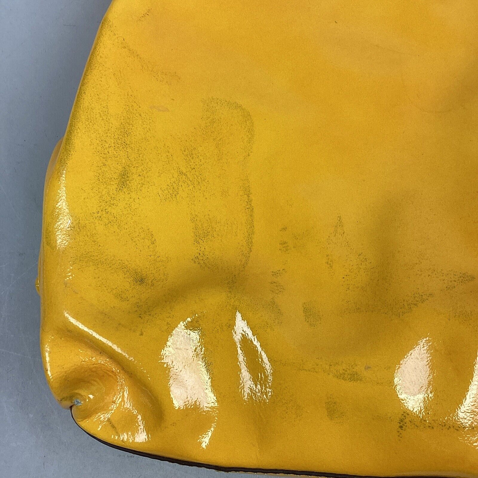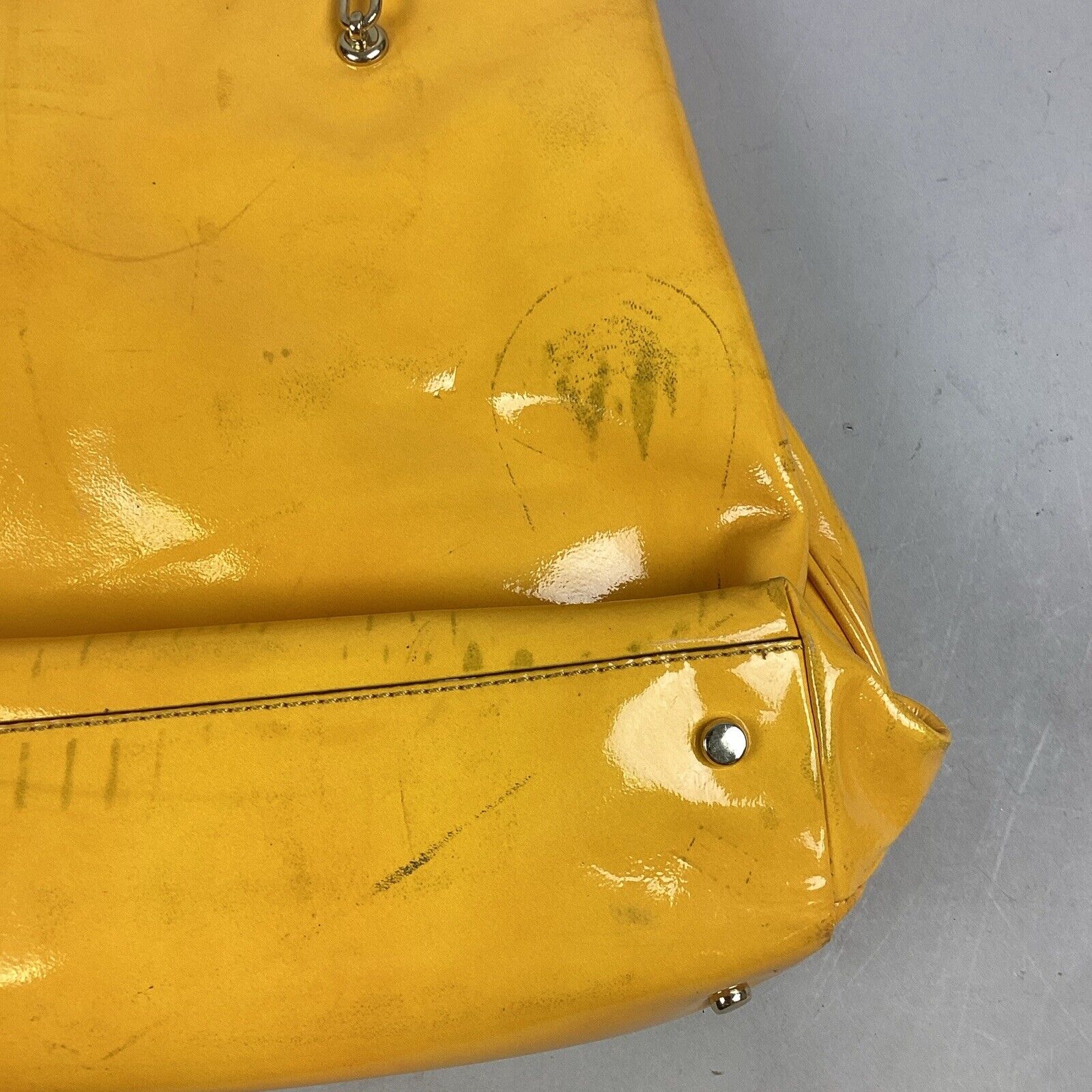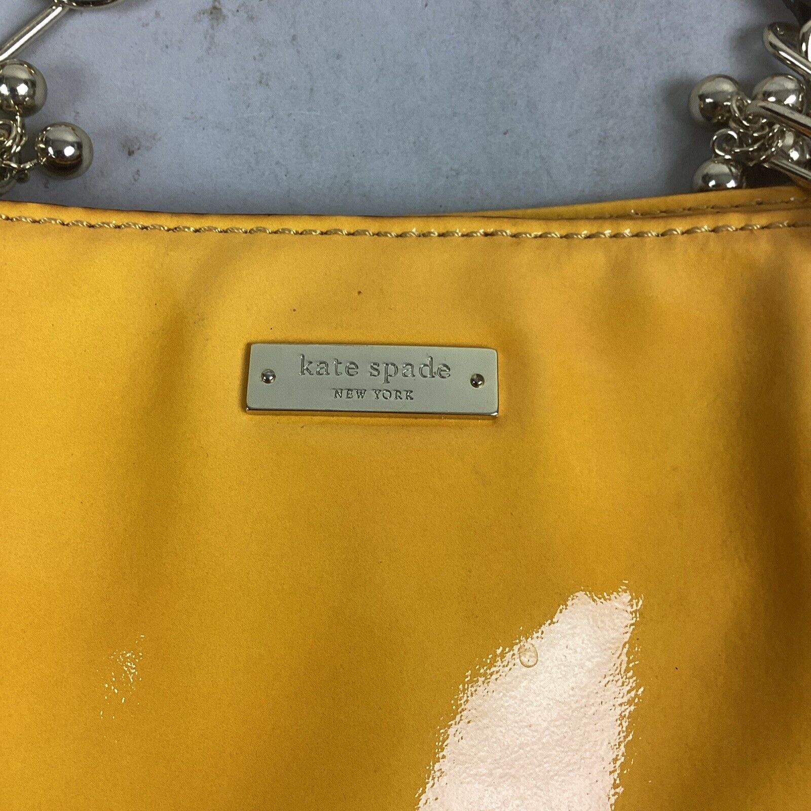 You are bidding on a Kate spade mustard yellow hand bag. It’s in pre-owned and well loved condition. There are quite a few stains and marks on the bag. With the stains as they are, I’d say it’s in poor condition. There are no rips or tears in it. There are 3 large interior compartments with 3 smaller pockets.