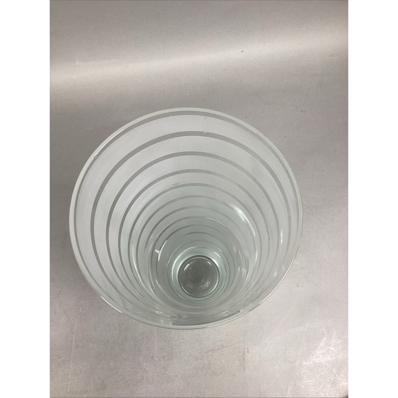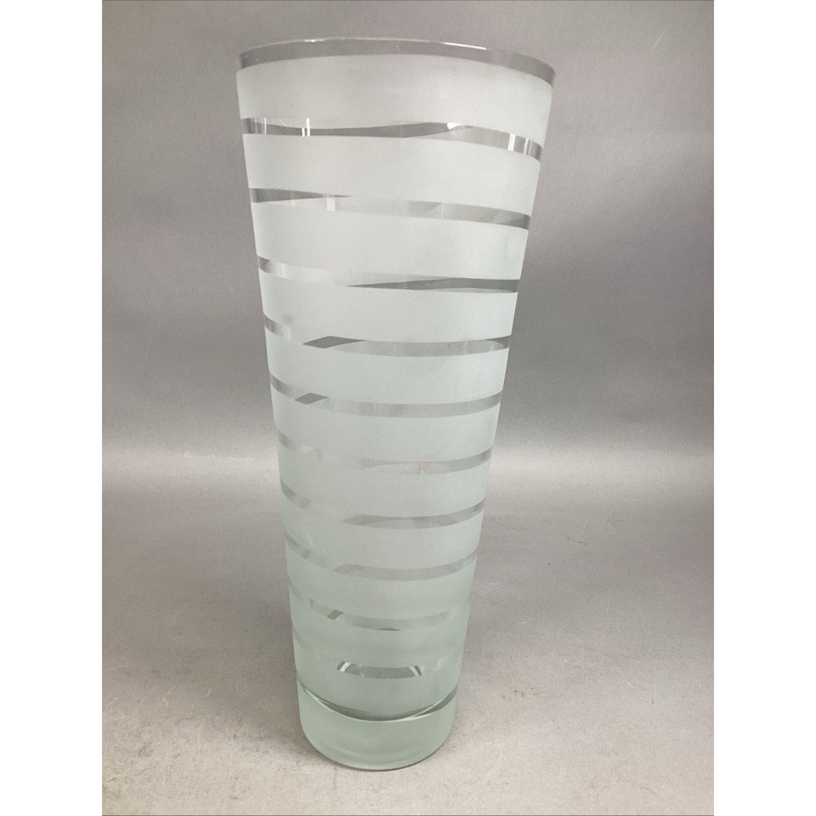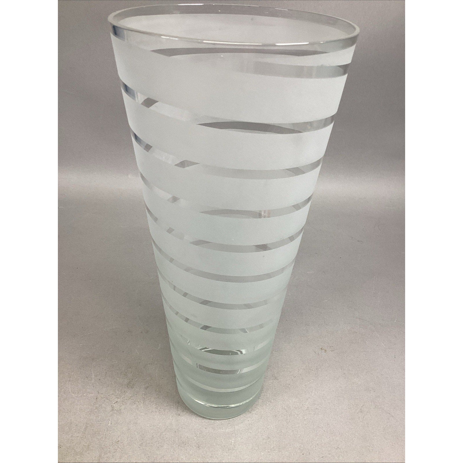 Large Glass Striped Vase - 13 1/4”H. In mostly good condition. There are few very small chips in the glass on the top edge. Tried taking pictures of them, but most pictures came out too blurry. The stripes are frosted. There are some marks and scratches on the vase as well.