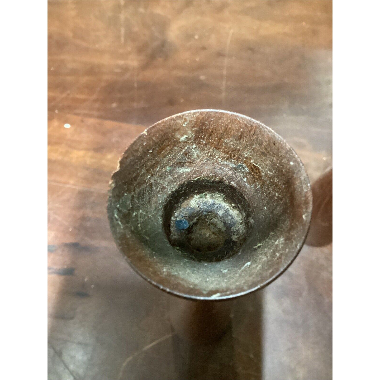 These are in fair condition. Both have scratches and the one has a chip on the top edge. These are wooden and measure 12.5” tall.