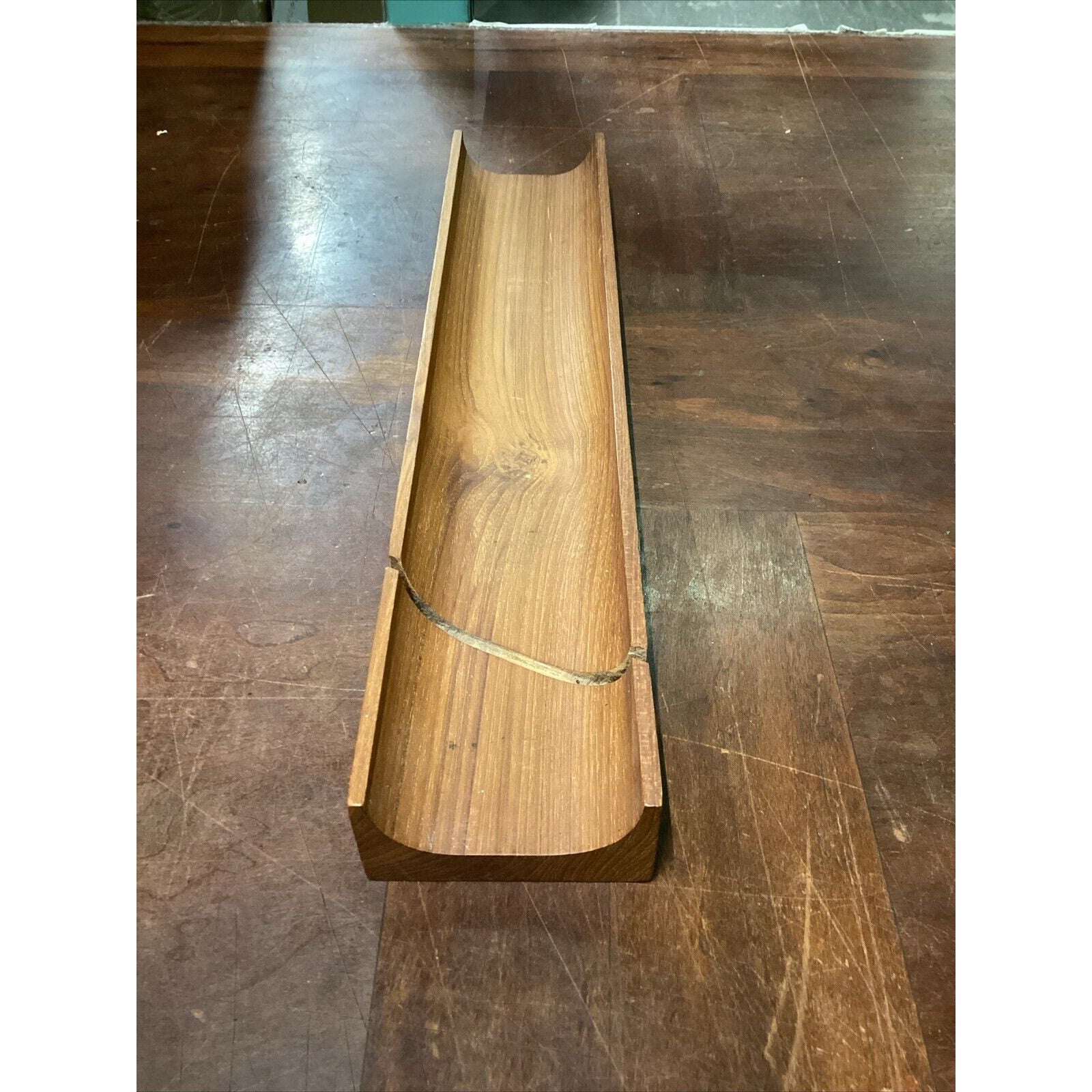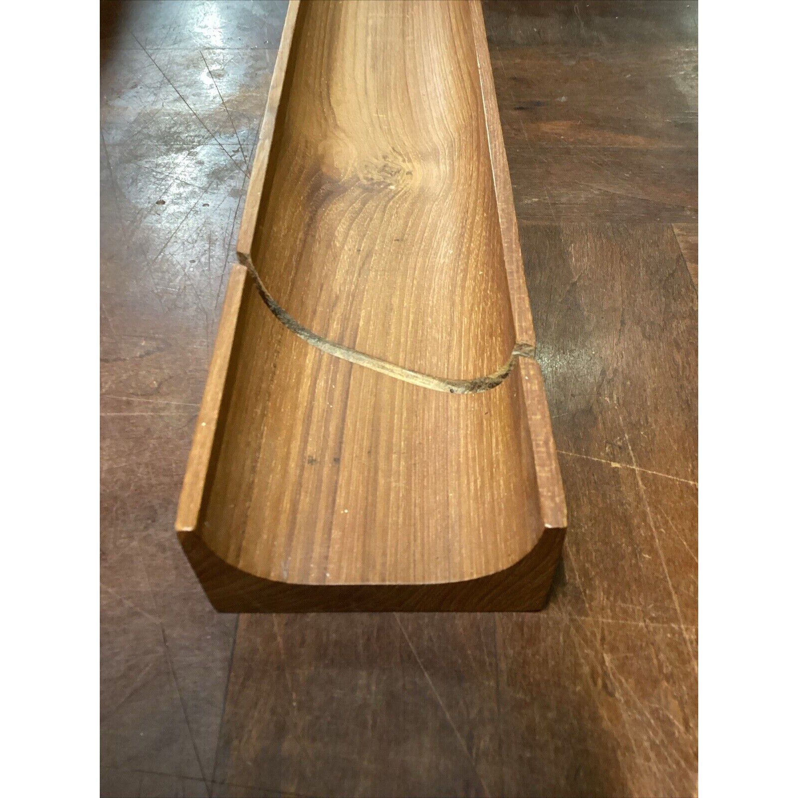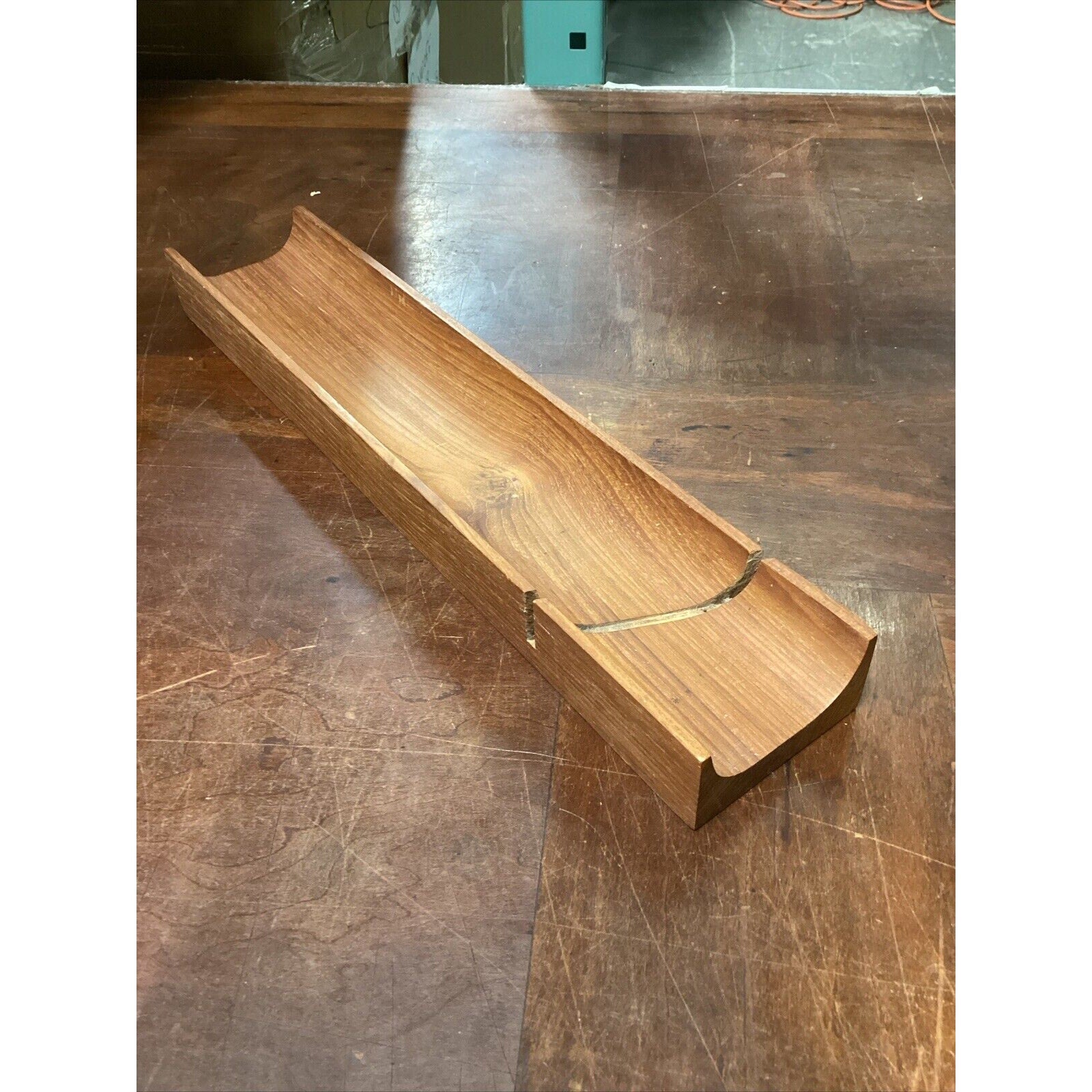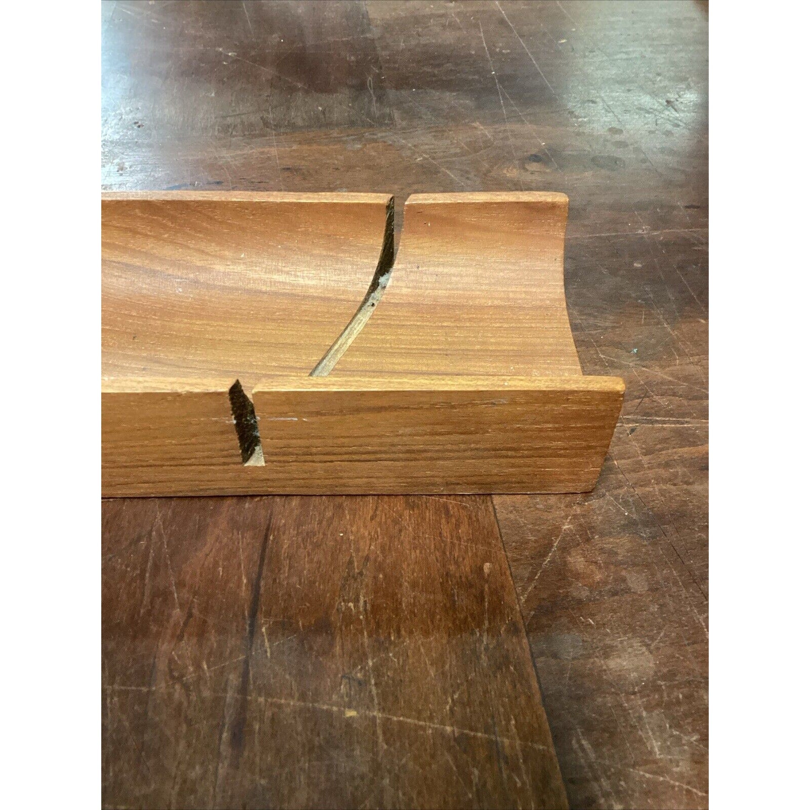 You are bidding on a solid teak French bread holder. In good condition for its age. It does have a few marks, stains, spots in the wood from normal usage. This measures 2”Hx17.5”Lx3.5”W