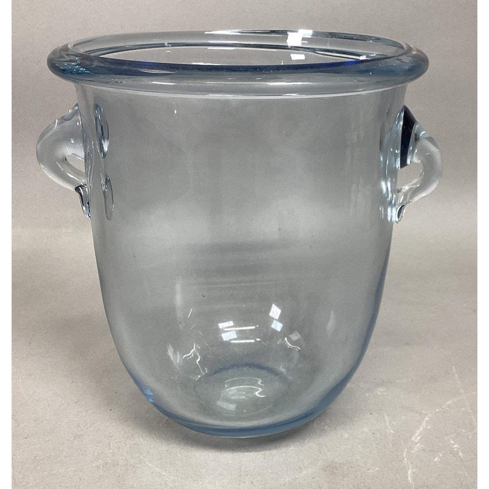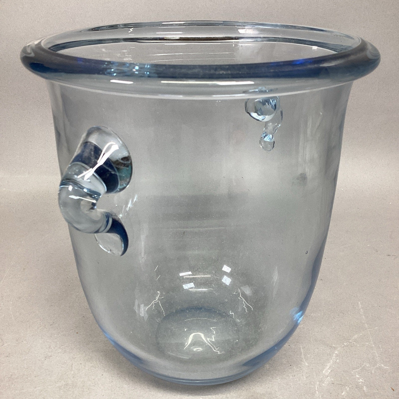 Mid Century Modern Blue Glass Ice Bucket With 2 Handles - 8.25”Hx7”D. This is a solid item. In good condition overall. There are a few marks and dust on the interior. This weighs 4 pounds.