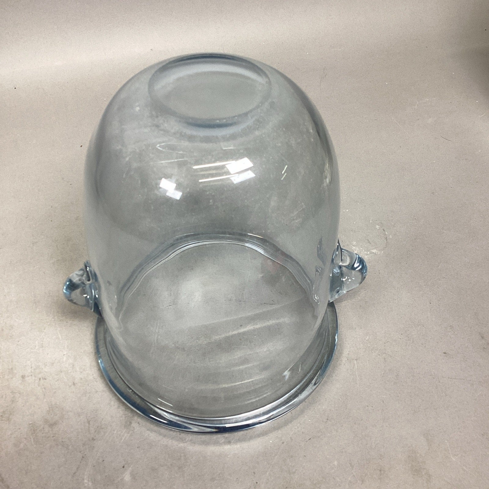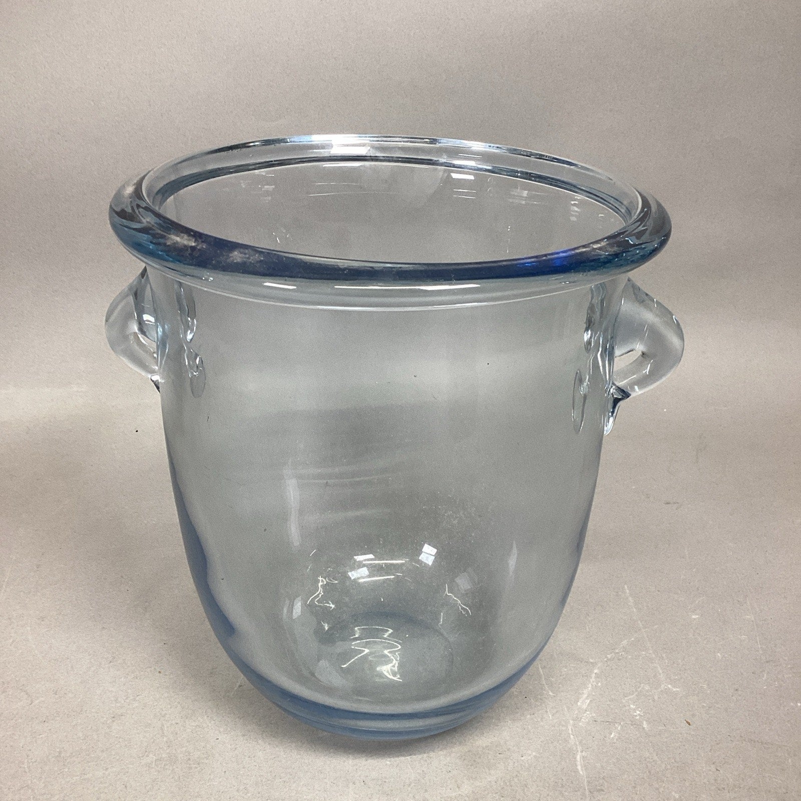 Mid Century Modern Blue Glass Ice Bucket With 2 Handles - 8.25”Hx7”D. This is a solid item. In good condition overall. There are a few marks and dust on the interior. This weighs 4 pounds.