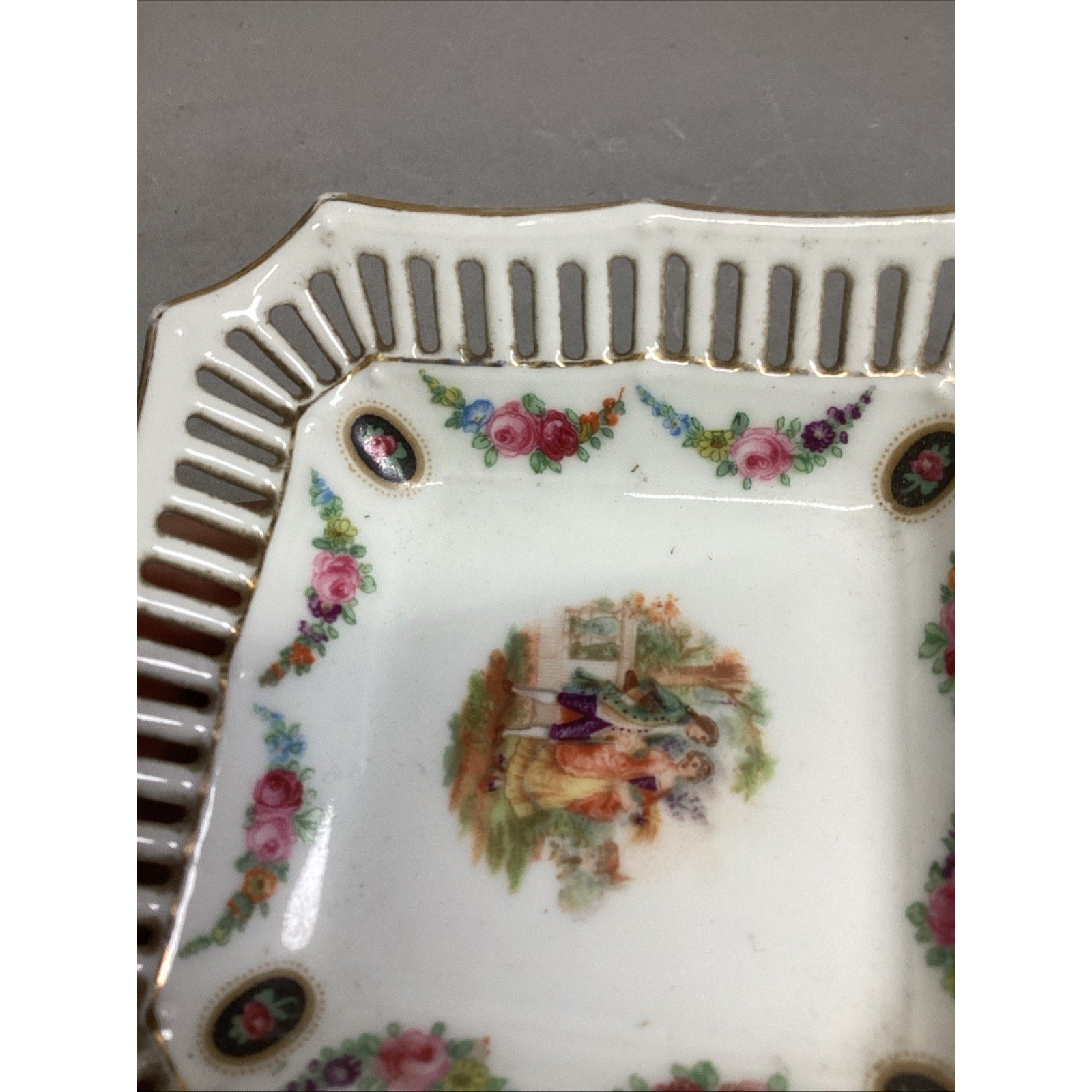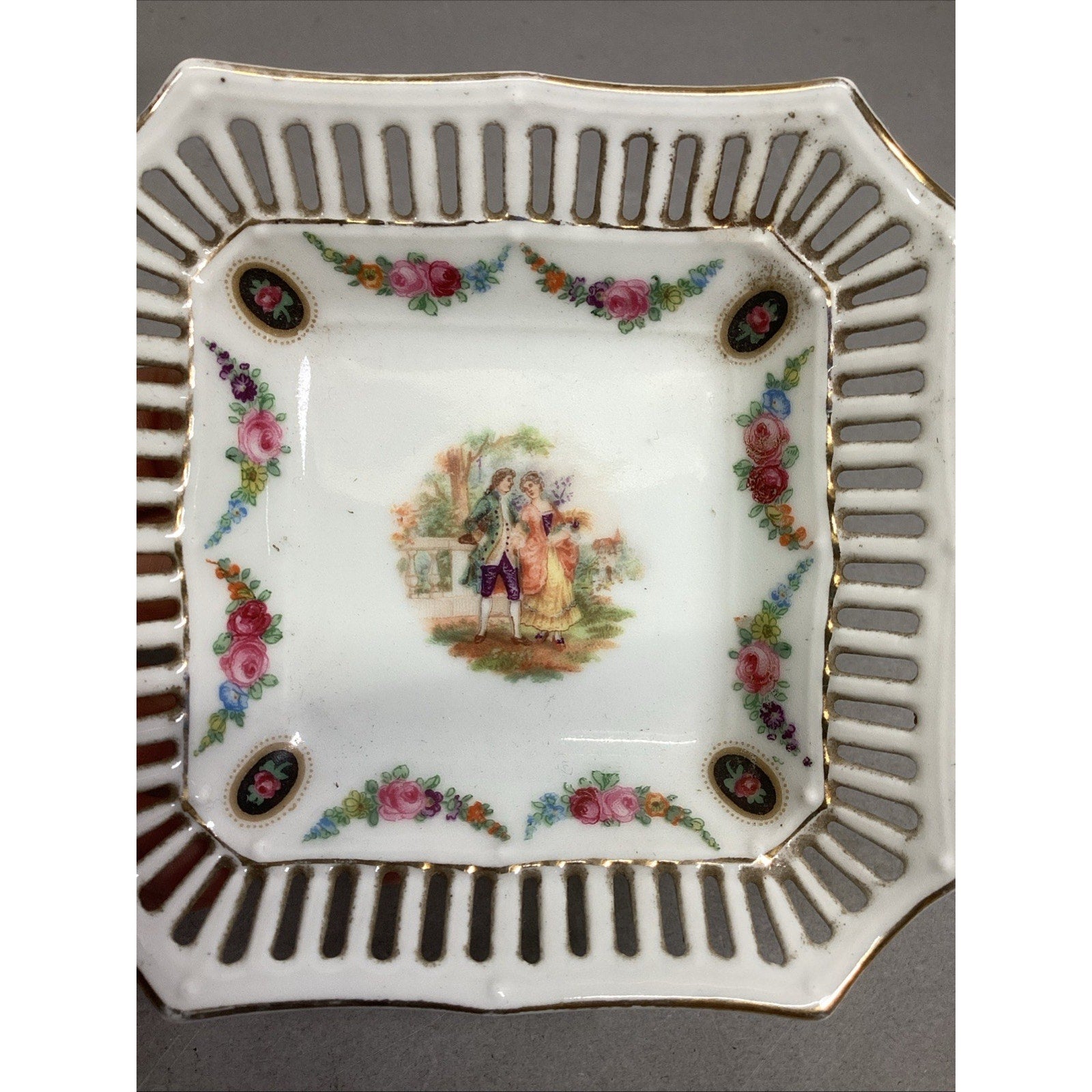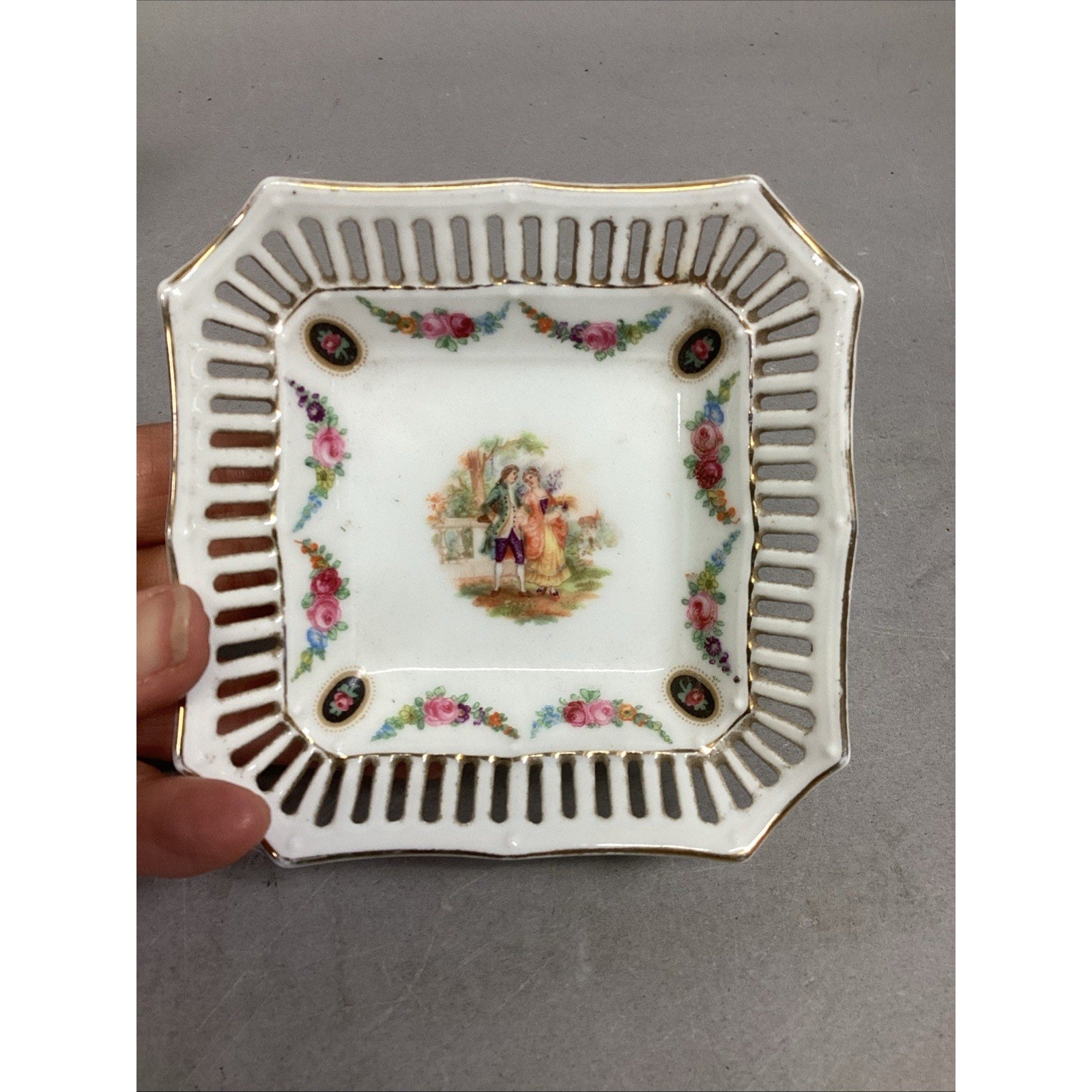 2. Bavarian Schumann Candy or trinket dish with gold trim. Made in Germany. Features a couple courting. In good condition with no cracks or chips. Measures 4”Dx1”H