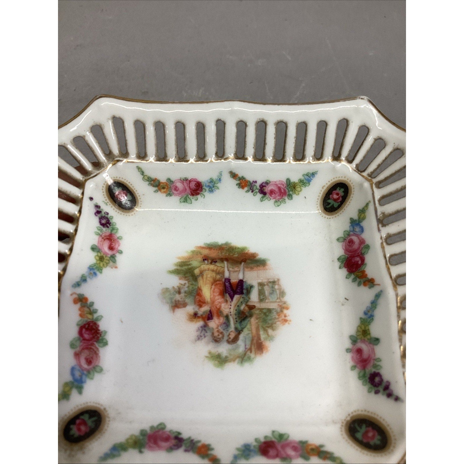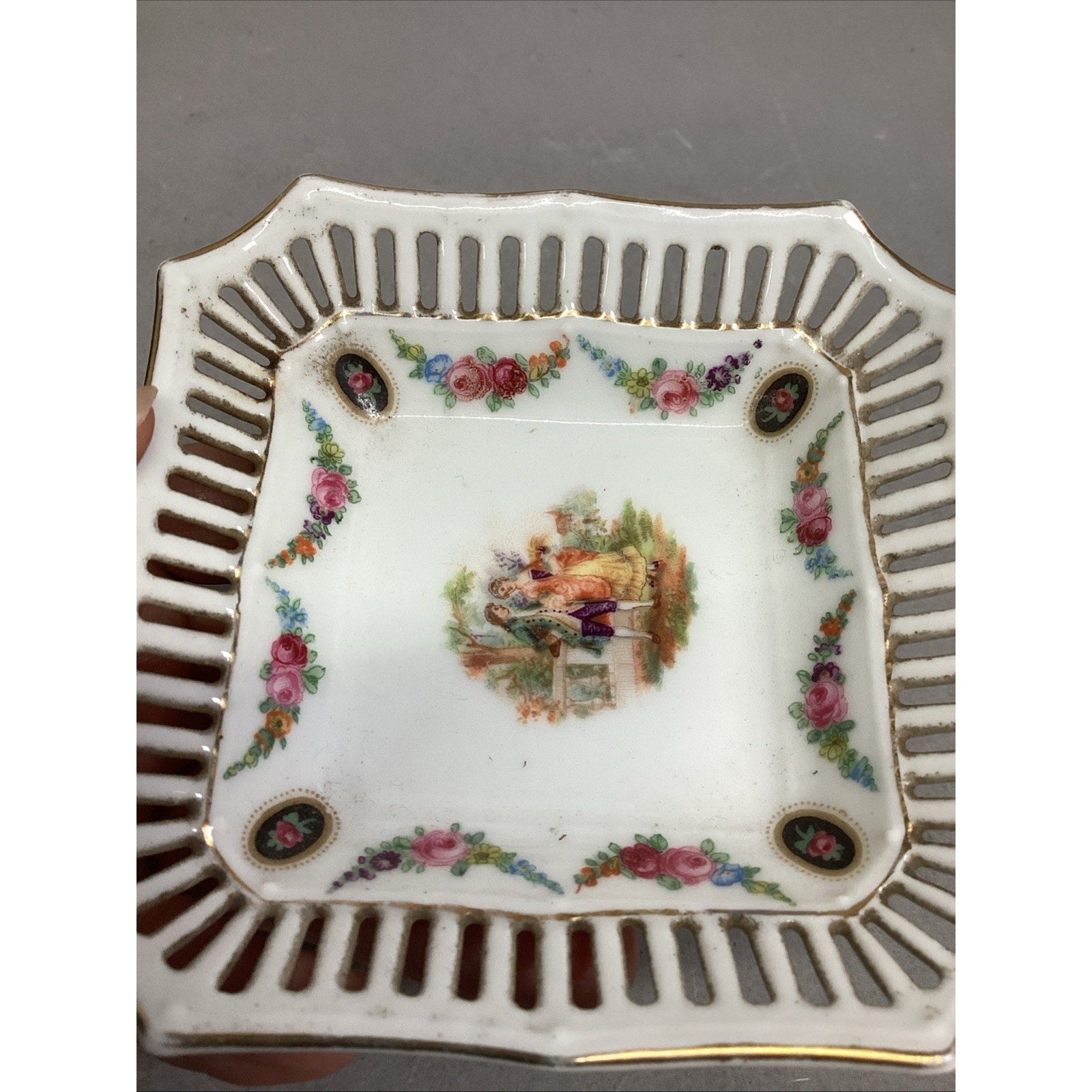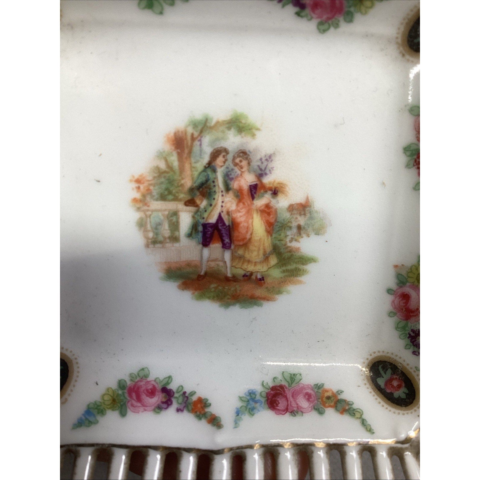2. Bavarian Schumann Candy or trinket dish with gold trim. Made in Germany. Features a couple courting. In good condition with no cracks or chips. Measures 4”Dx1”H