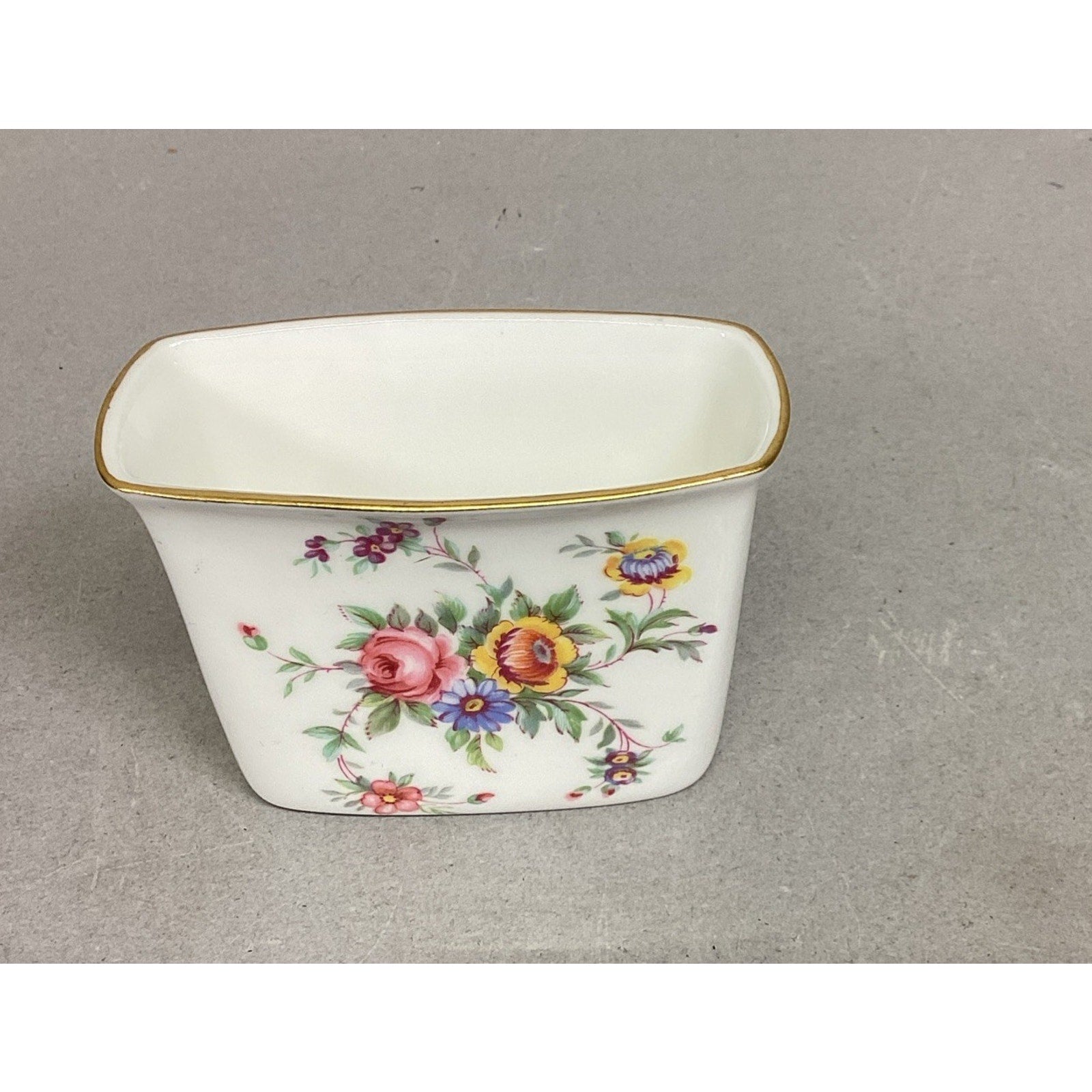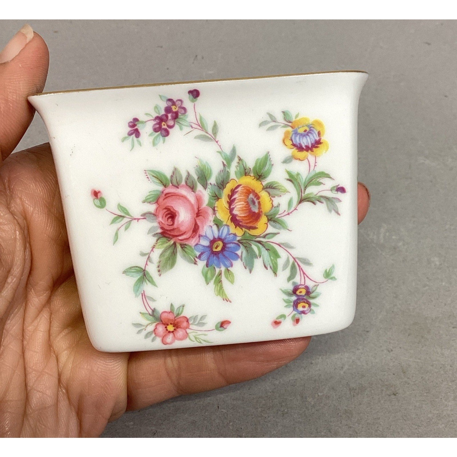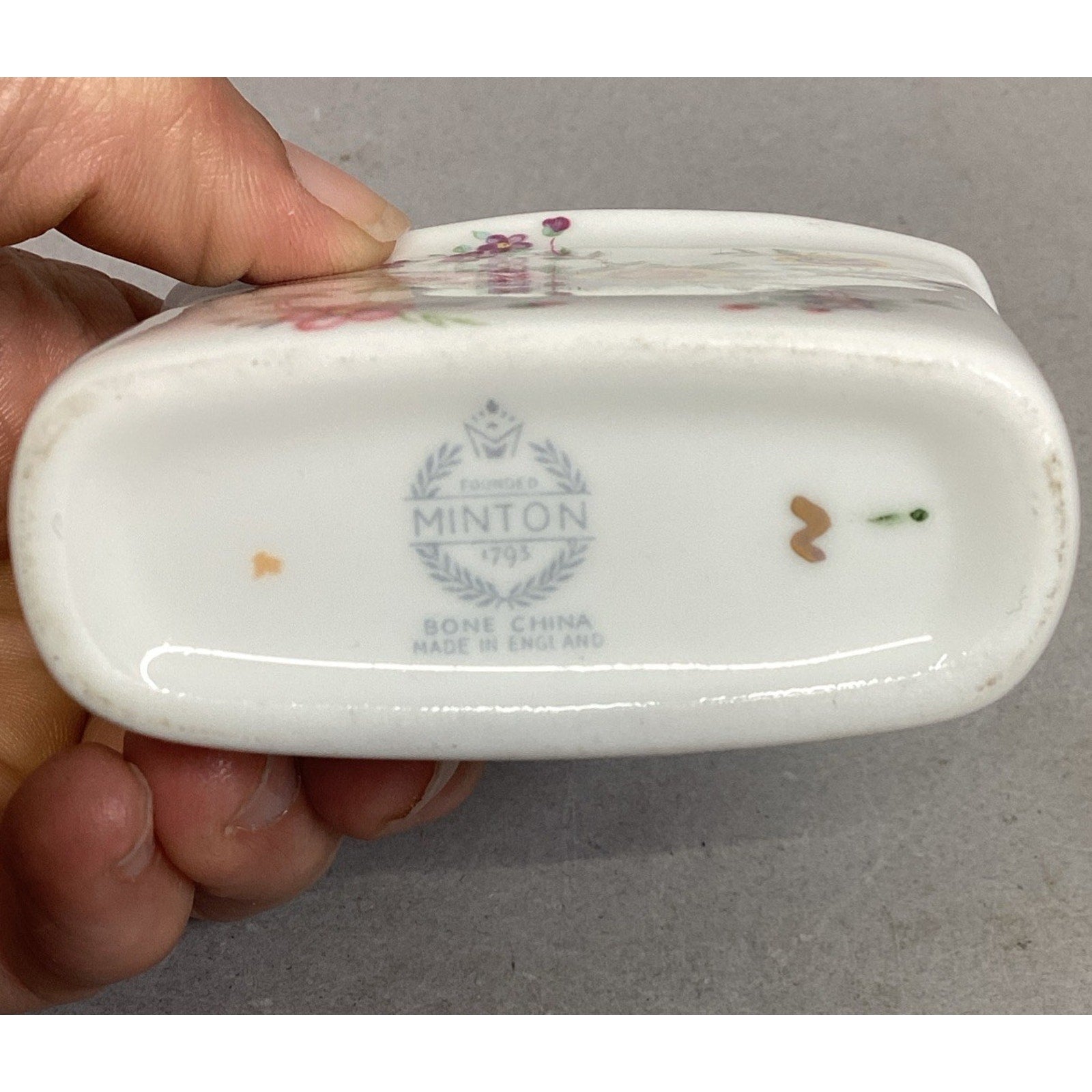 1. Minton floral toothpick holder. Made of Bone China and made in England. Good condition. No cracks or chips. A few stains. Measures 3x1.5x2.25”. Features gold trim around the edges.