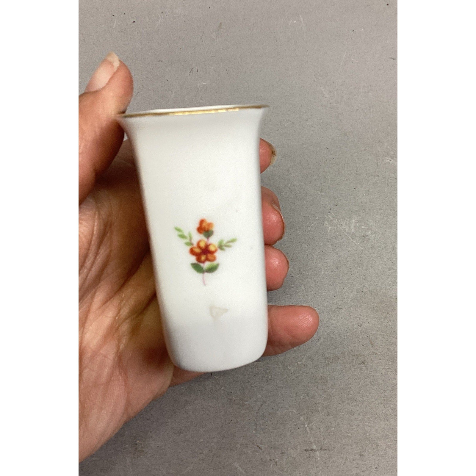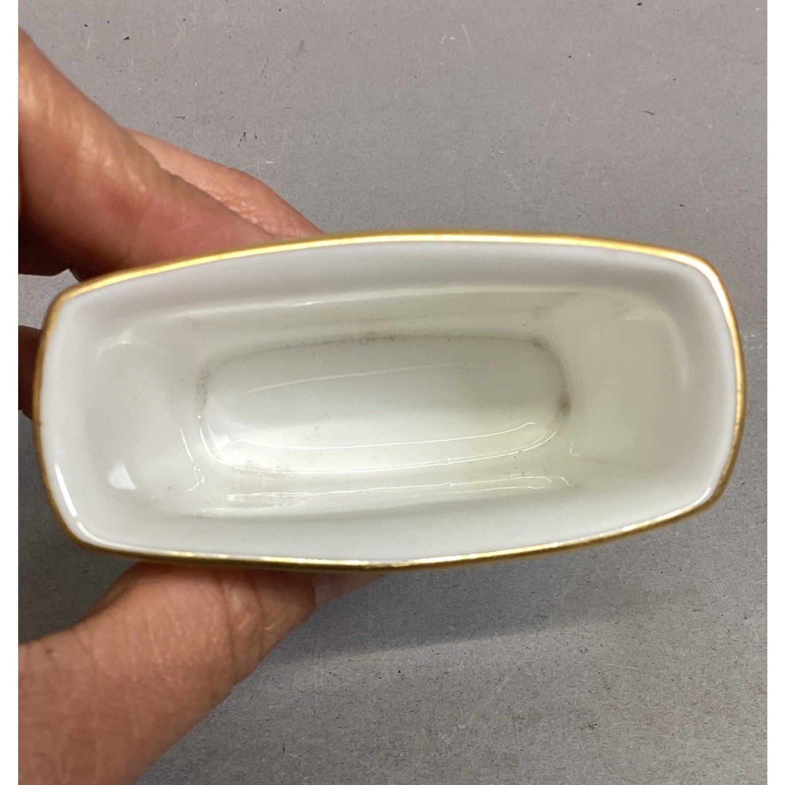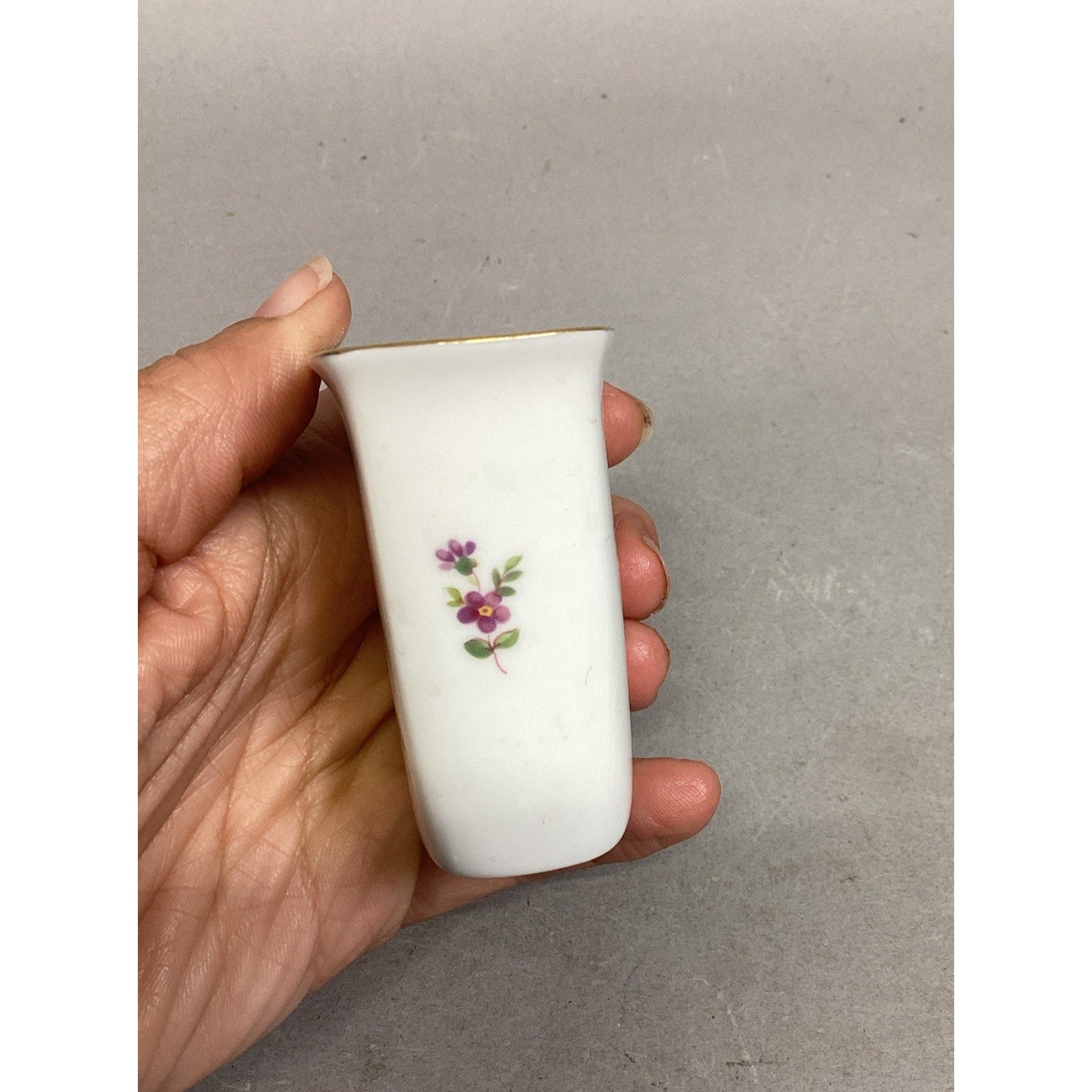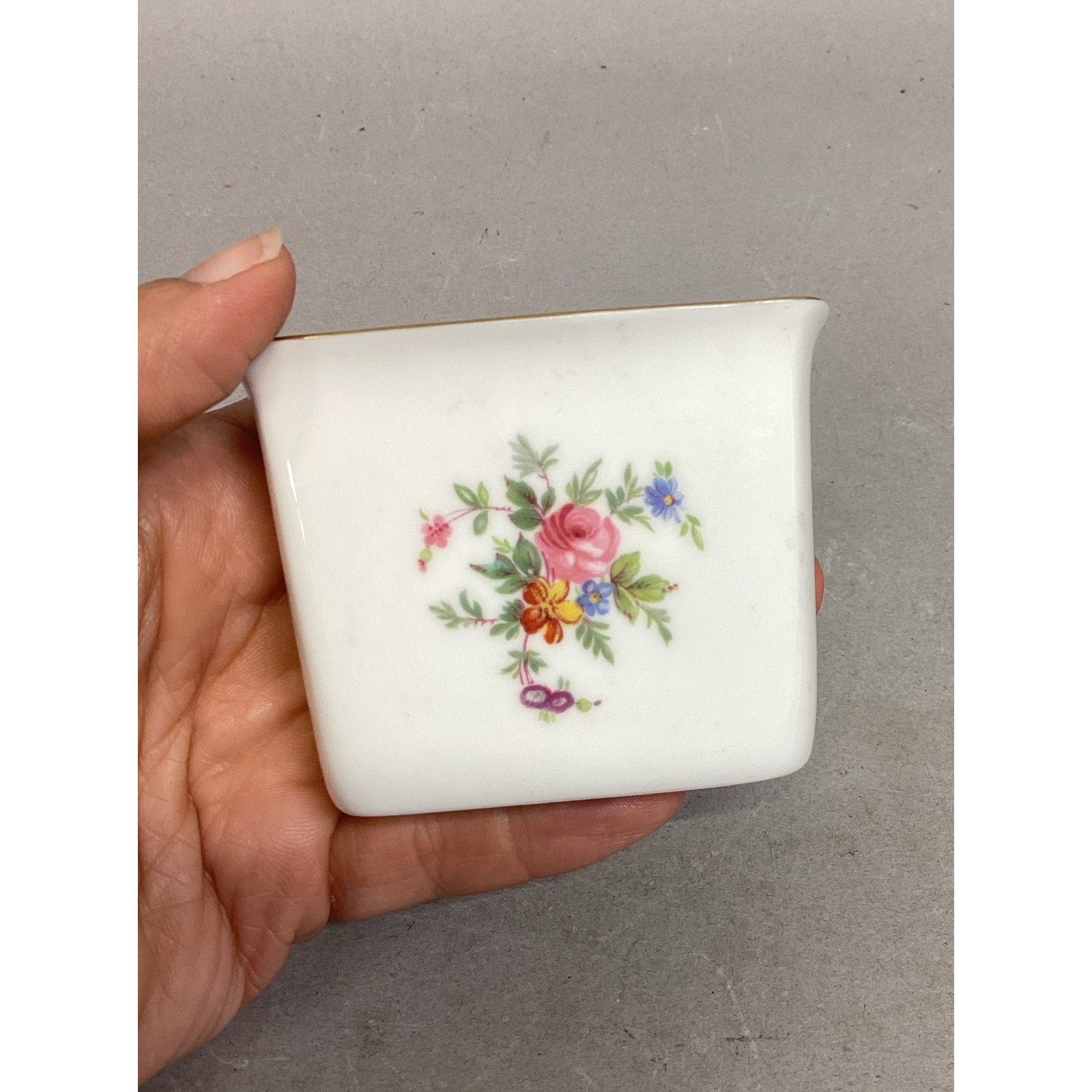 1. Minton floral toothpick holder. Made of Bone China and made in England. Good condition. No cracks or chips. A few stains. Measures 3x1.5x2.25”. Features gold trim around the edges.