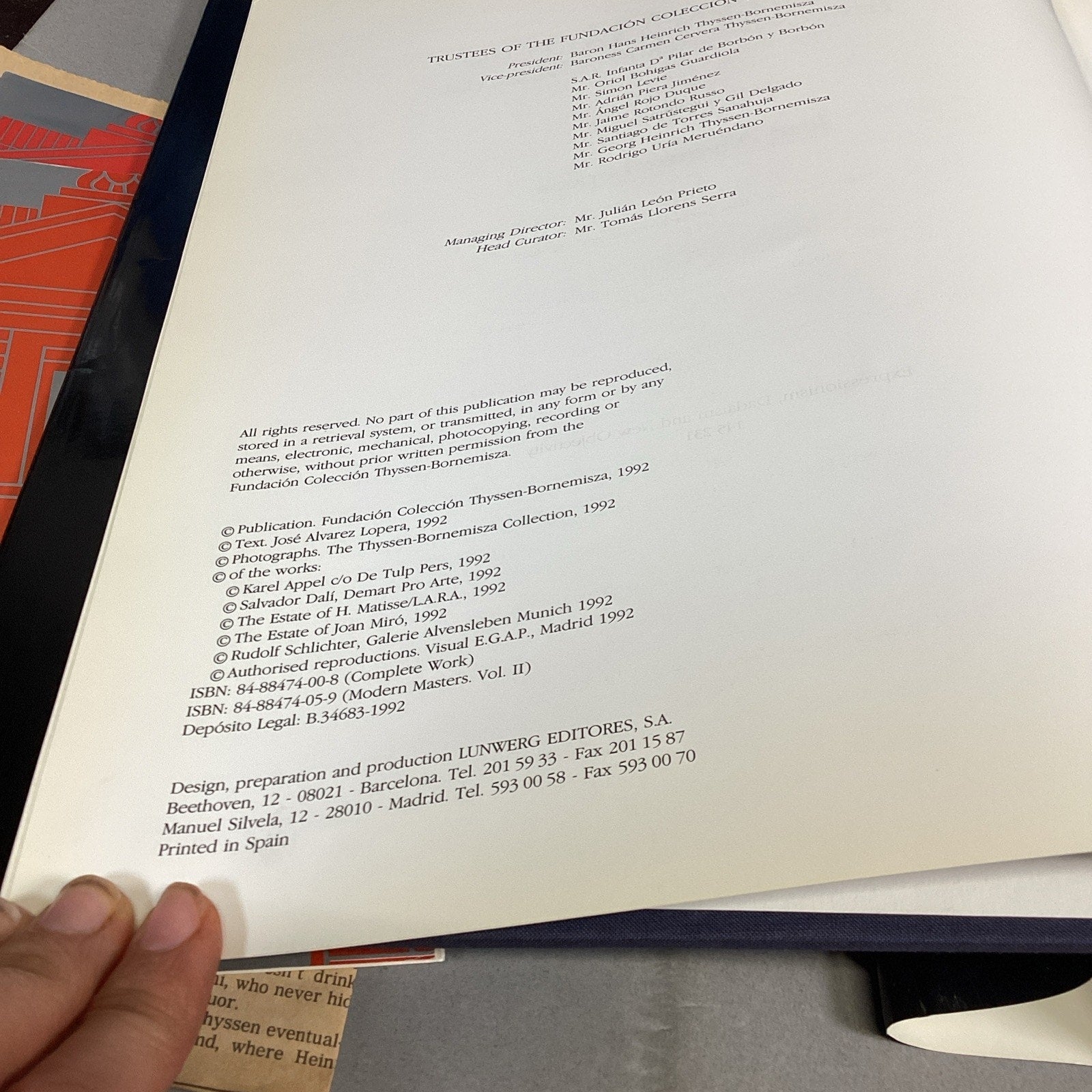 Modern Masters: Thyssen-Bornemisza Museum W/ Newspaper Article & 2 Brochures. This book is from 1992 and contains 707 pages. Hardcover with dust jacket. There are a couple rips in the dust jacket but interior pages look good.