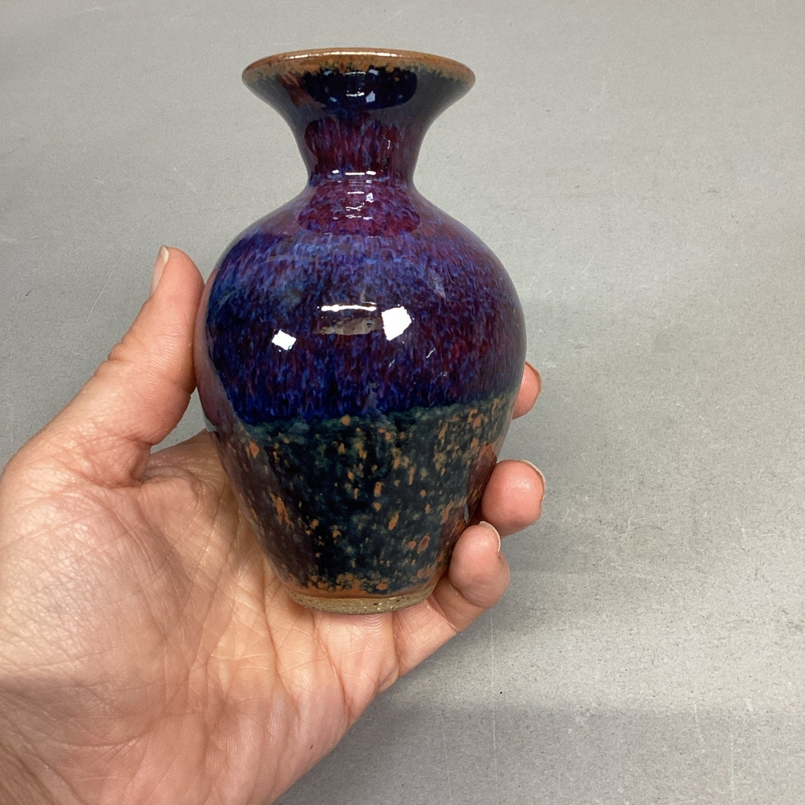 Multicolored Handmade Pottery Art Bud Vase - 4.5”H. In very good condition. Signed on base by Pete.