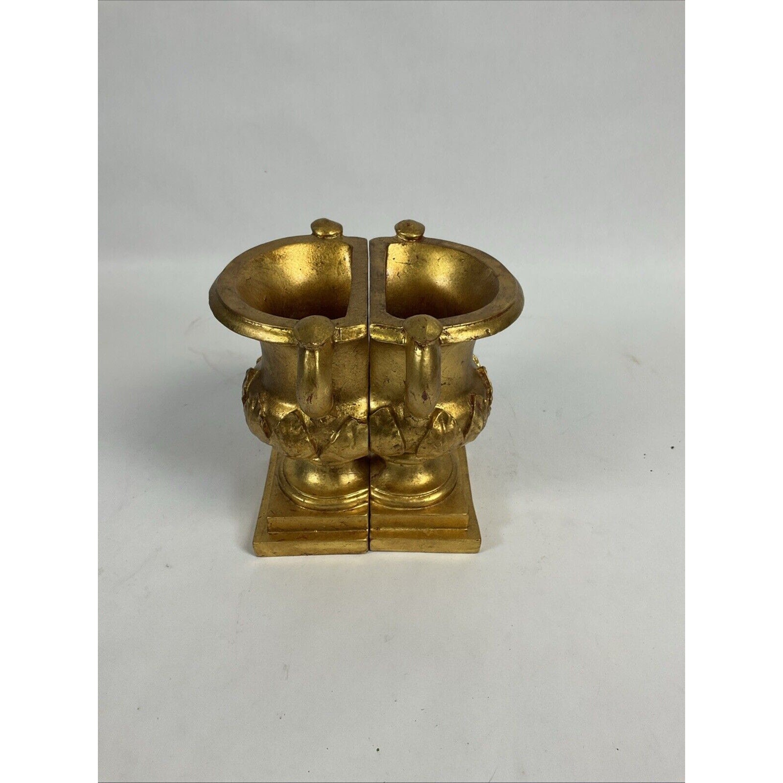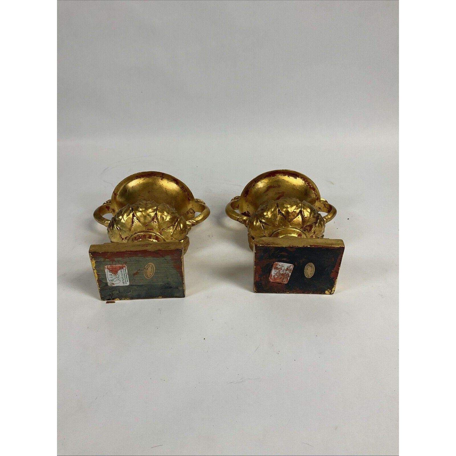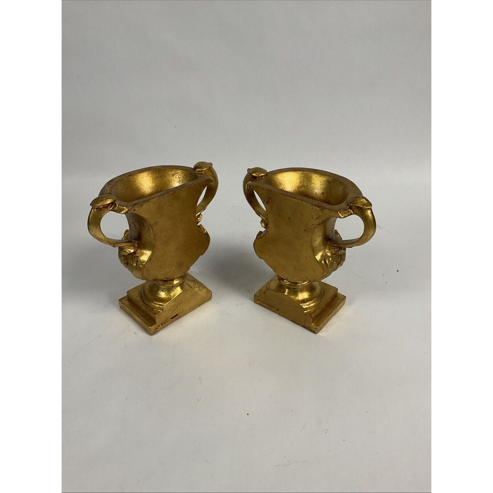 The pair of large golden vases with handles are luxurious and elegant decorative collectibles. With a stunning gold color and a sizable design, these vases are perfect for adding a touch of glamour to any space. The handles add a unique and sophisticated touch to the vases, making them a standout piece in any collection or home decor setting. These vases are sure to make a bold statement and elevate the aesthetic of any room they are placed in.