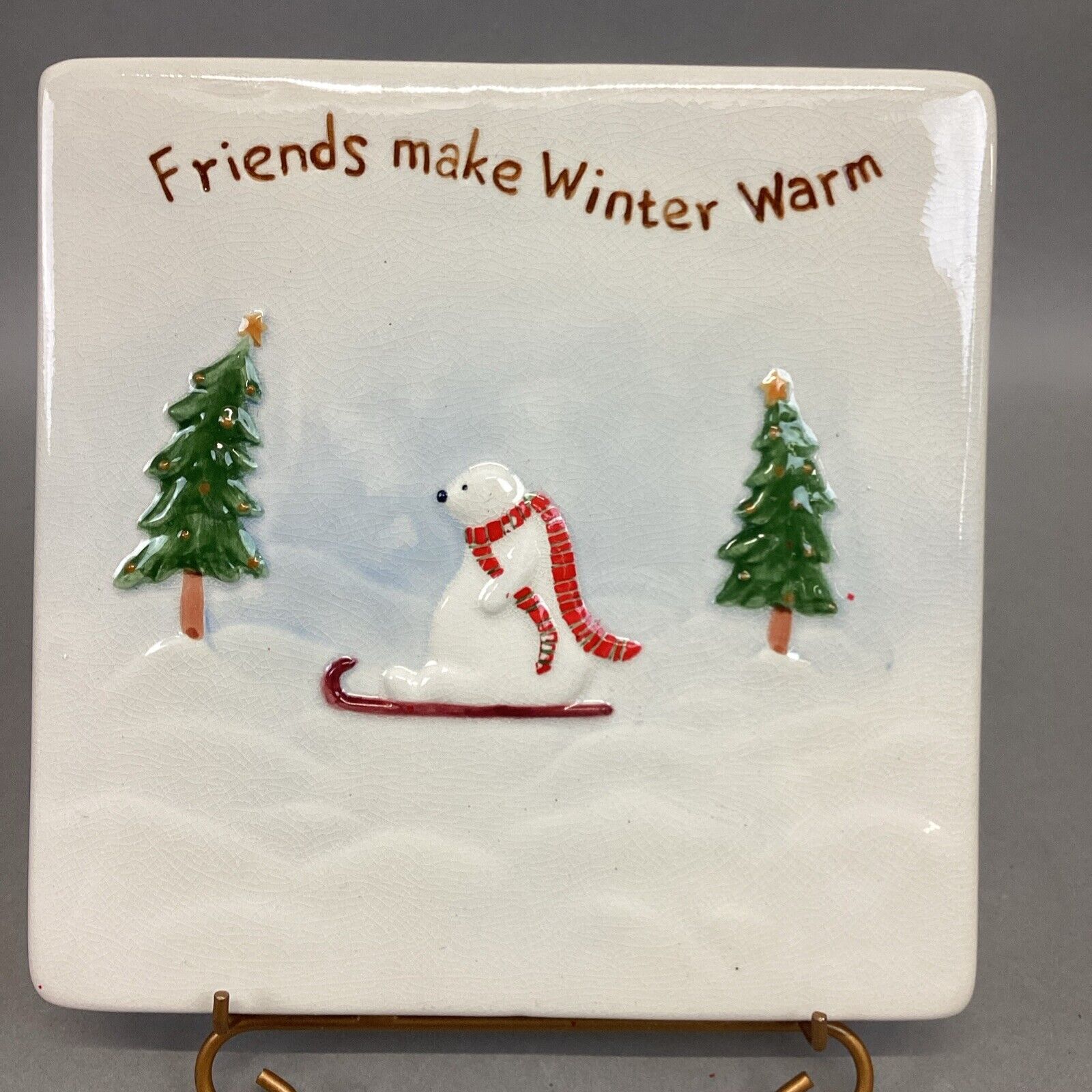 1. Polar bear hot plate with stand. No cracks or chips. Has a hook on back if you want to hang it. This measures 6.25”D
