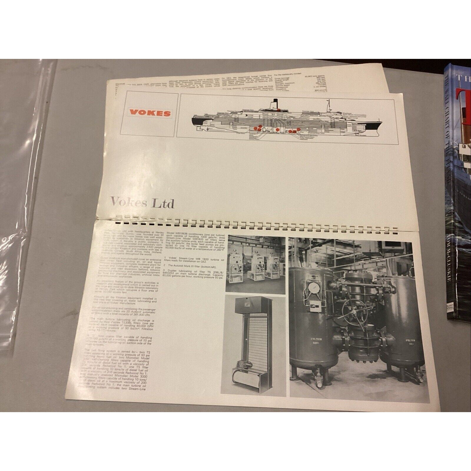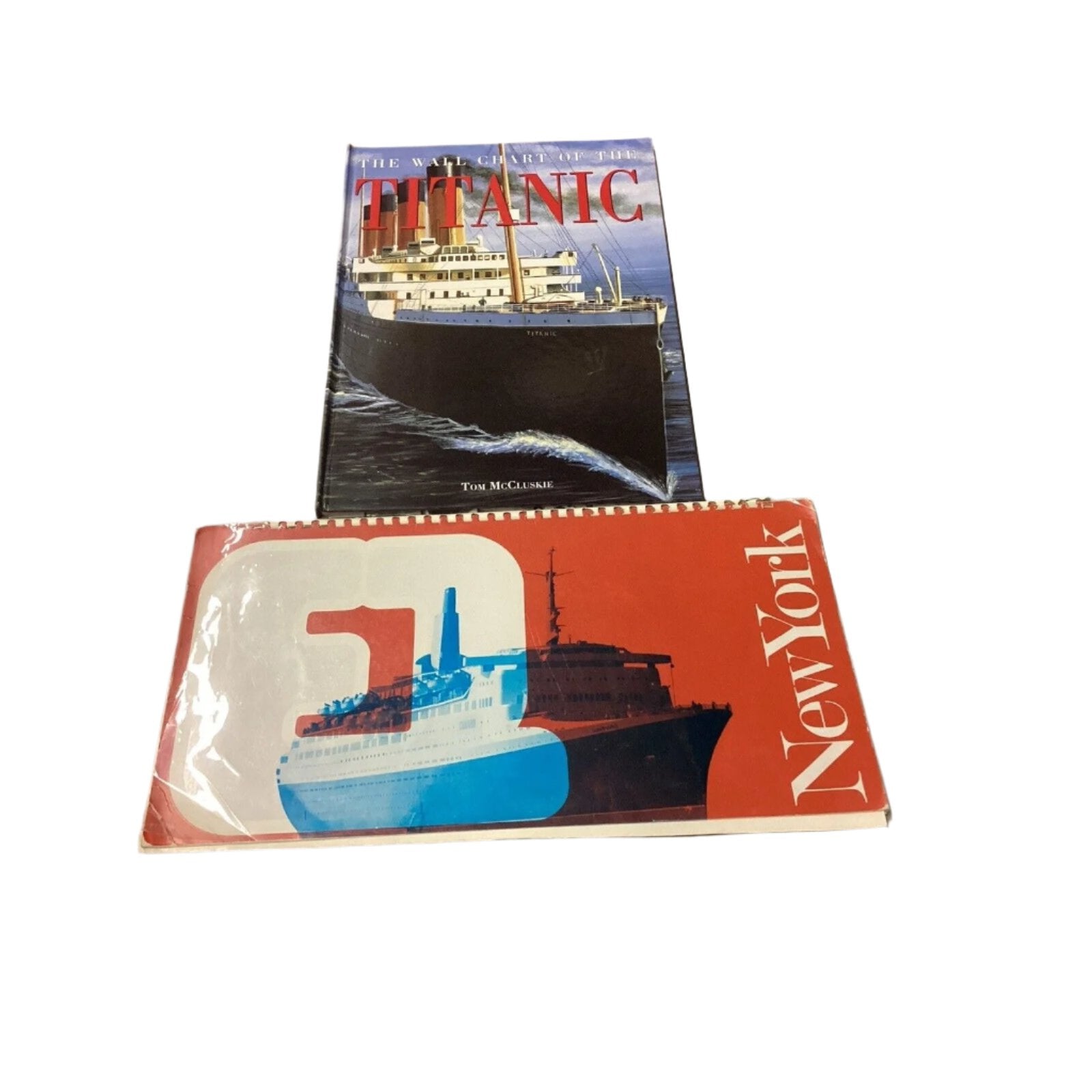 The titanic book is in good condition. The QE book is in fair condition. First page is loose and not attached. Binding is in rough condition.