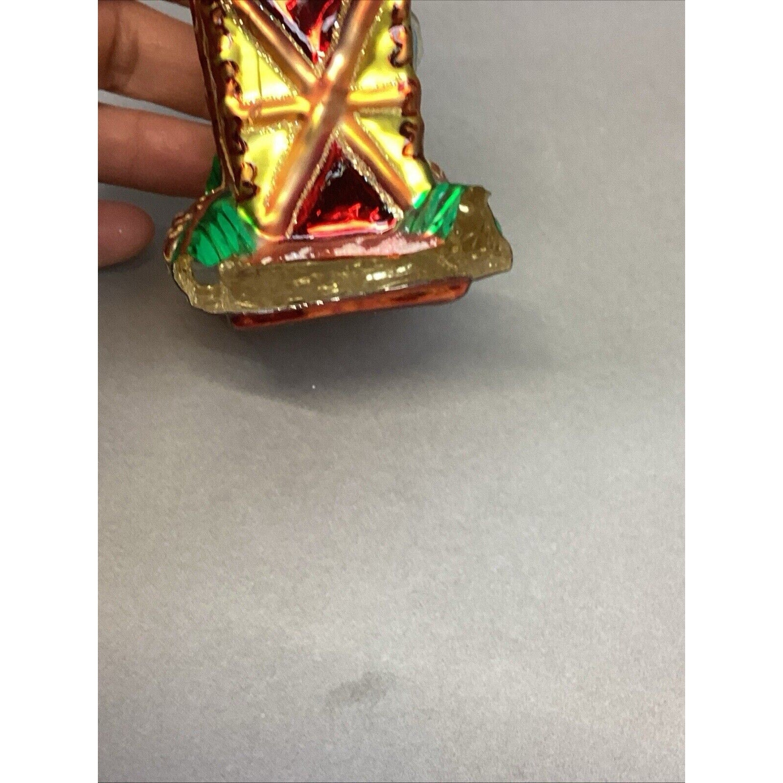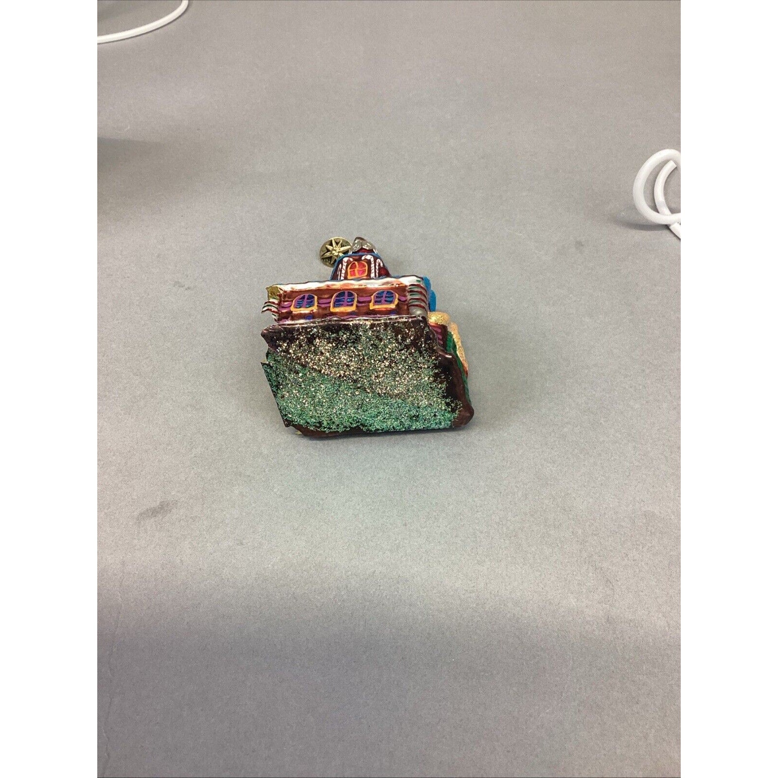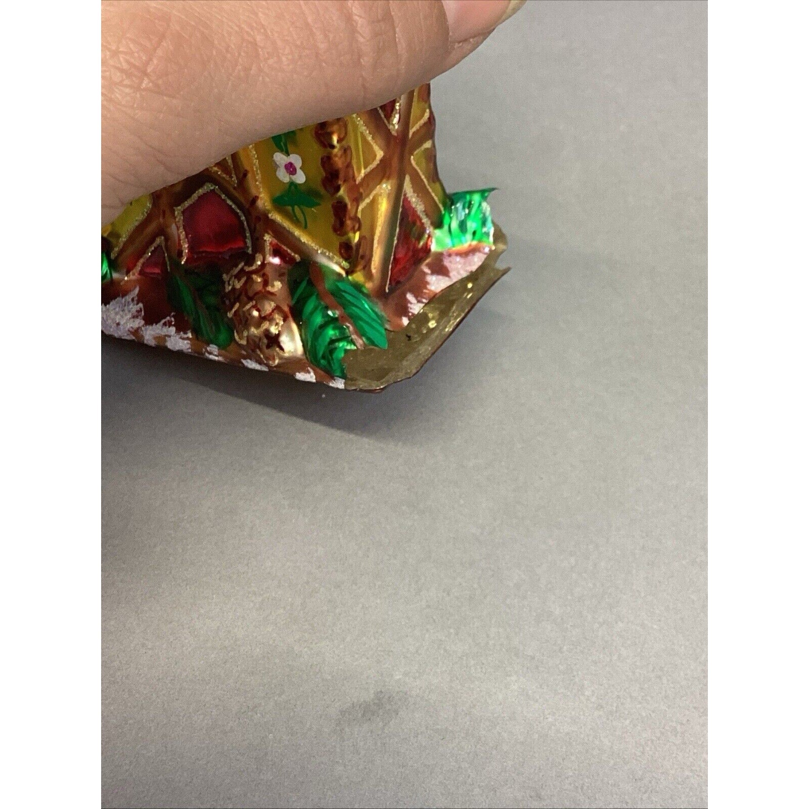 2. Church. No tags. Entire side of church is missing. Damage measures 1.75x1.5”. Ornament measures 4.25”Hx2.5”L