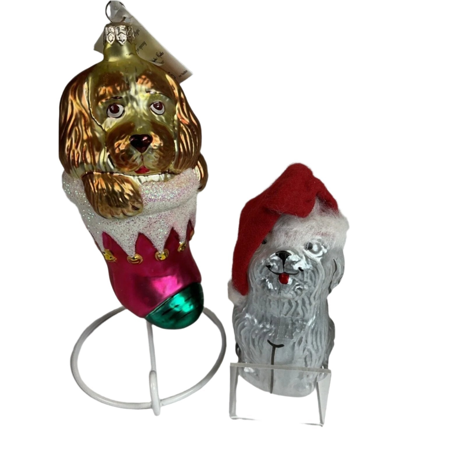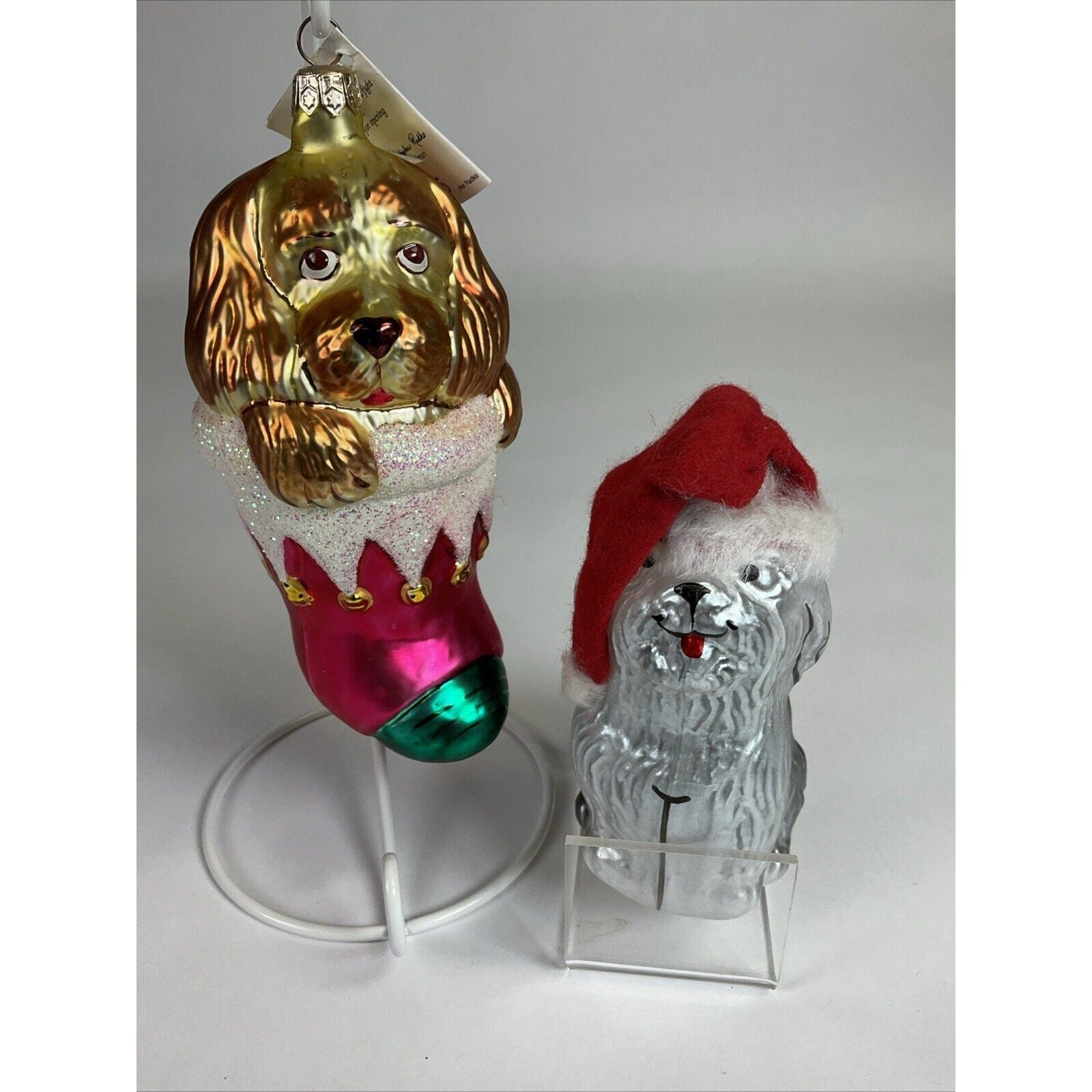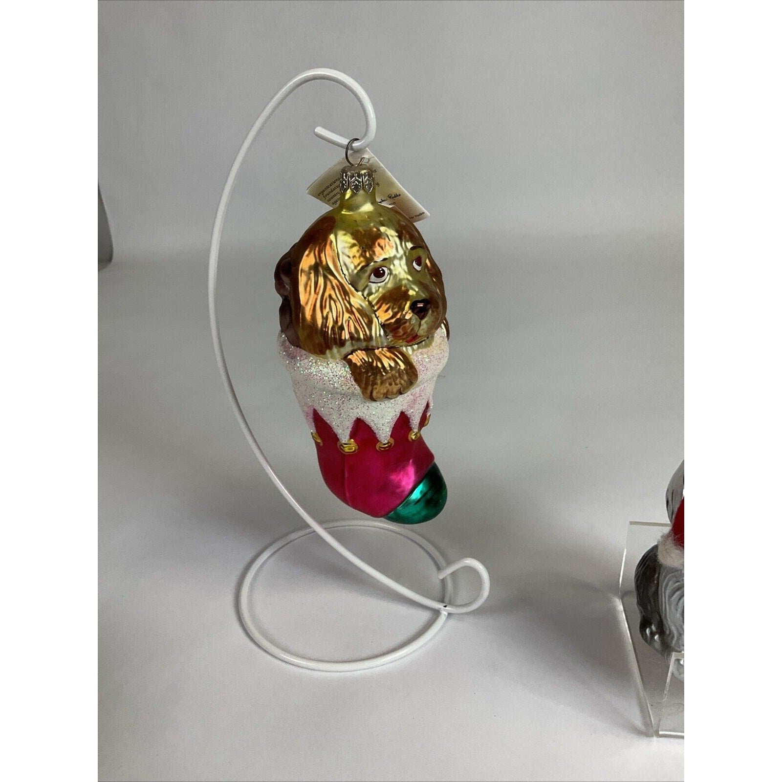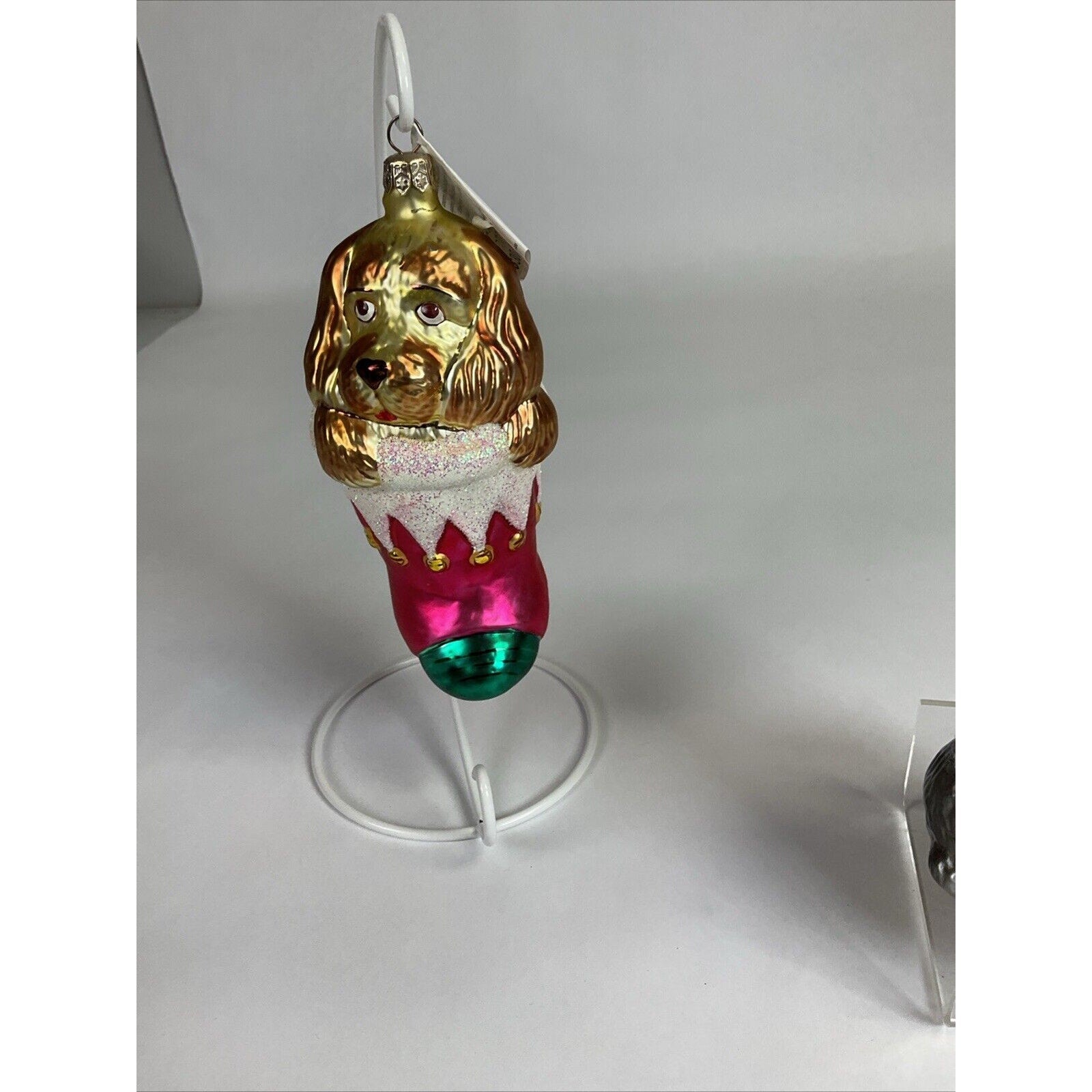Radko Christmas Puppy Love Glass Ornament Dog Stocking + Santa Hat Dog