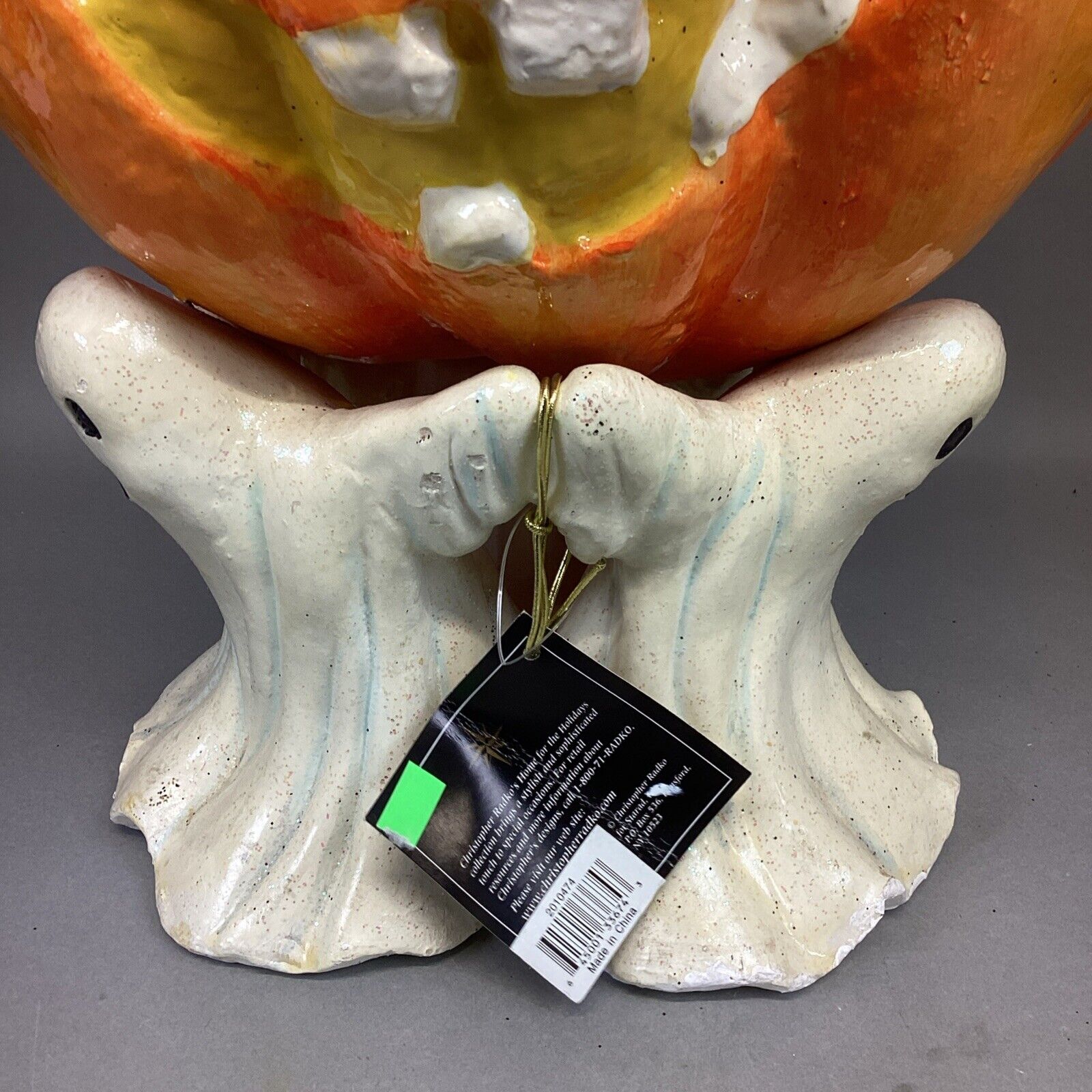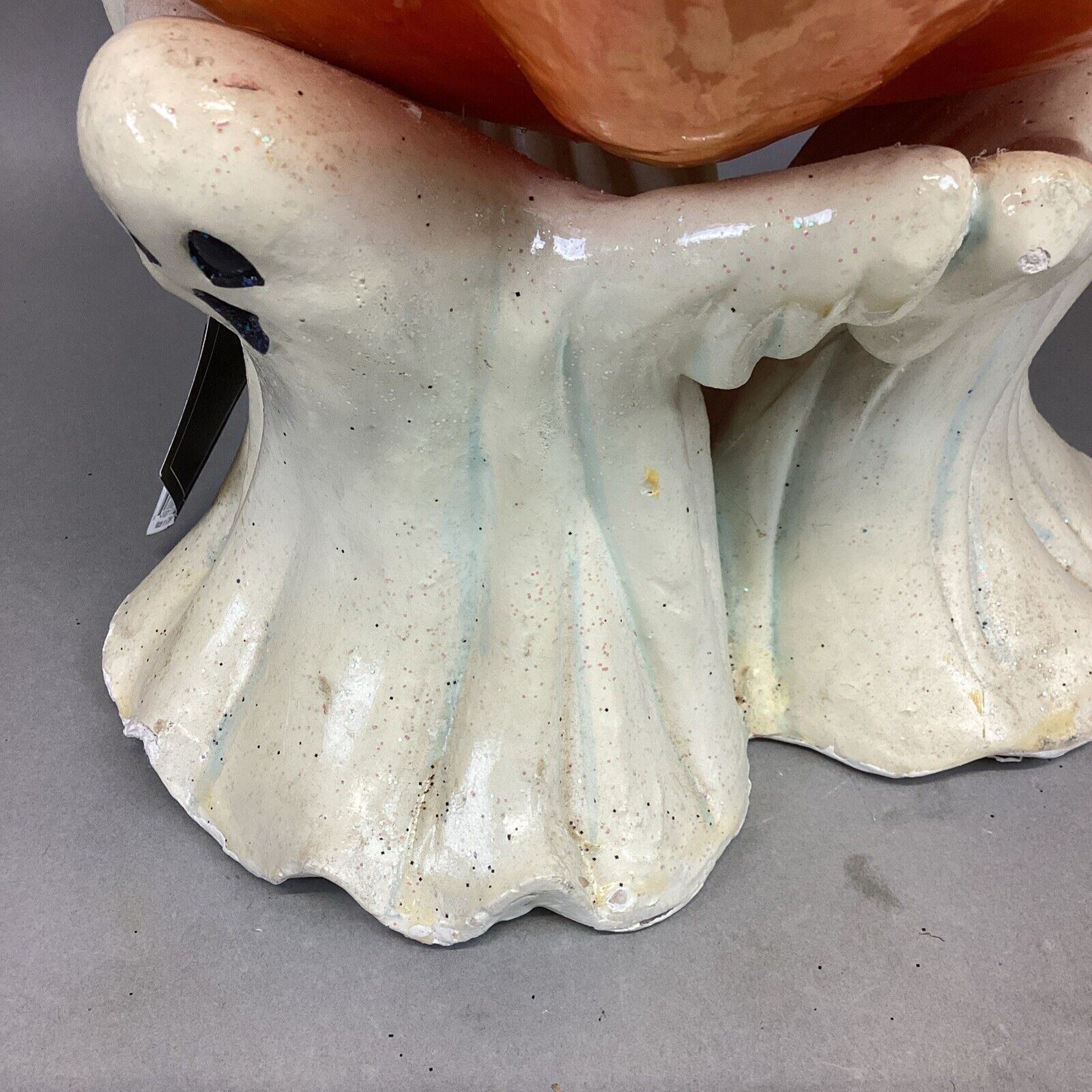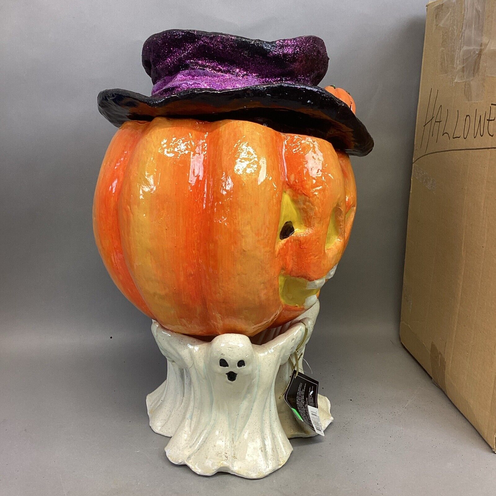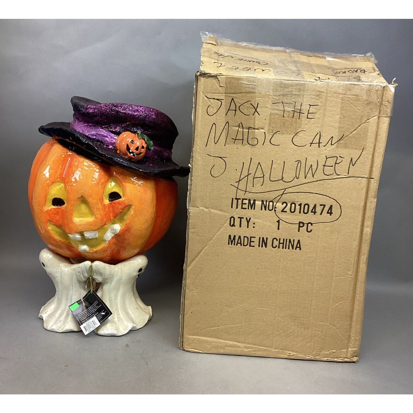 Radko Jacx The Magic Can Large Figurine W/ Tags #2010474 - 17.5”H. In used condition. The ghosts have stains on them. The Jack o lantern - under its right eye, it has a couple marks. Possibly made of resin? This item measures 17.5”Hx13”D approximately. The interior measures 9.5”Deep by 10.5” Diameter. Comes with original box. Box is in rough shape. Item will be double boxed. The box measures 20”Hx14”D