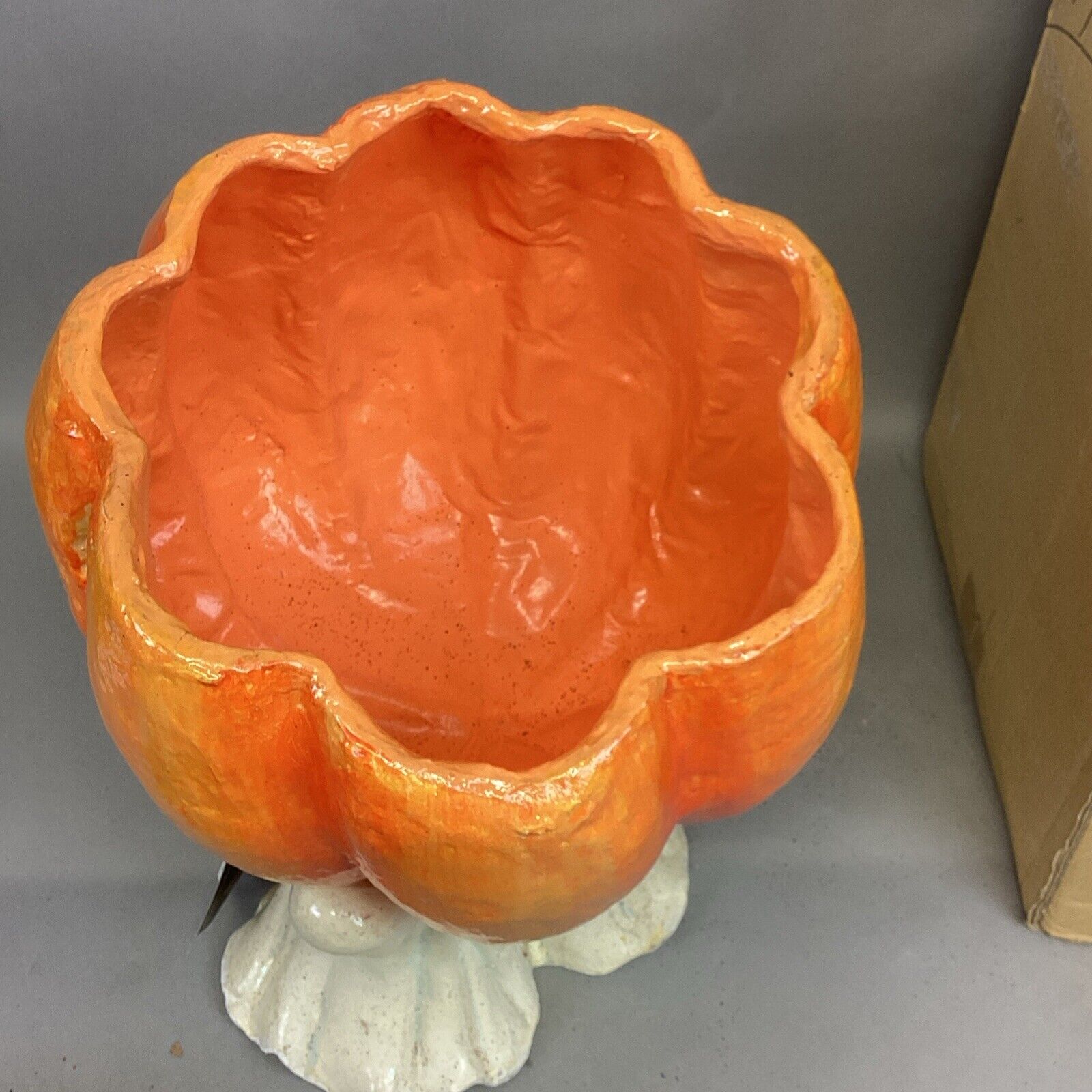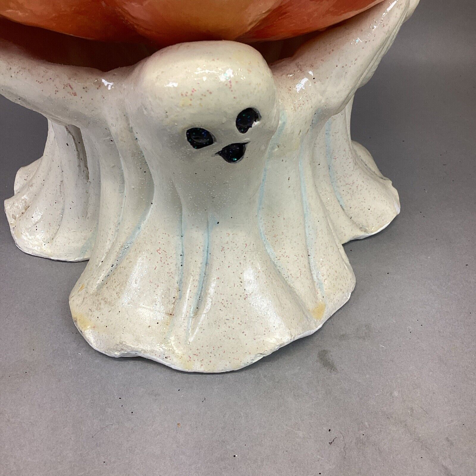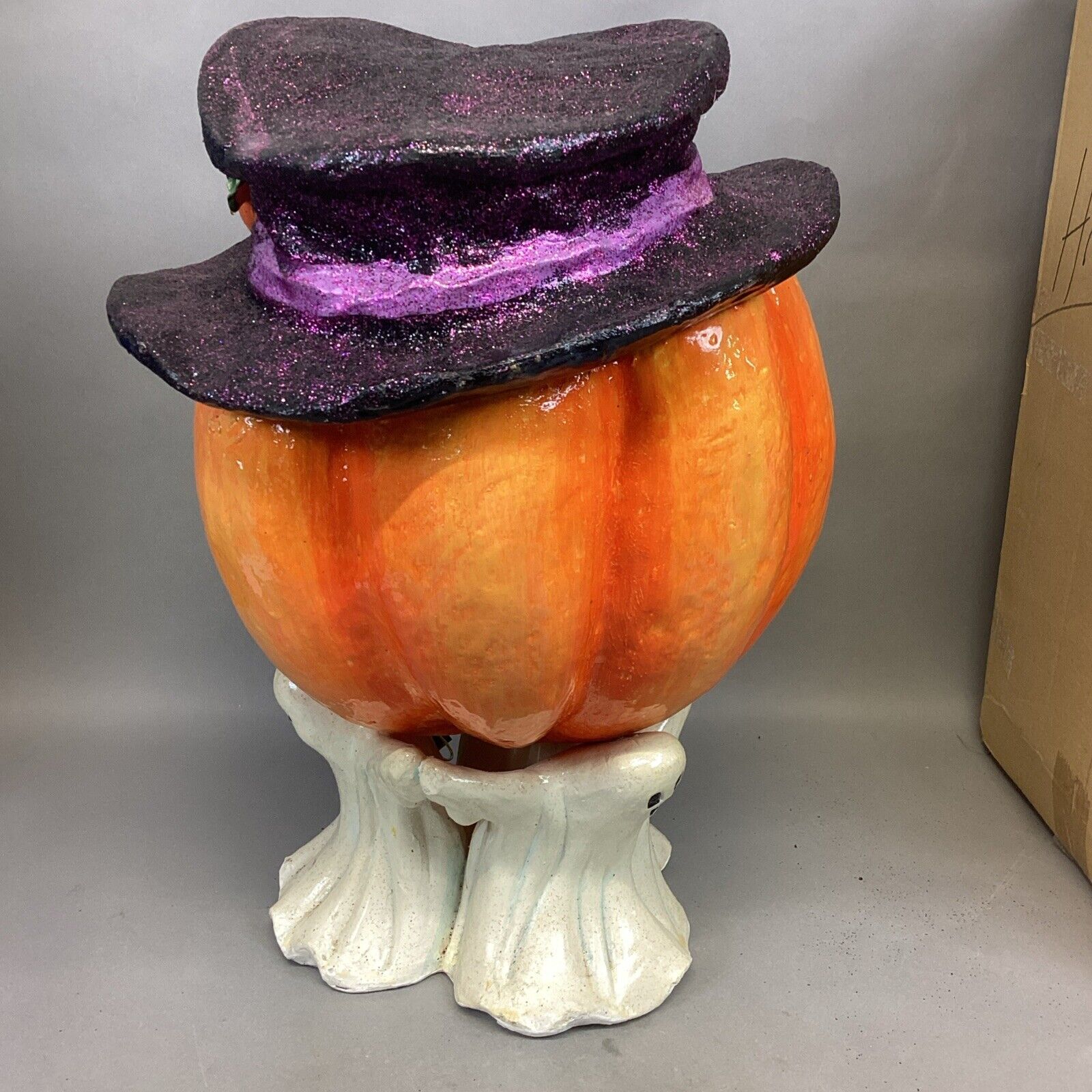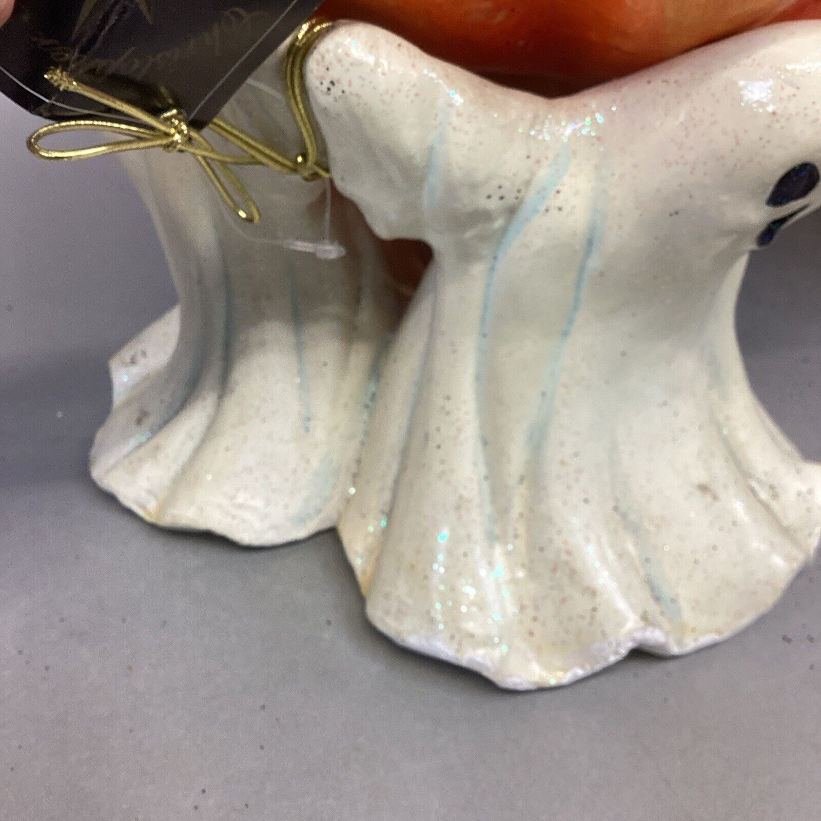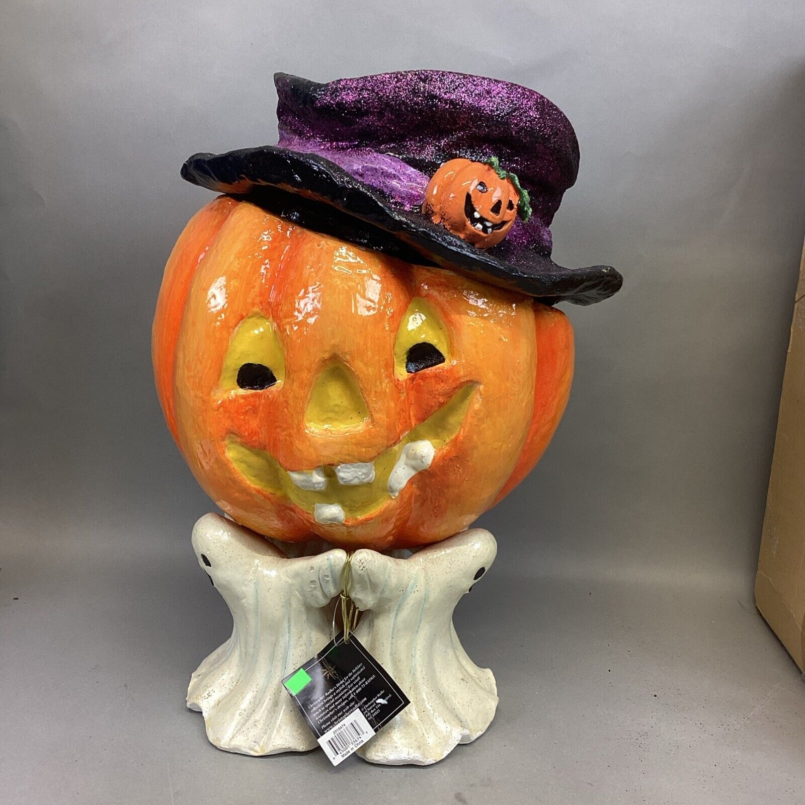 Radko Jacx The Magic Can Large Figurine W/ Tags #2010474 - 17.5”H. In used condition. The ghosts have stains on them. The Jack o lantern - under its right eye, it has a couple marks. Possibly made of resin? This item measures 17.5”Hx13”D approximately. The interior measures 9.5”Deep by 10.5” Diameter. Comes with original box. Box is in rough shape. Item will be double boxed. The box measures 20”Hx14”D