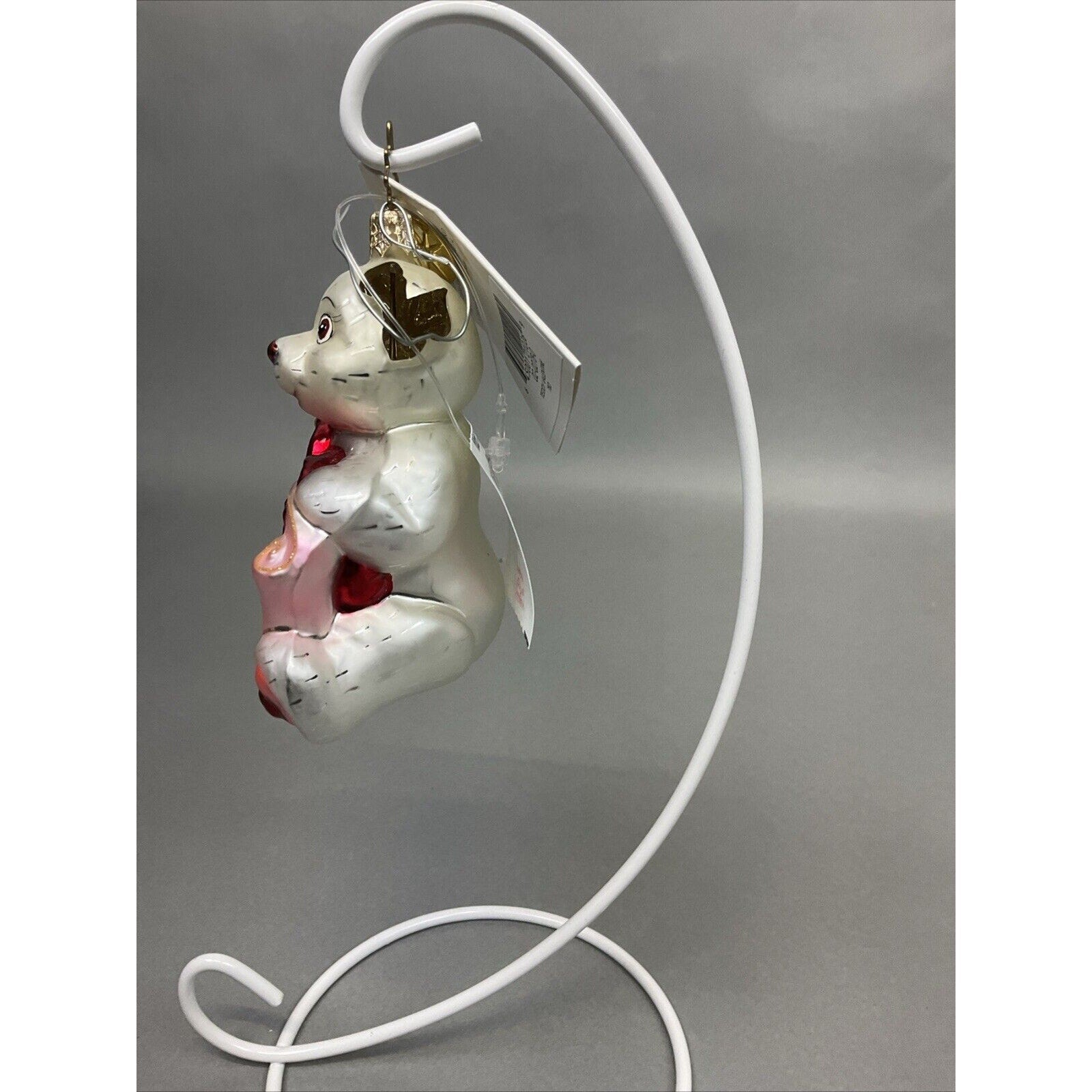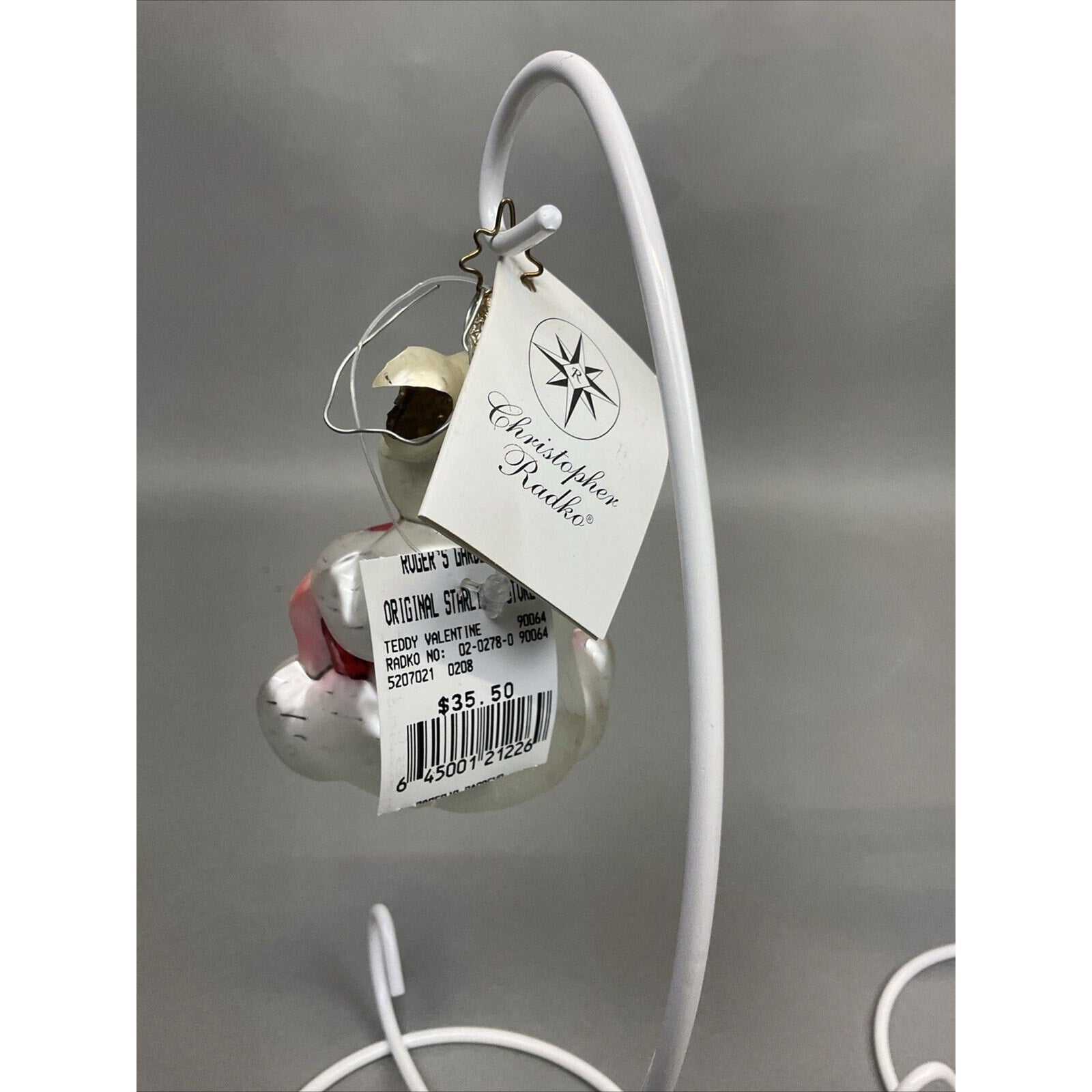 This Christopher Radko ornament set includes the "Teddy Valentine" and "We Gather Together" pieces, both made of hand blown glass and weighing 15 oz. The ornaments are perfect for adding a touch of love to your Christmas tree, and their vintage design adds a special touch to your collection. The set is an original production and is in excellent shape, despite some damage to the ornaments.