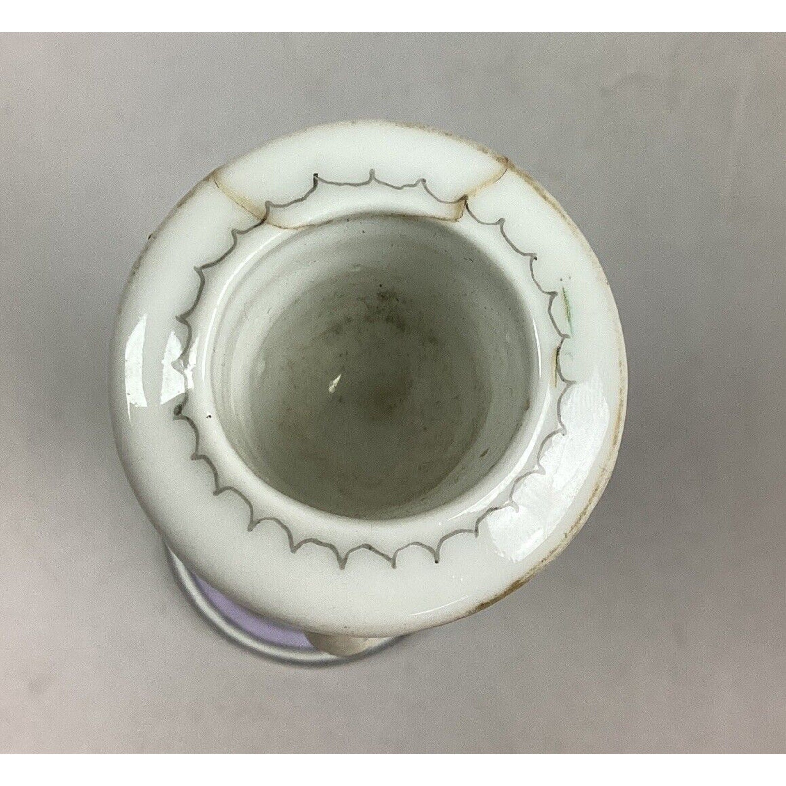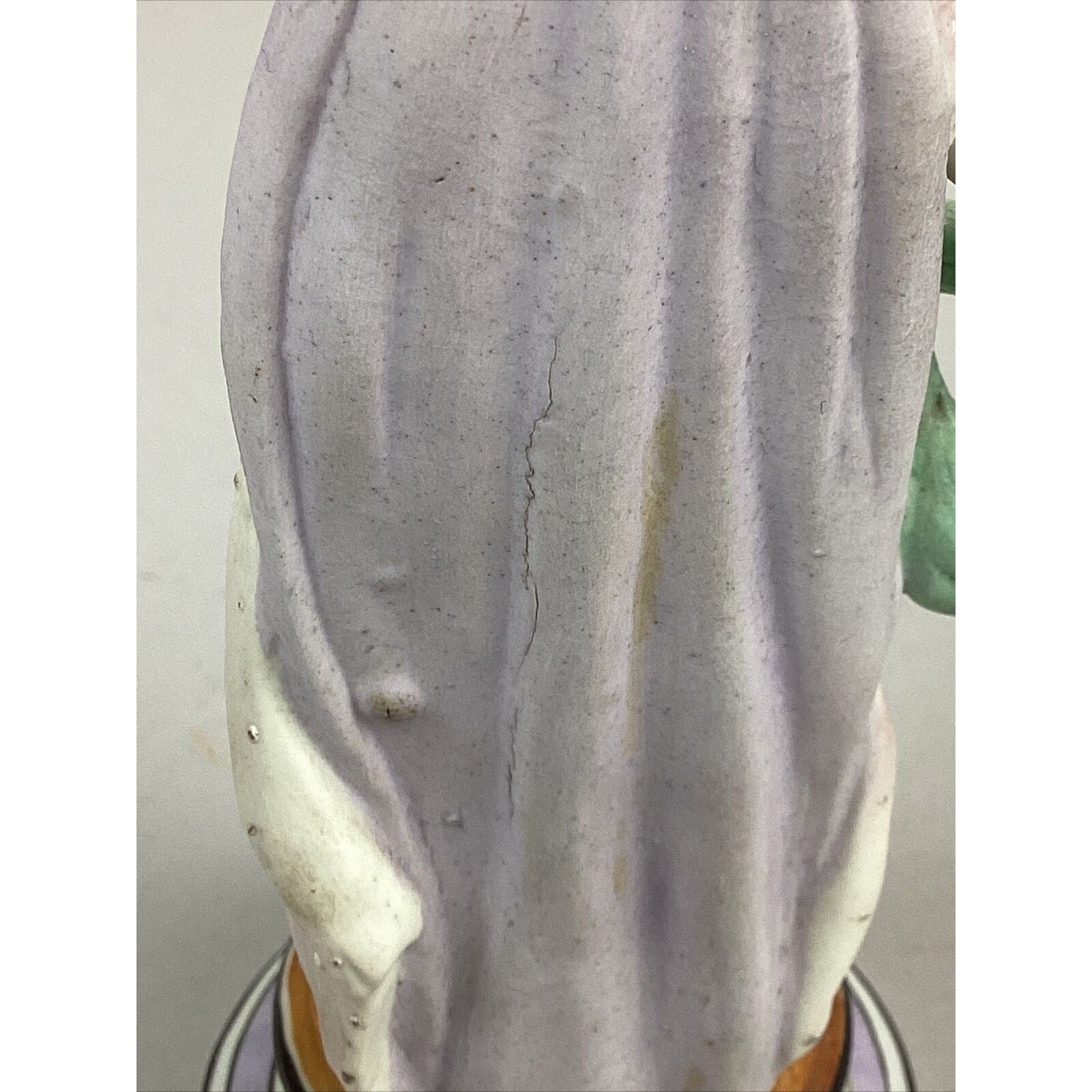 This is for an antique rare English figurine of a woman carrying a candlestick holder. This is made from hard paste porcelain. In used condition. There are marks, some fading and 2 scratches on it due to age. On the back of this item, there’s a line. It looks to be a crack but it doesn’t feel like a crack.