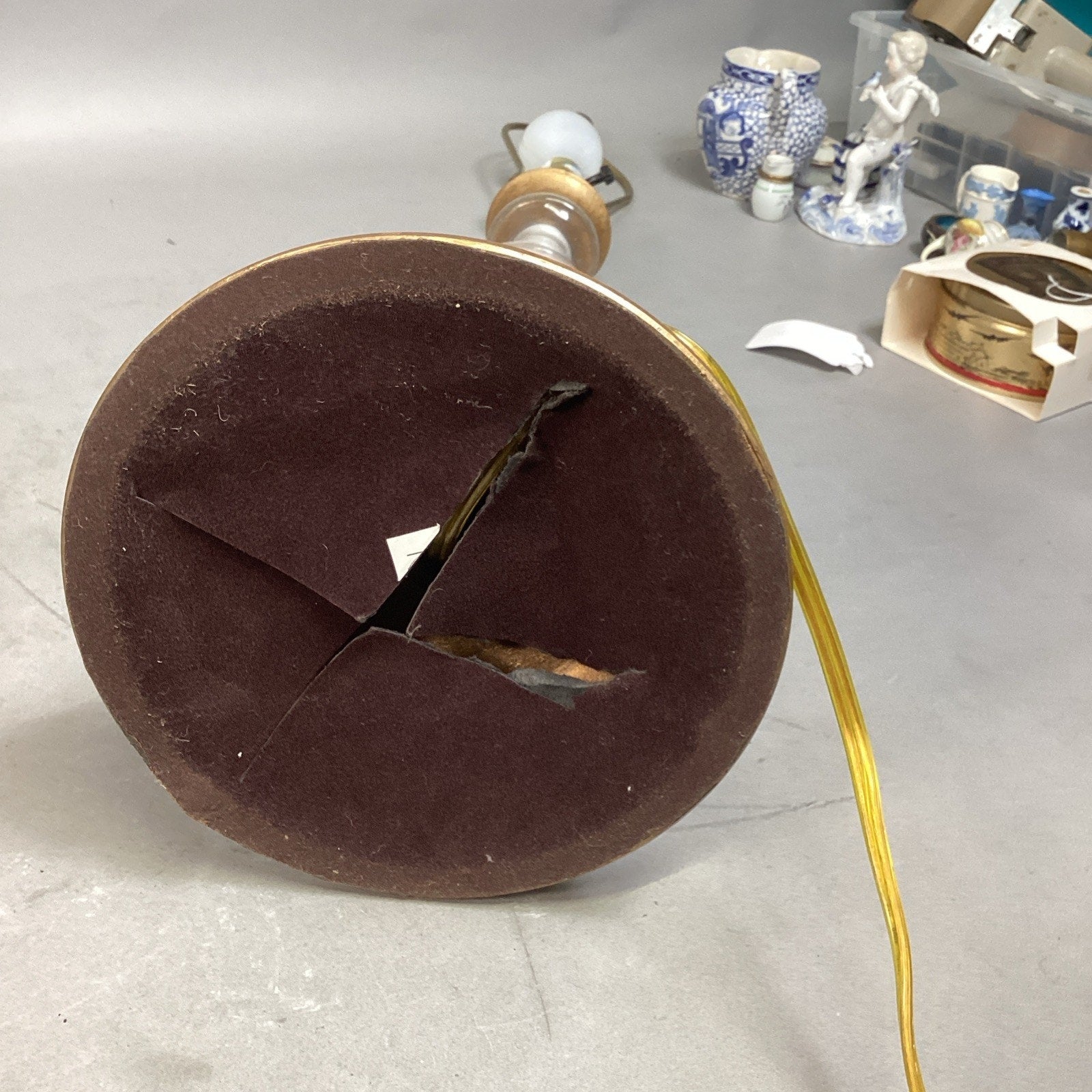 Teardrop form, gilt painted bases. Each 31.5"H including harps and finials. Minor losses to gilt painting. Both with scratches.