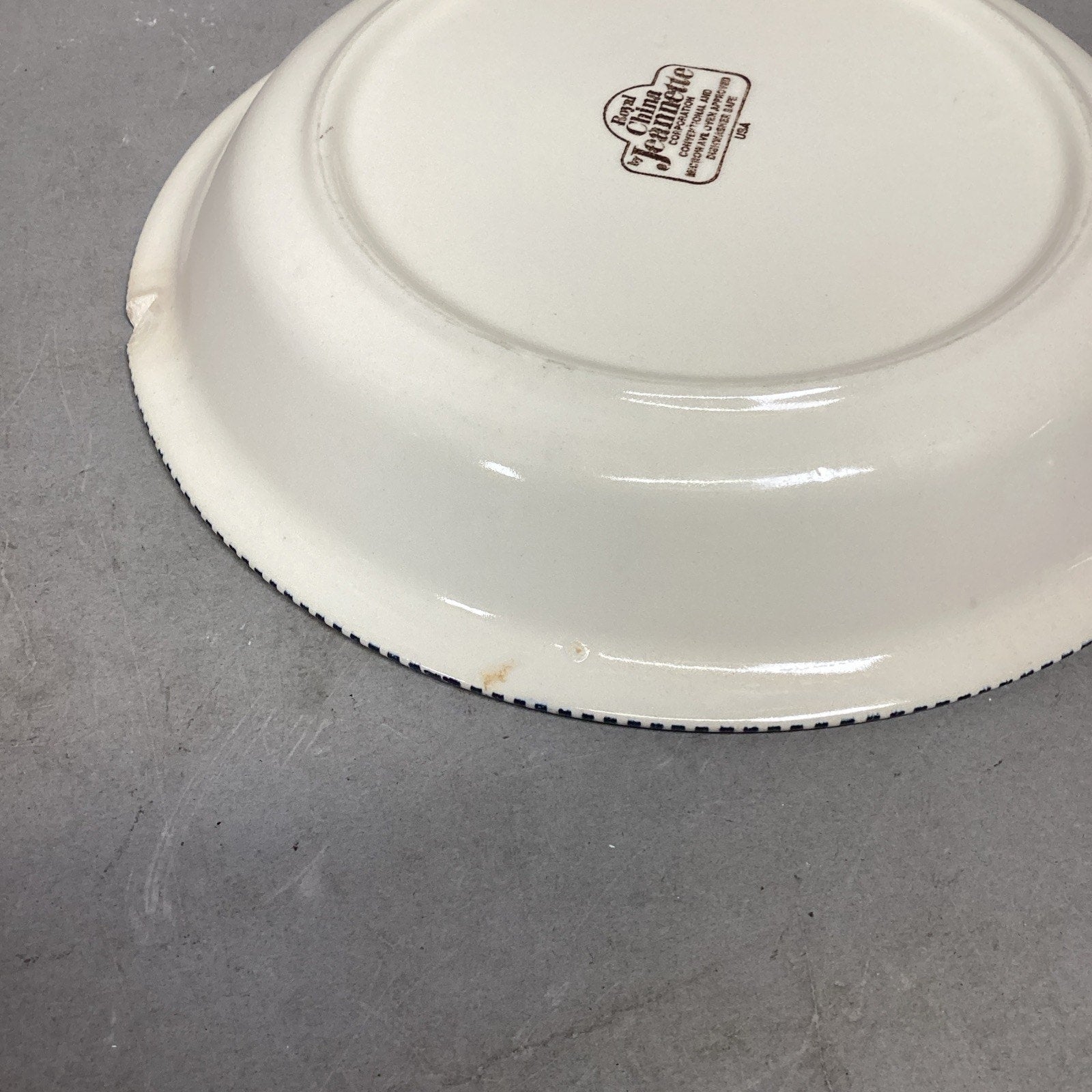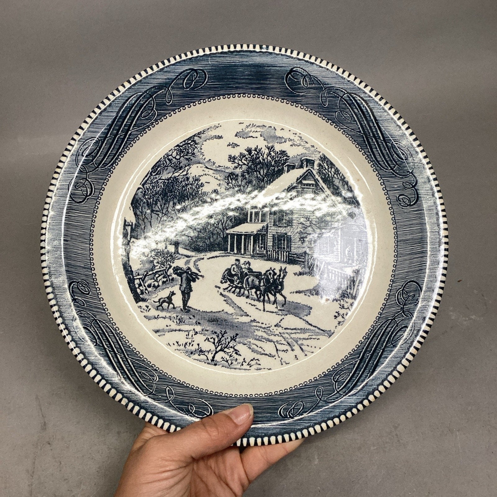Royal China By Jeanette Blue Currier & Ives "Snowy Morning" 10" Pie Plate. This has 1 chip underneath the rim. Cannot be seen from the top. Can only be seen from underneath.