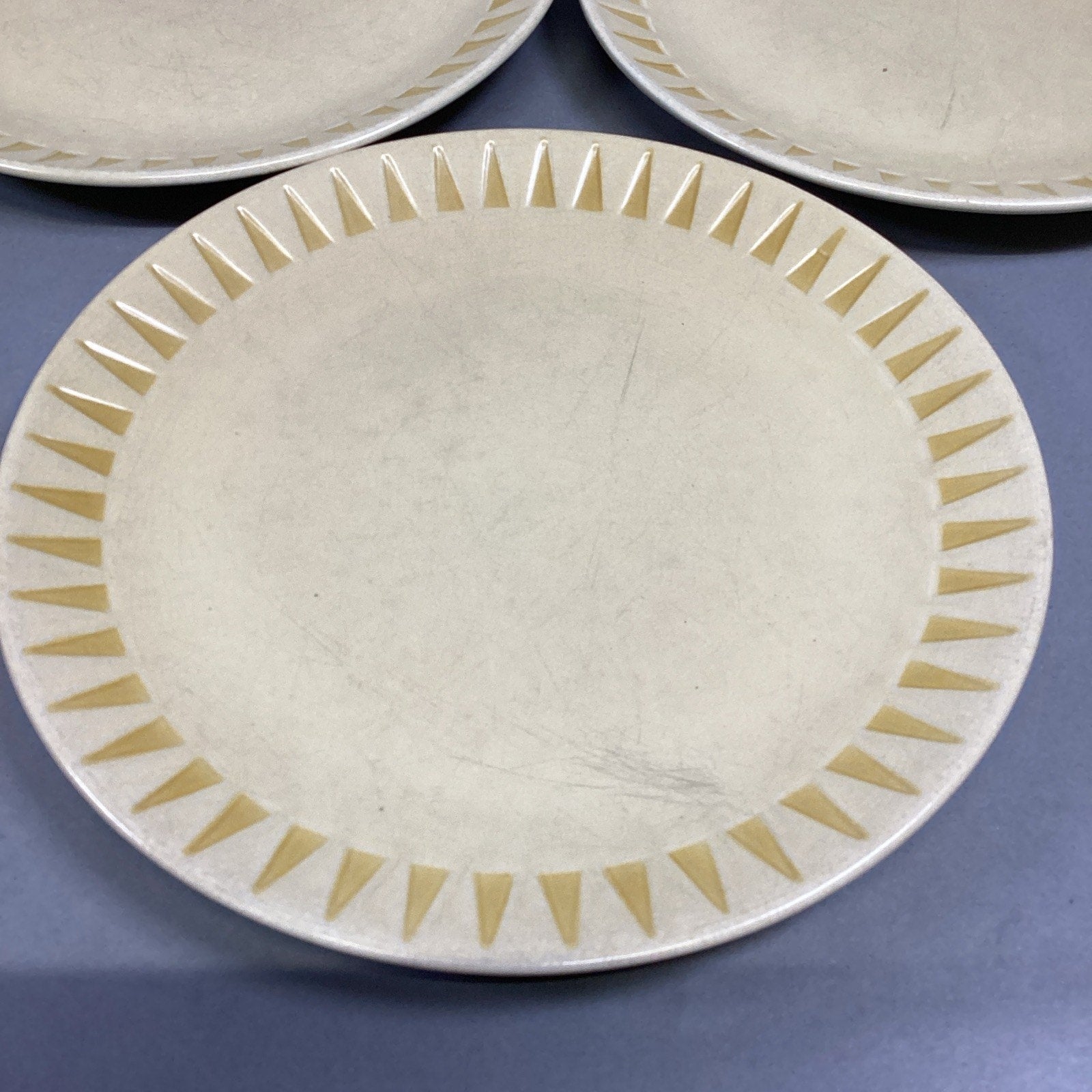 2. There are 3 salad or appetizer plates which measure 8.5”D. They also have utensil scrapings.
