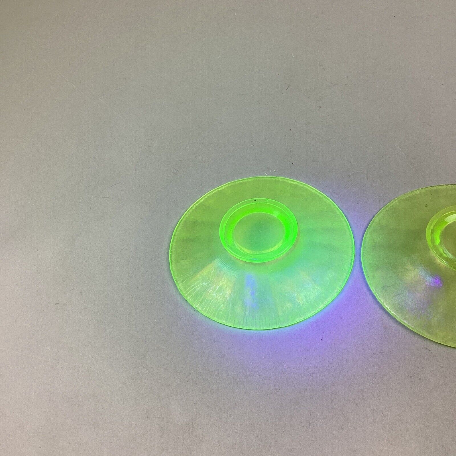 Set Of 2 Iridescent Uranium Glass Plate/Saucer Yellow Green Glows - 6.25”