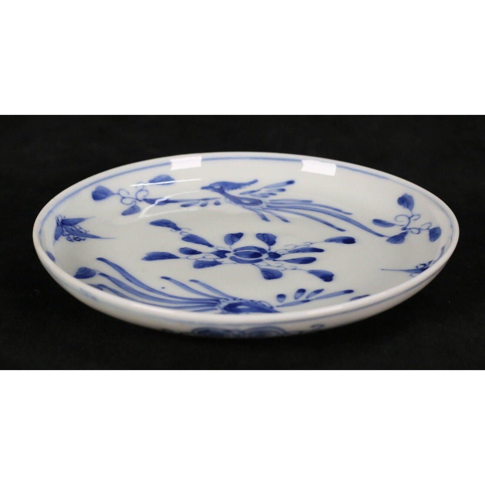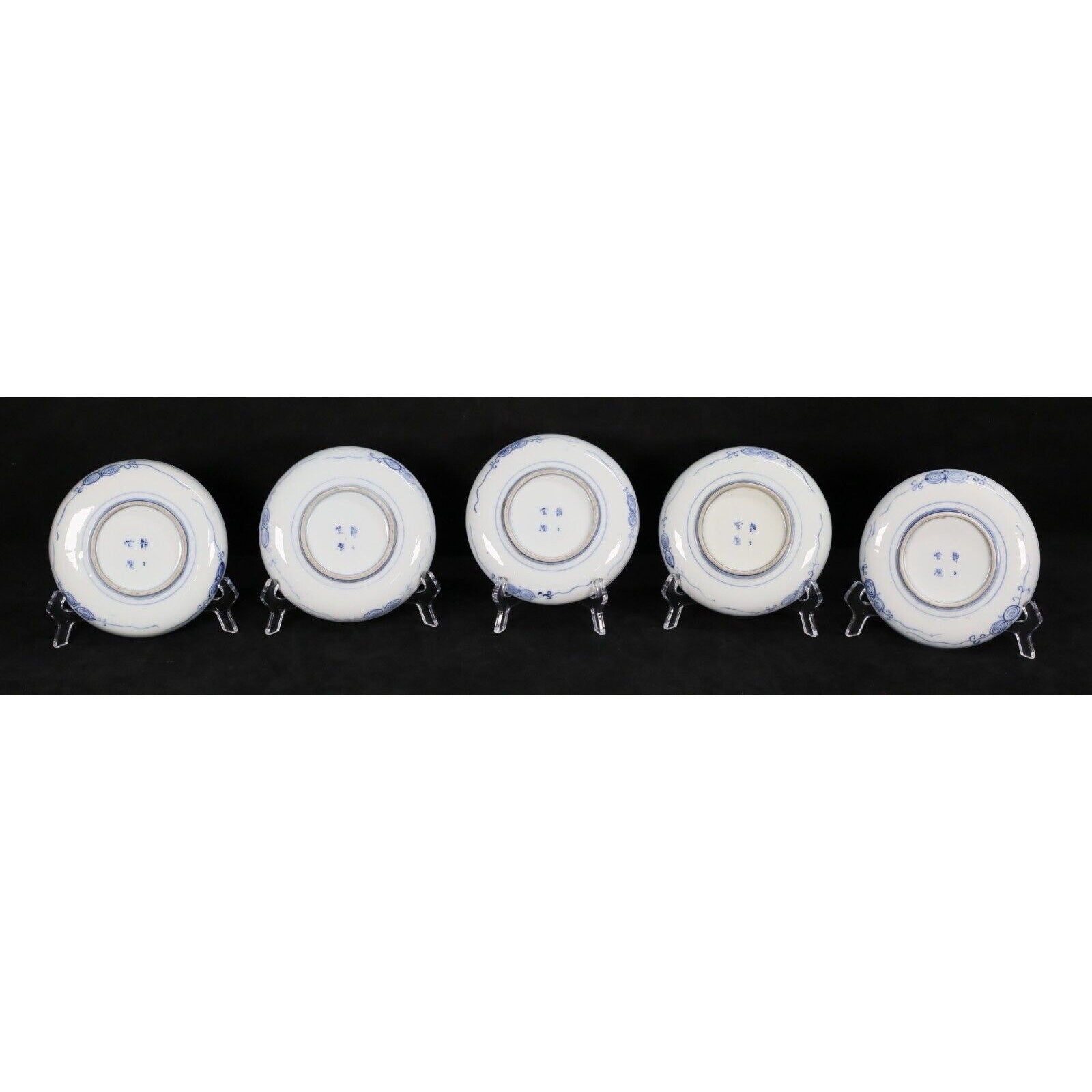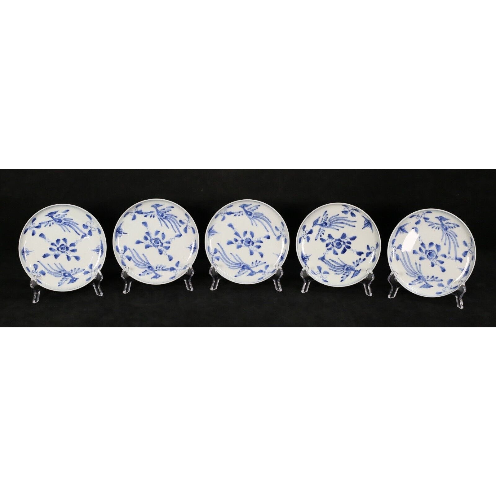Set of 5 Japanese porcelain plates. Blue and white decoration of flowers and cranes. All signed with blue 4 character marks on the underside. In a wooden presentation box. Each plate 6 3/4"-diameter.