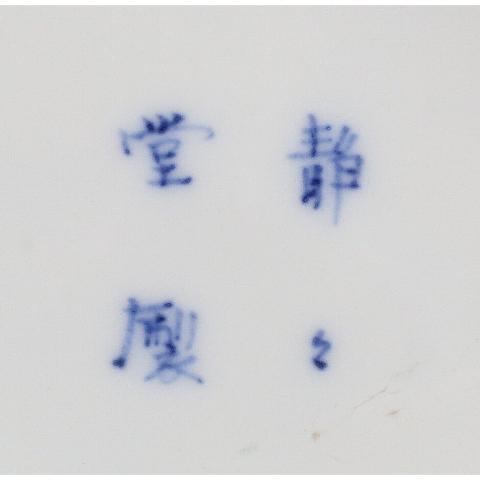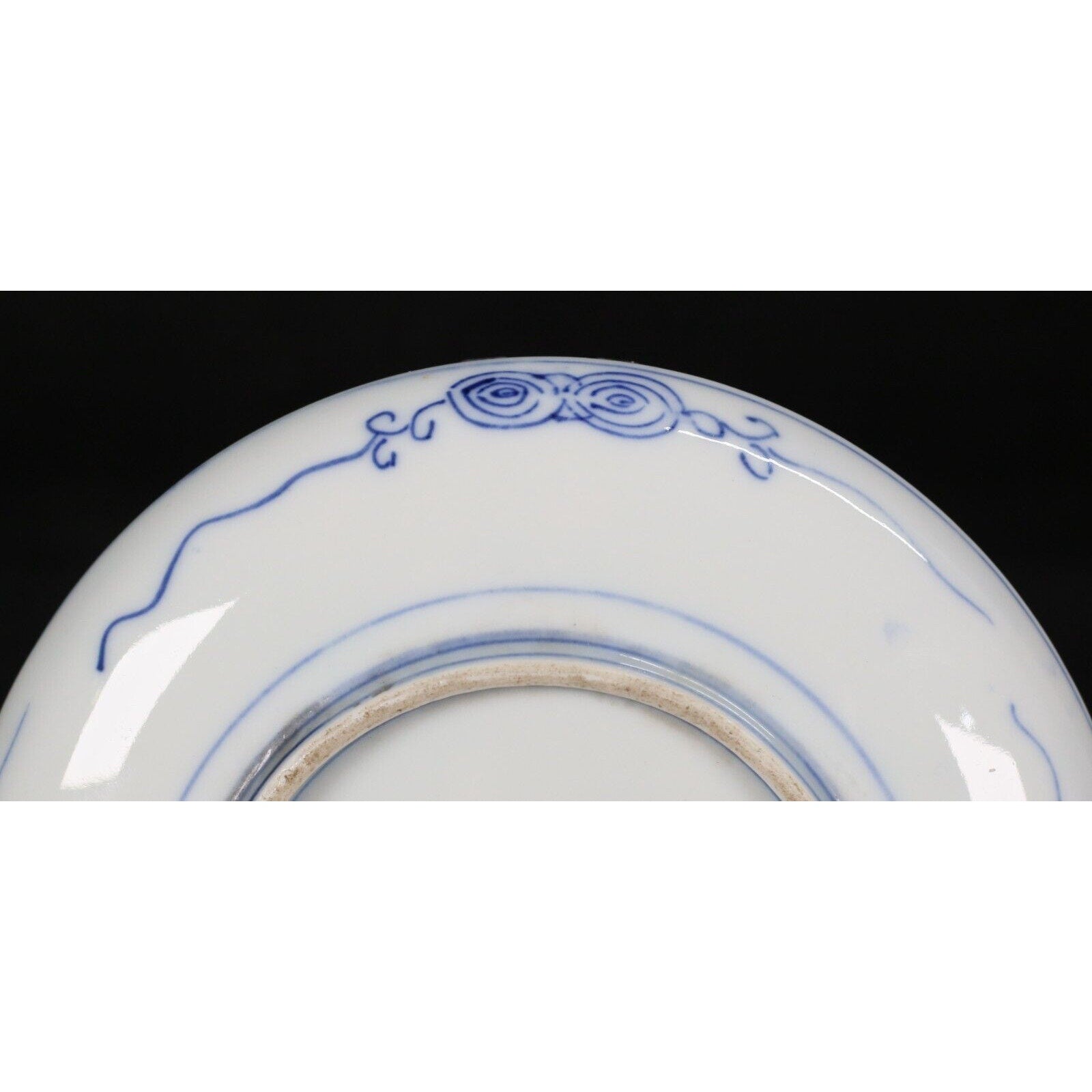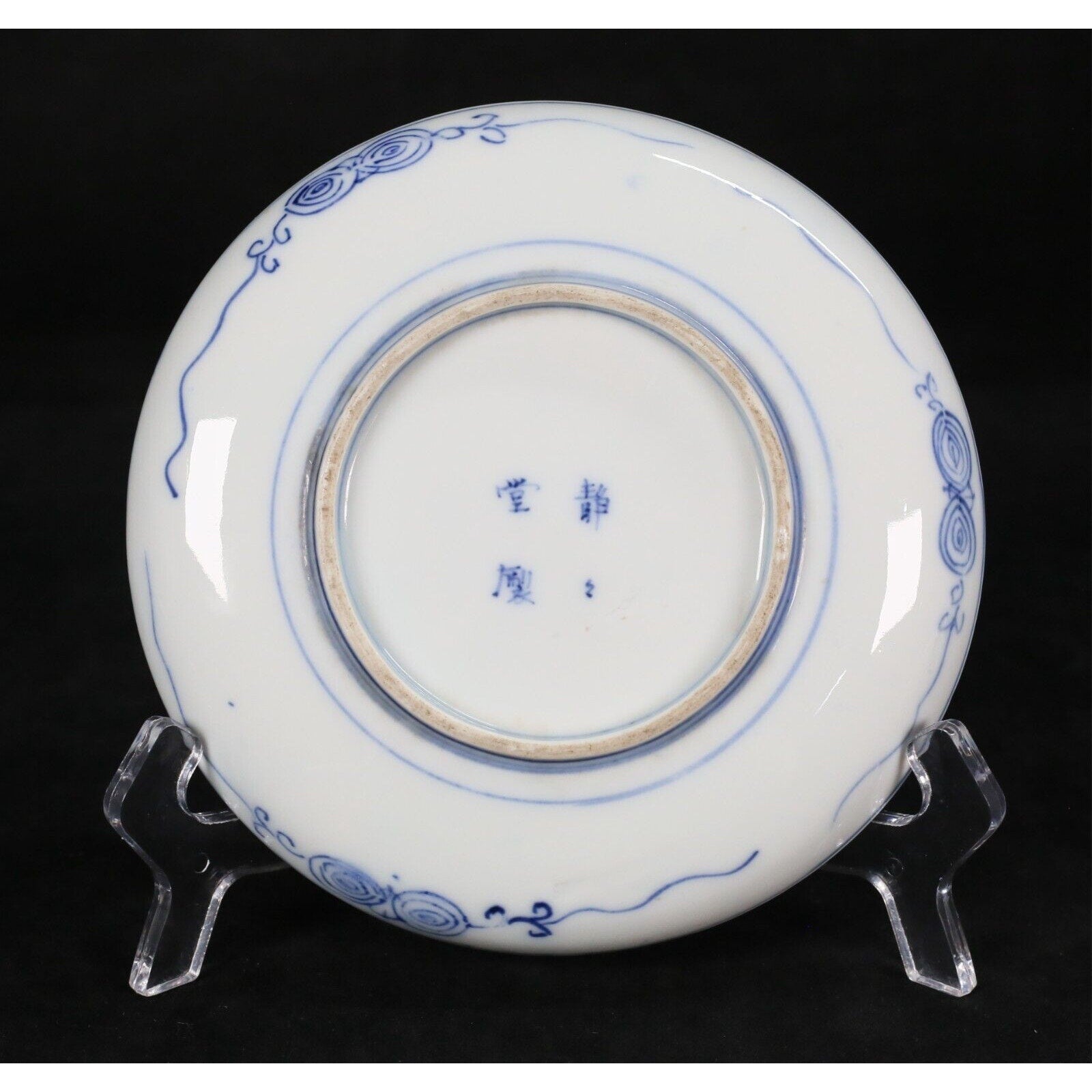 Set of 5 Japanese porcelain plates. Blue and white decoration of flowers and cranes. All signed with blue 4 character marks on the underside. In a wooden presentation box. Each plate 6 3/4"-diameter.