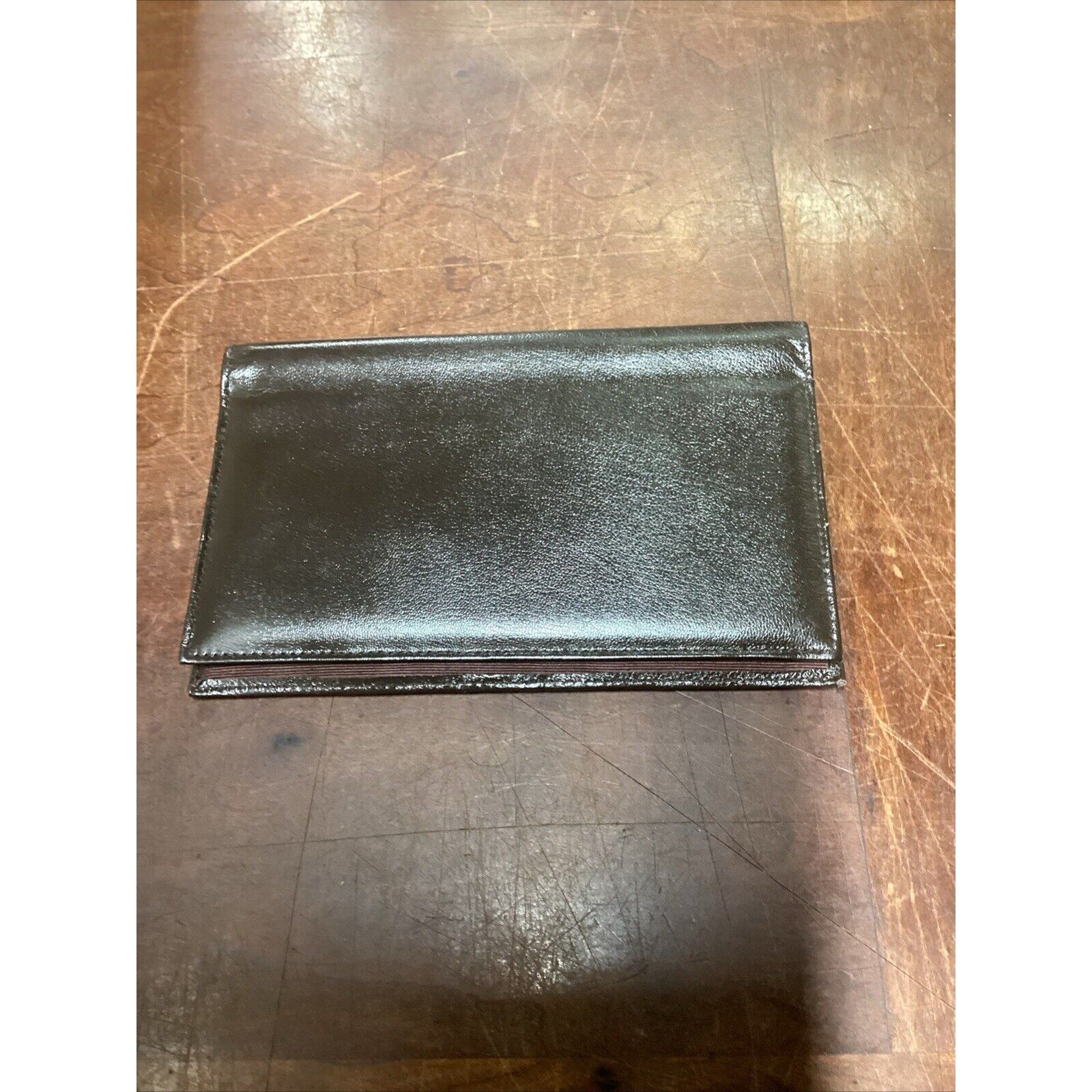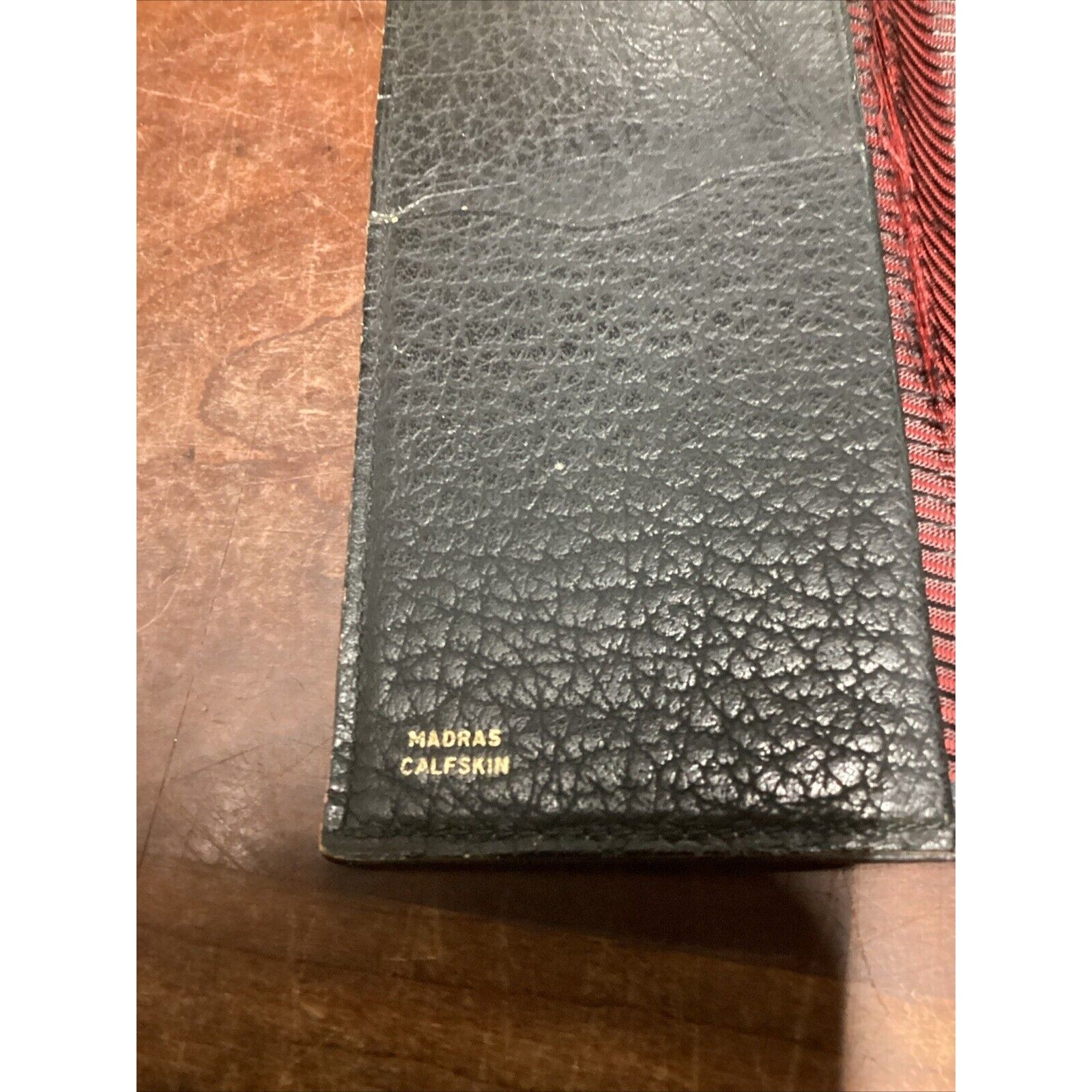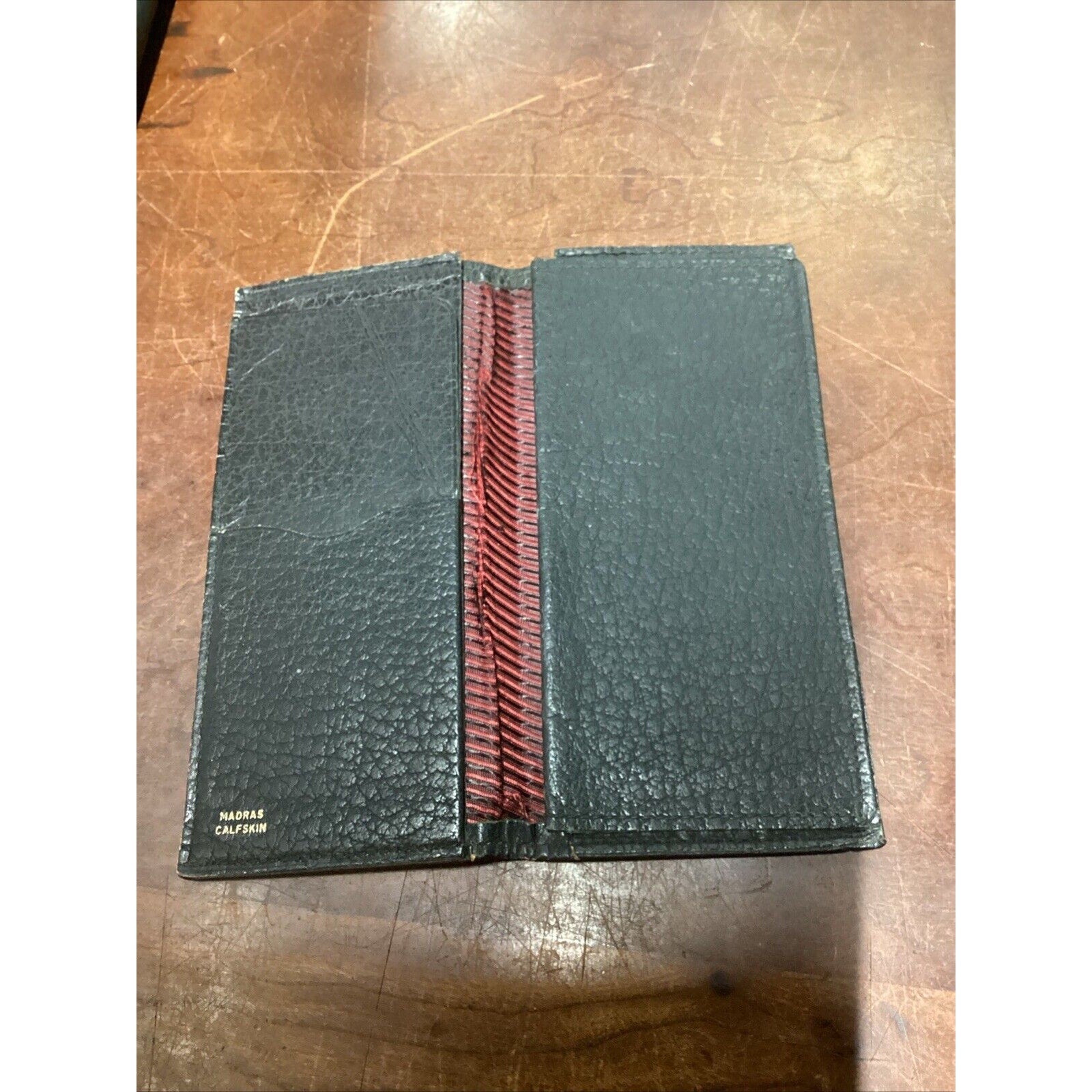2. Black madras calfskin wallet. Has 4 interior pockets. Could be used as a checkbook holder too I think. The edges are worn a bit. Measures 7x3.5”