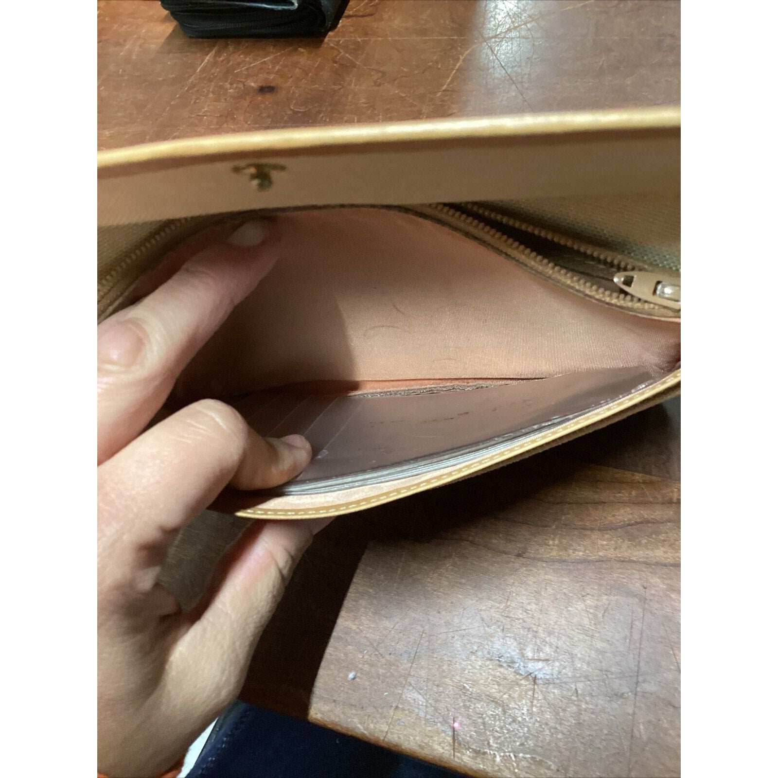 7. Tan leather coin purse with 3 pockets. The back layer of this has come apart. Will need to be glued or re-sown. Is still very much useable if you take the back part off. Has strap. Measures 4x4”