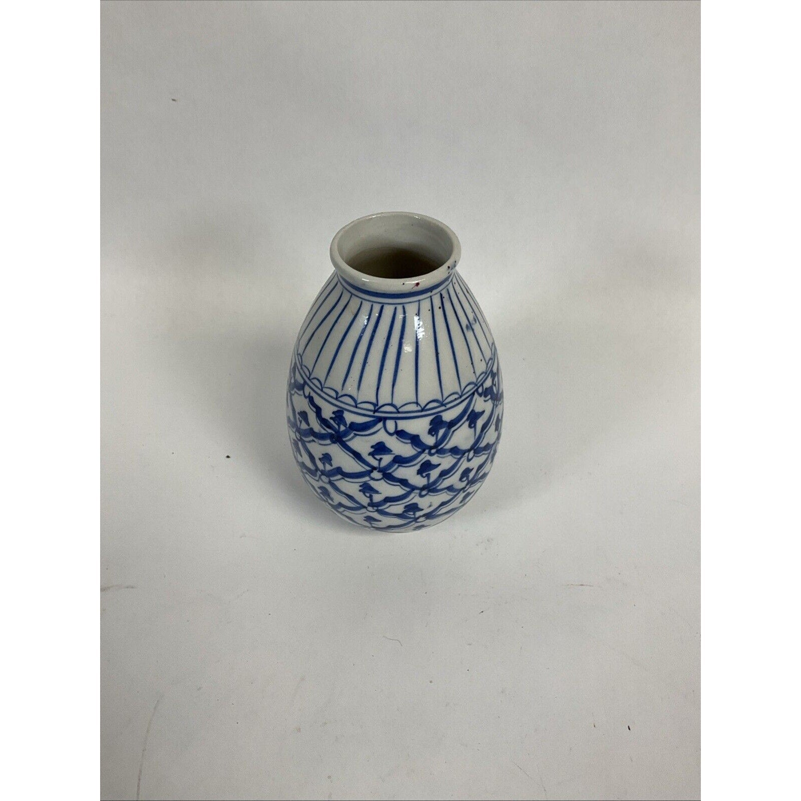 Vintage Cobalt Blue and White Vase With Flowers With Swirls Diamonds 5-1/2"H